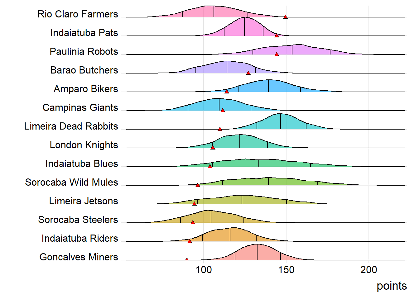Sorocaba Wild Mules was projected to win by the widest margin this week (12.45 points). Not only did they lose to Rio Claro Farmers, but they lost by a bigger margin (52.94 points) than they were projected to win by.