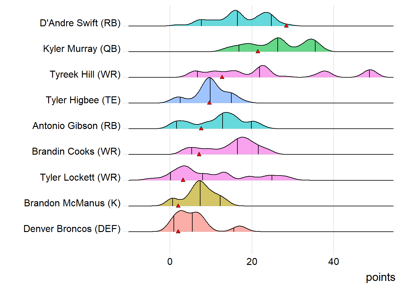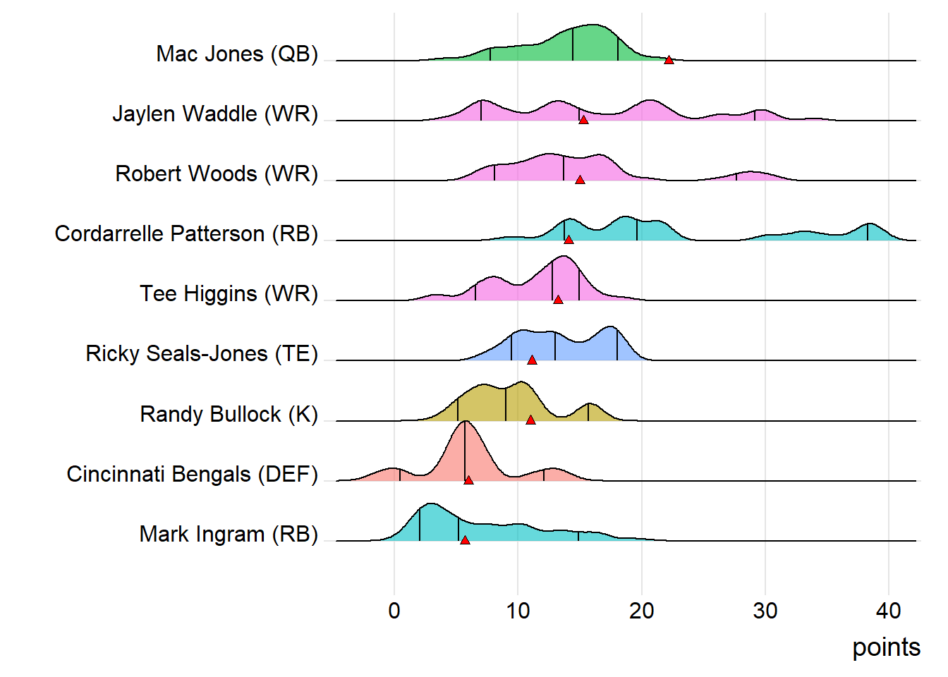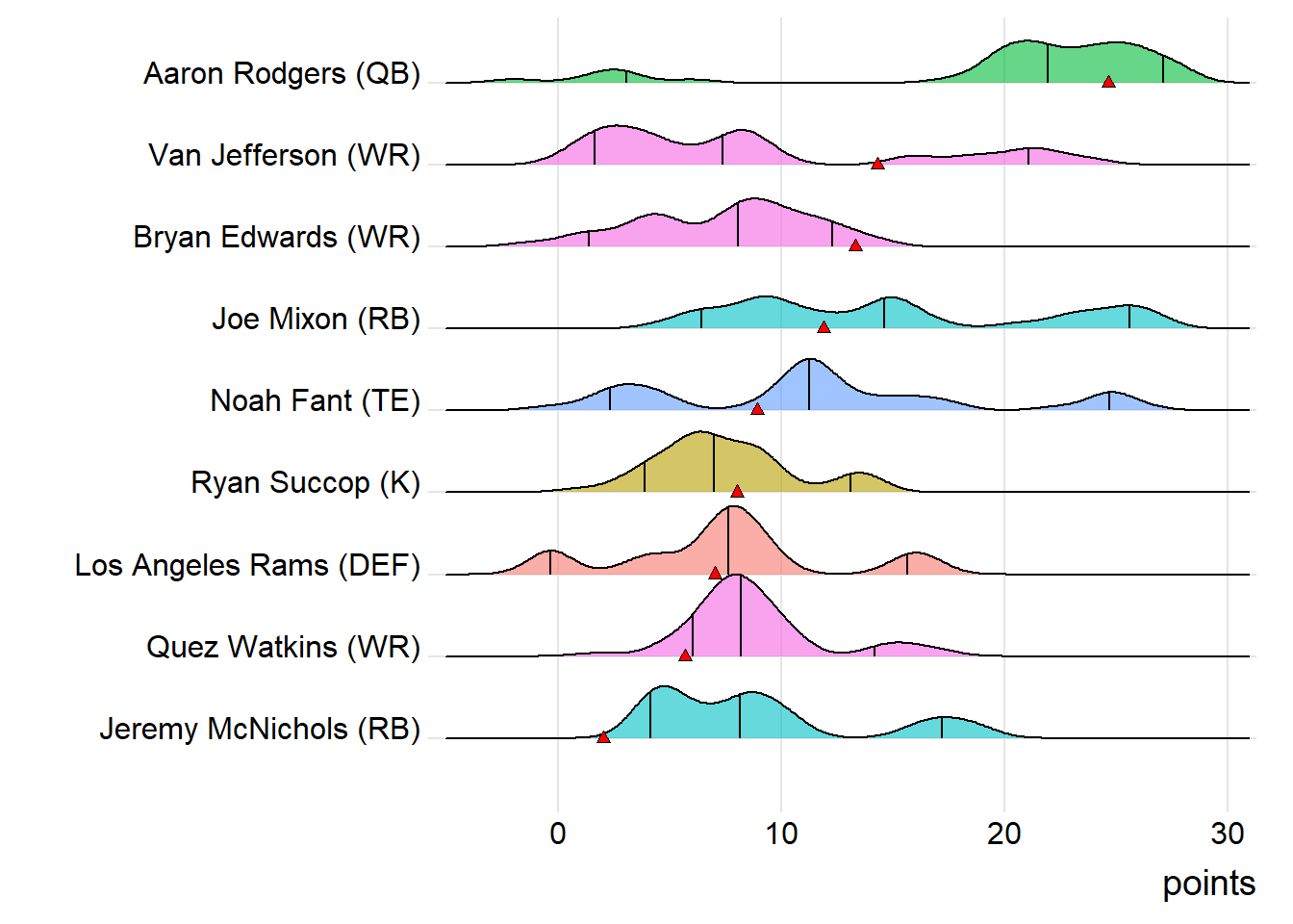 While Mike Williams led Limeira Jetsons in Week 5 (with 36.50 points) and Joe Mixon last week (26.30 points), Rodgers has now been the team’s top point-getter twice in the last four weeks. Also, with 21 touches this week for D’Andre Swift, it means that his touches have now increased in three consecutive games.