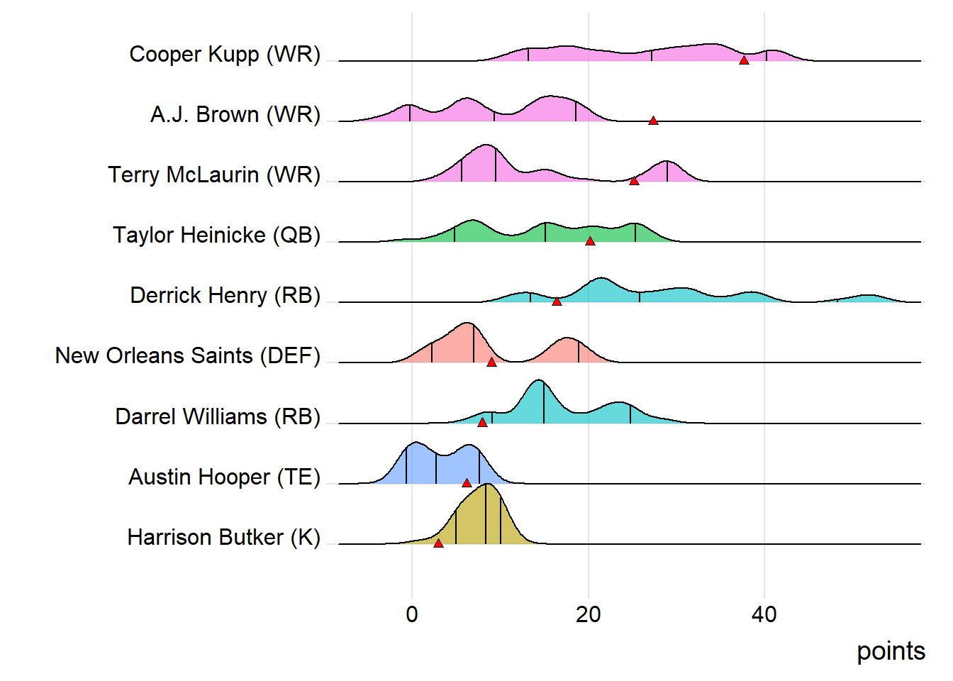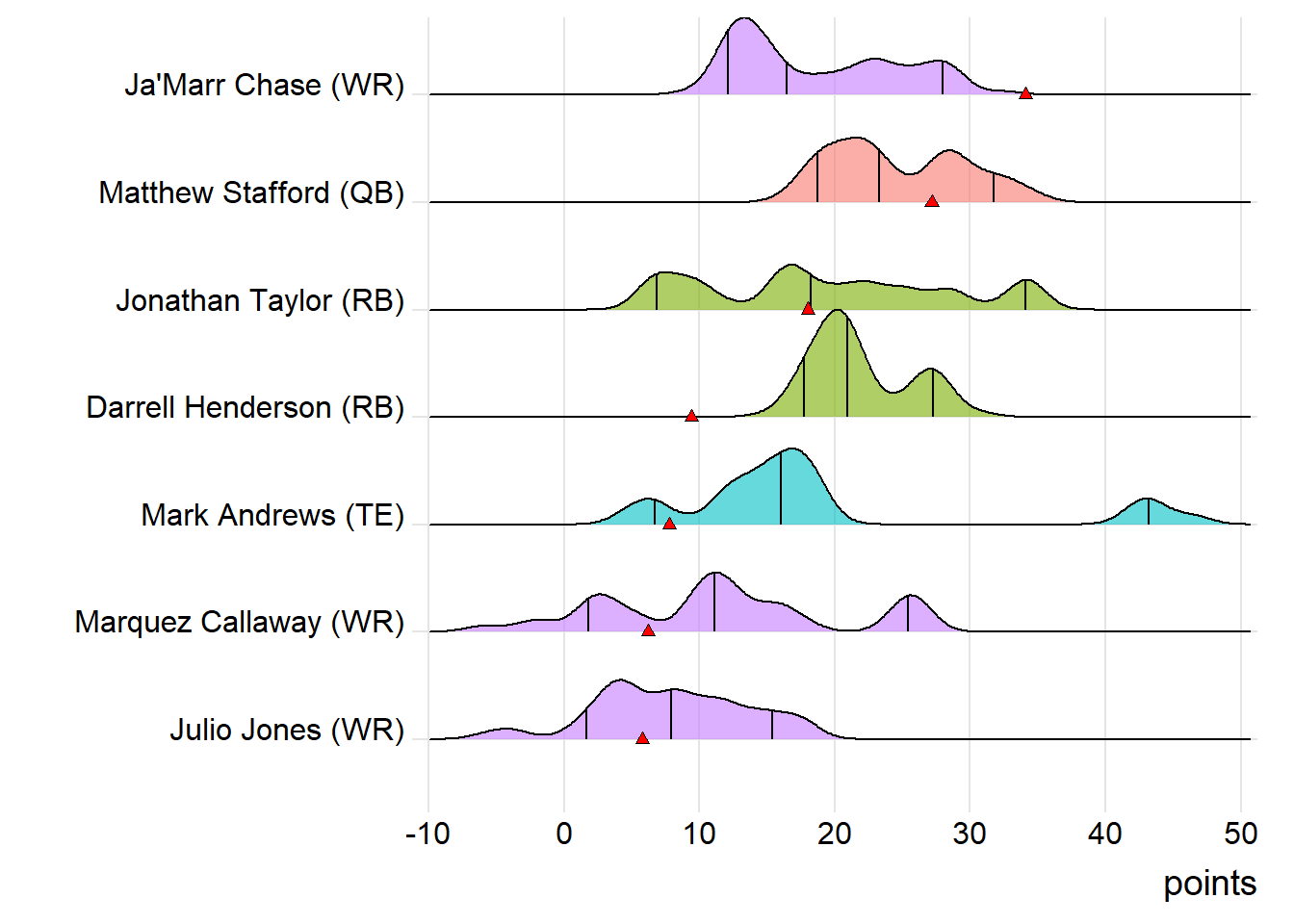 Indaiatuba Blues was on another level with their wideouts, as they started two of the league’s top-10 overall WRs this week (including Kupp, who was best overall). It wasn’t all bad news for London Knights, as they did field a squad of real-life winners. Every starter except Mark Andrews suited up on an NFL team that won in Week 7. While Derrick Henry led Indaiatuba Blues with 35.60 points in Week 6, Kupp paced the squad this week with 37.60.