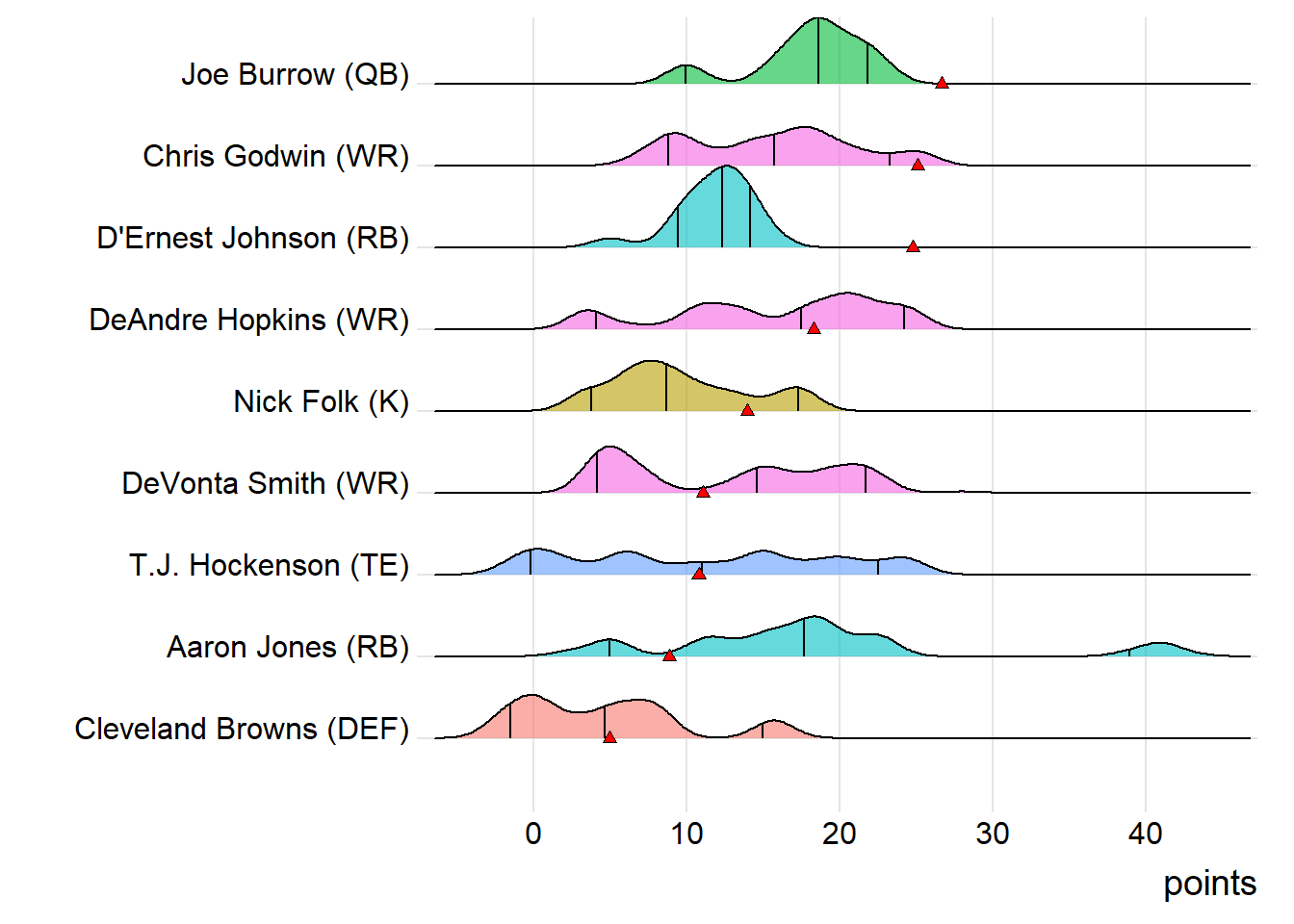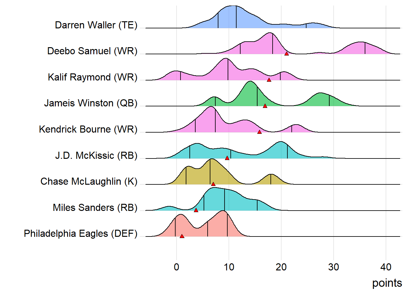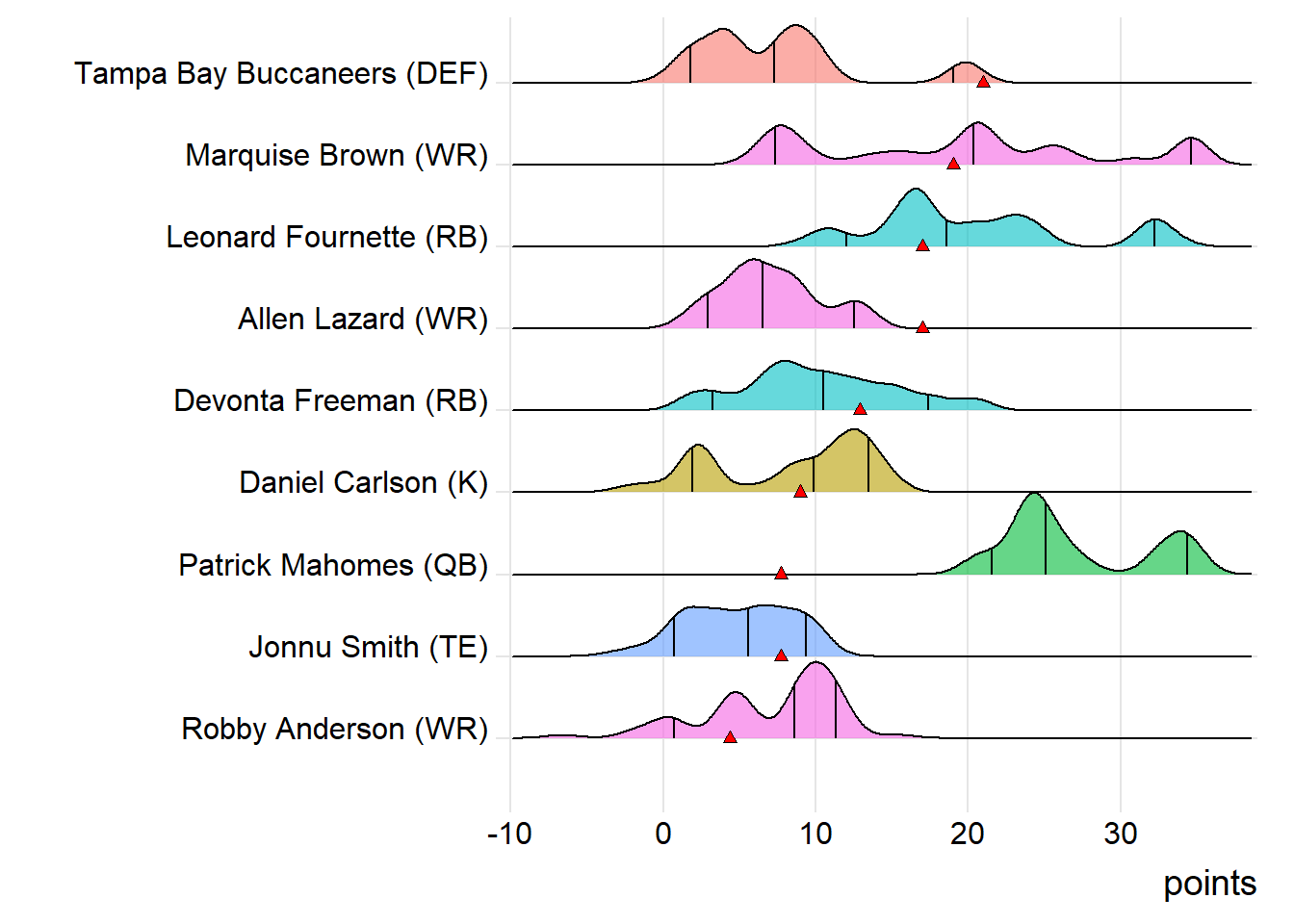 Since Evans was the top point-getter for Rio Claro Farmers, it means a different player has led the team in each of the last four weeks. With 29.02 points, Matt Ryan paced the squad in Week 4, while Davante Adams (37.60 points) was tops in Week 5 and Carson Wentz (17.02 points) last week.