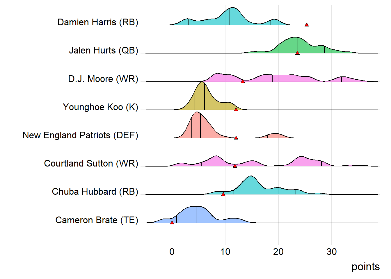 Since Harris was the top point-getter for Limeira Dead Rabbits, it means a different player has led the team in each of the last four weeks. With 31.90 points, D.J. Moore paced the squad in Week 4, while Austin Ekeler (32.90 points) was tops in Week 5 and CeeDee Lamb (36.10 points) last week.