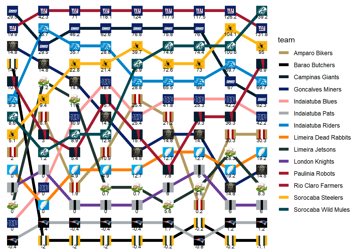 | Limeira Dead Rabbits | 68.88 | 49.18 | 38.74 | 38.48 | 27.62 | 29.94 | 25.30 | 17.80 | 47.18 | 28.00 |
