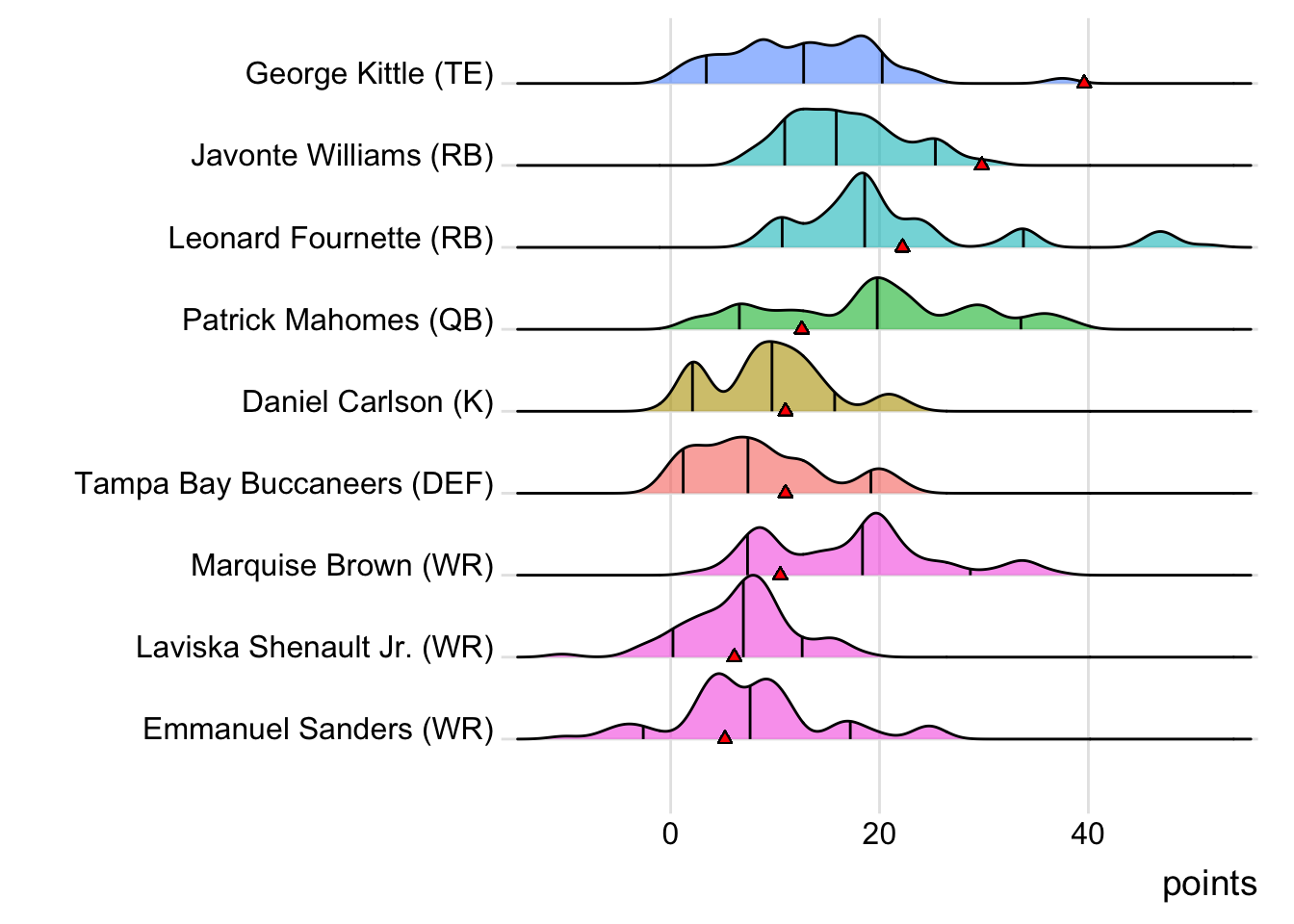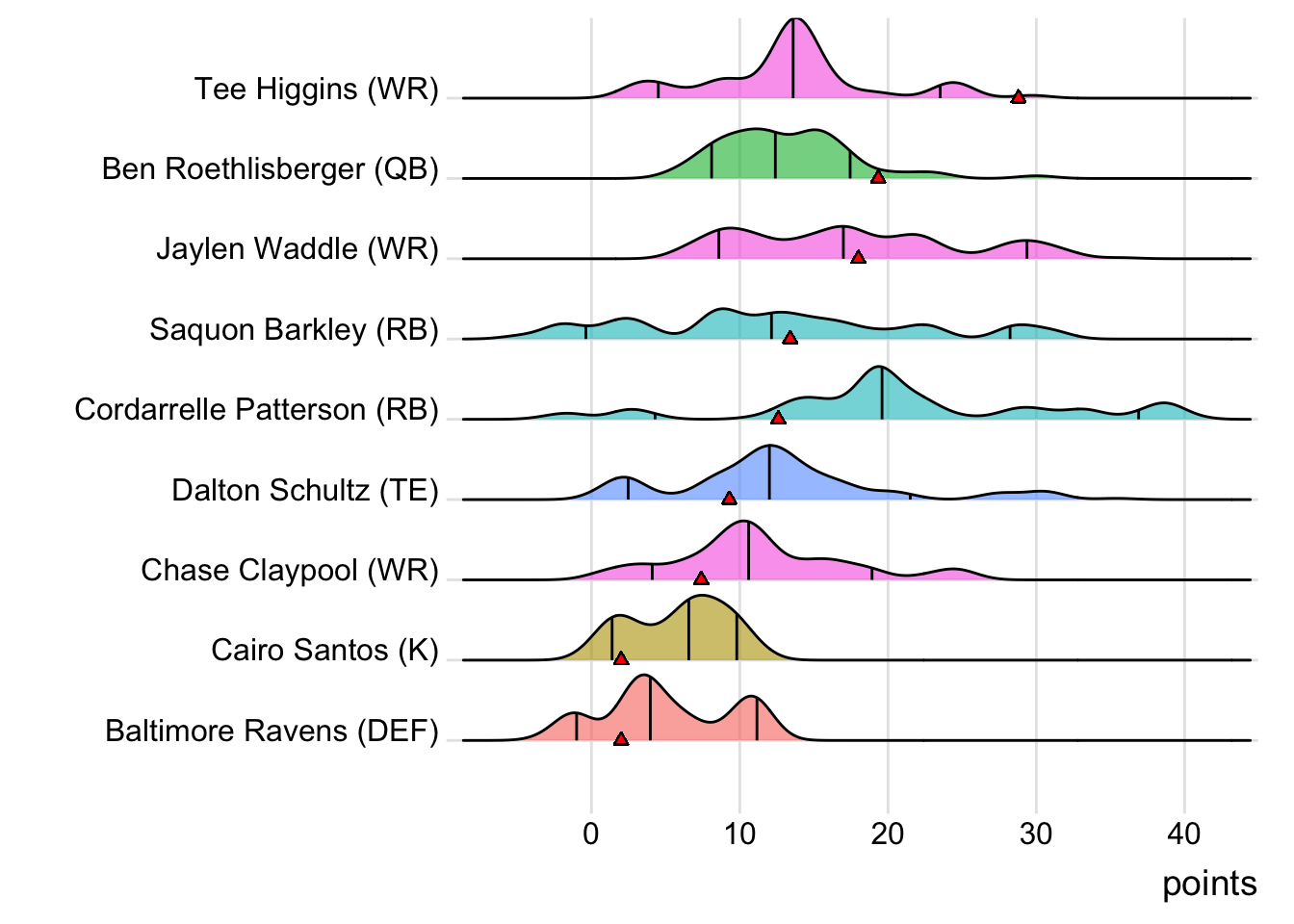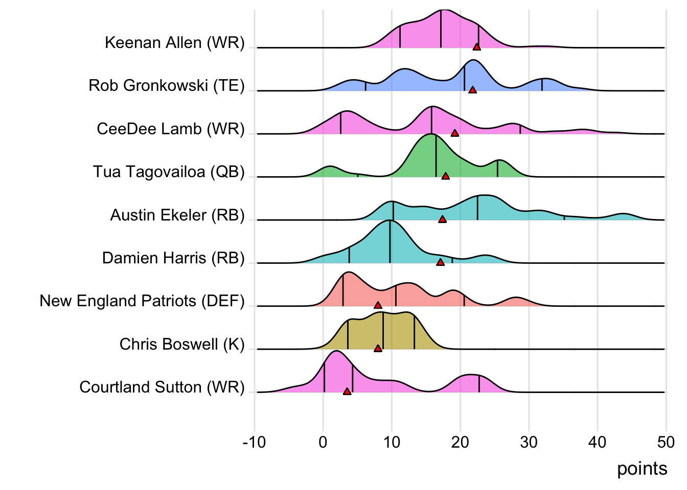 Since Kittle was the leading point-getter for Indaiatuba Riders, it means a different player has now topped the team in each of the past five weeks. With 20.60 points, Marquise Brown paced the squad in Week 9, while Patrick Mahomes put up 36.24 points to lead the way in Week 10. Dalvin Cook (22.50 points) was tops in Week 11 and Leonard Fournette (44.10 points) led in Week 12. It wasn’t all bad news for Limeira Dead Rabbits, as they did field a team of real-life winners. Every starter except Courtland Sutton suited up for an NFL team that won in Week 13. Also, with 19 touches this week for Austin Ekeler, it means that his touches have now increased in three consecutive games.
