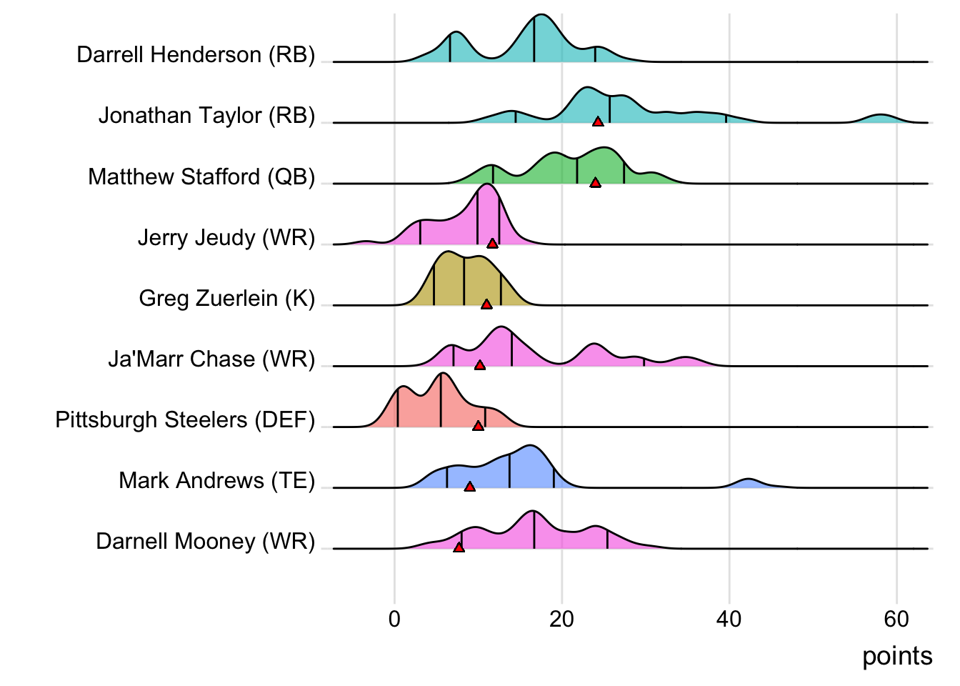 Jonathan Taylor scored two touchdowns (24.30 points) and Matthew Stafford threw for three touchdowns (24.00 points) as London Knights defeated Limeira Jetsons 107.90 to 92.50. London Knights took an 11.00-point lead on Thursday and maintained an advantage throughout the matchup. London Knights finally manages a victory against Limeira Jetsons after losing the first three games of the series. Both teams could have scored more points as London Knights had one starter turn in zero points and Limeira Jetsons also had one. Limeira Jetsons (8-5, 1,415.06 points) drops to third place and earns a spot in the playoffs despite the loss. London Knights (5-8, 1,542.68 points) remains in 12th place.