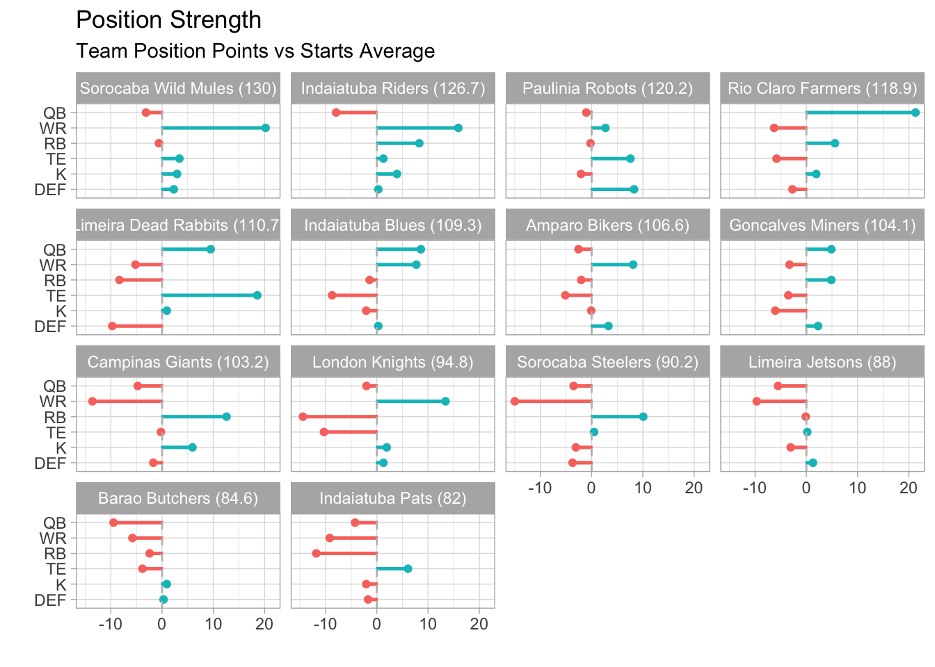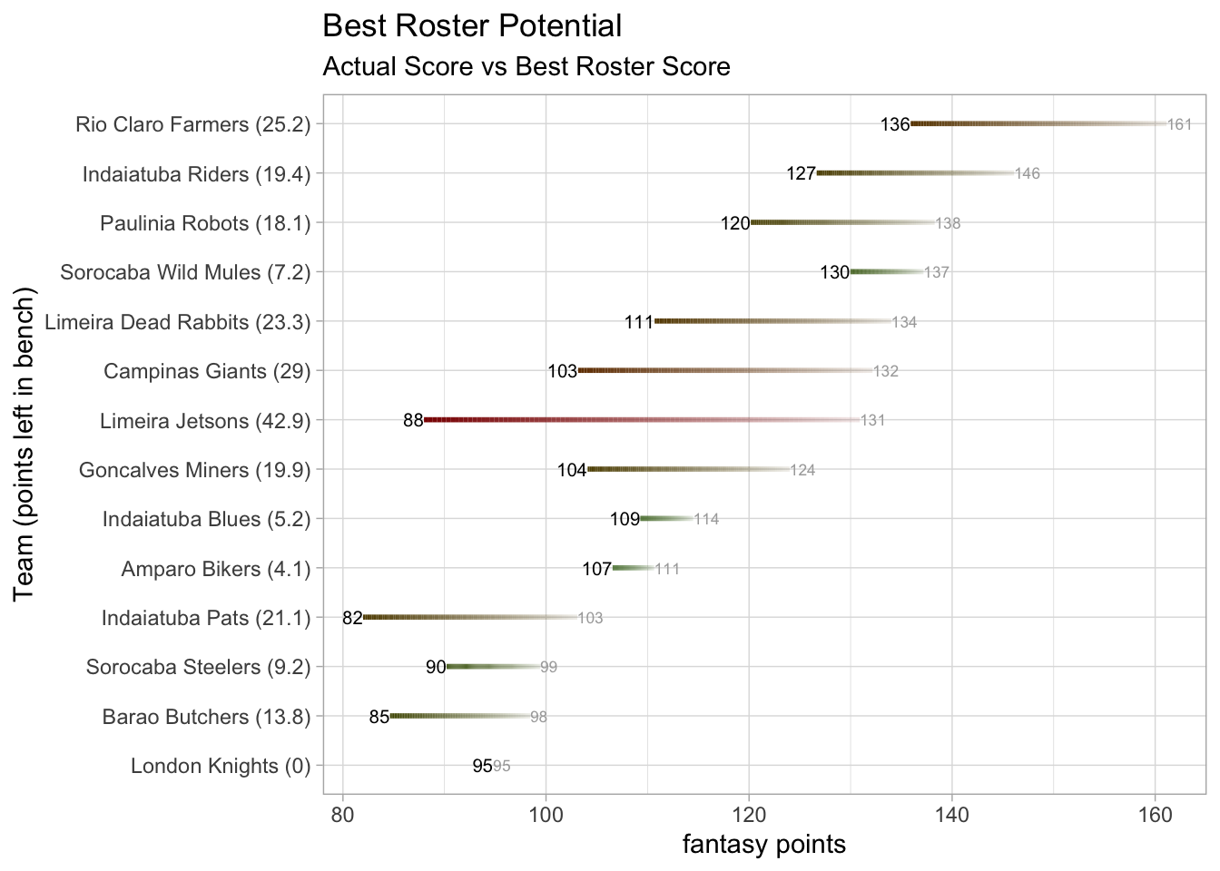 Sorocaba Wild Mules beat their projections by a higher percentage than anyone else in the league this week. They put up 129.98 points when they were only projected 83.46.