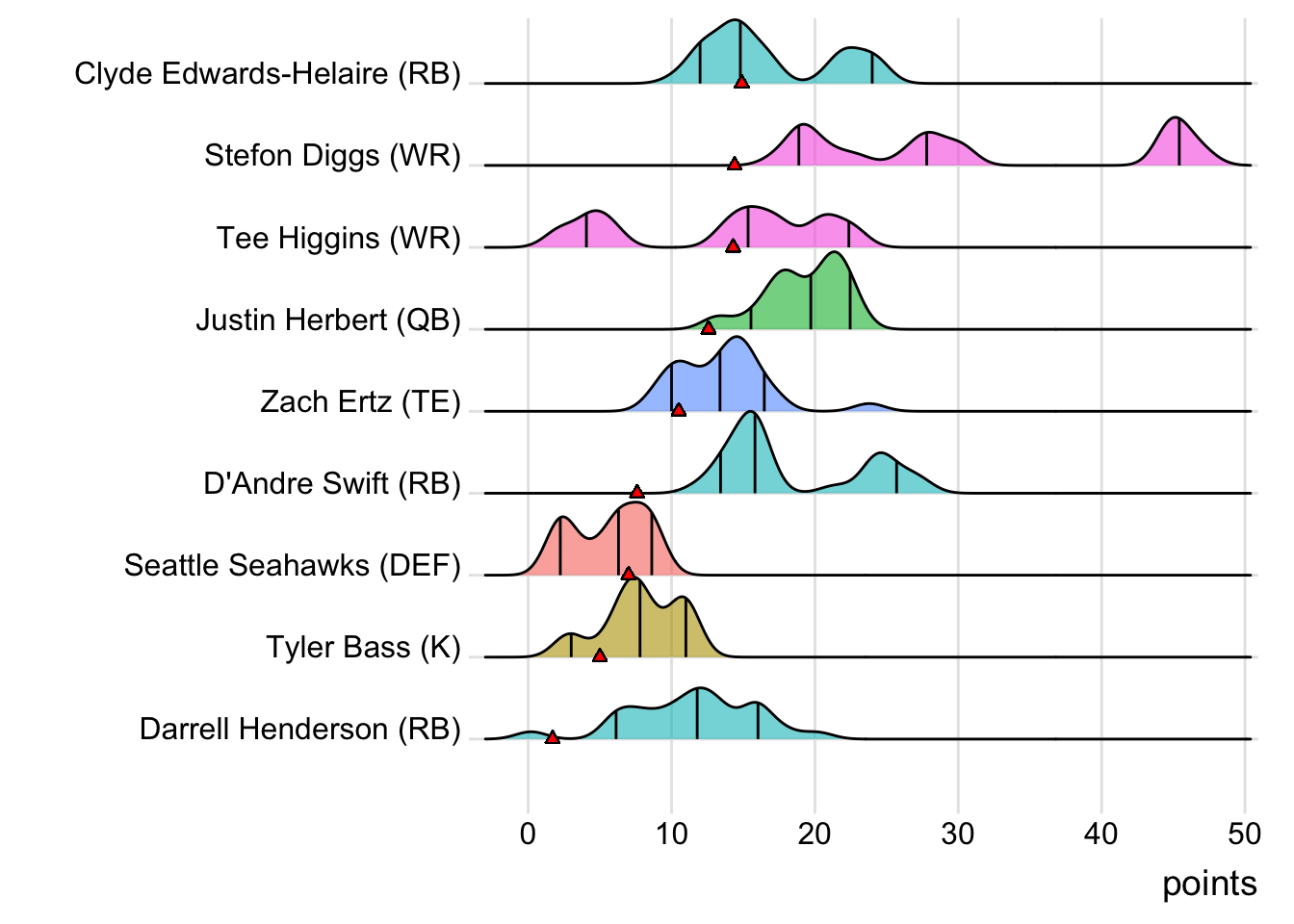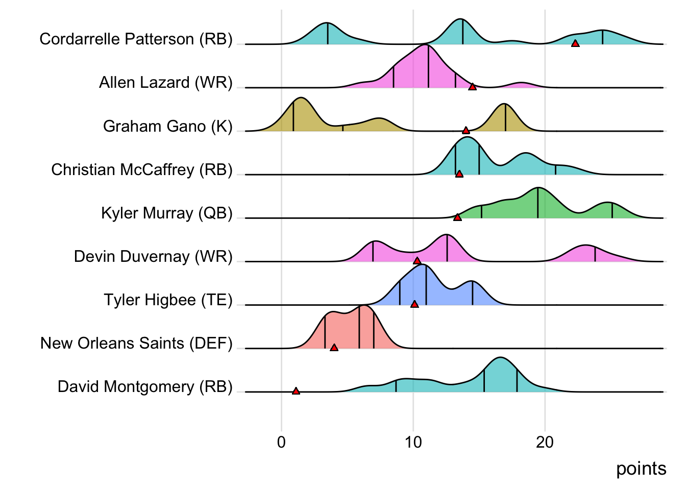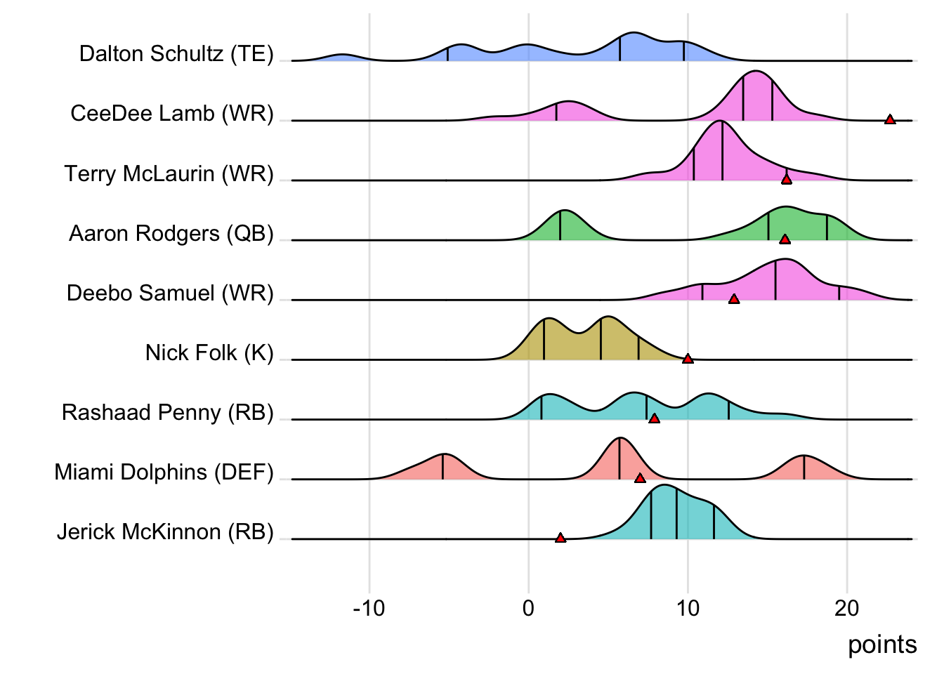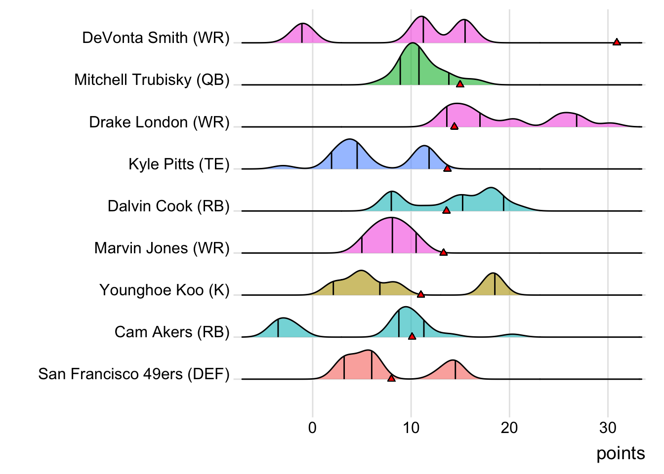 Players drafted in the first round averaged 13.95 points this week. Second-round players averaged 11.75, and were actually outperformed by the third-rounders (12.82).