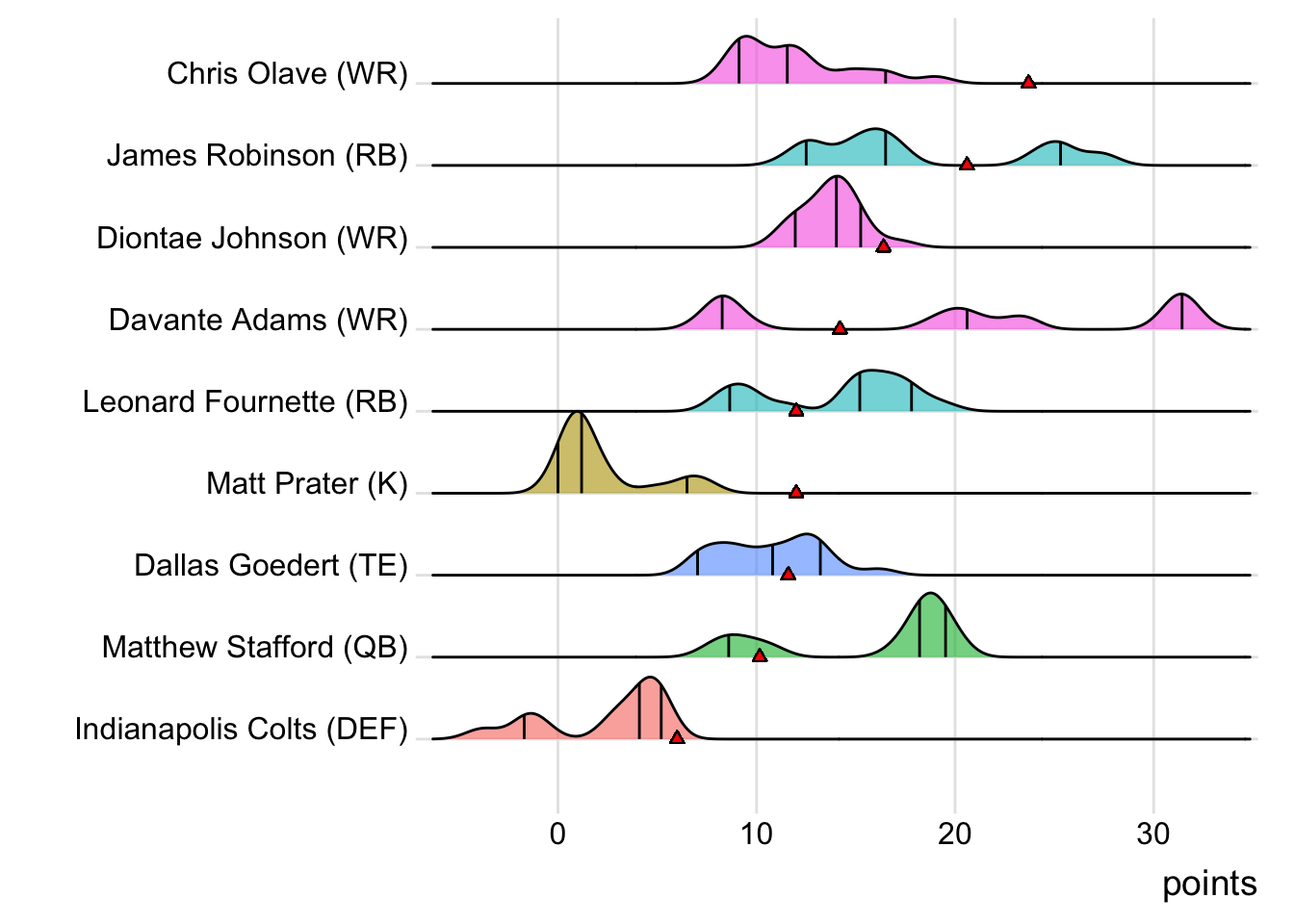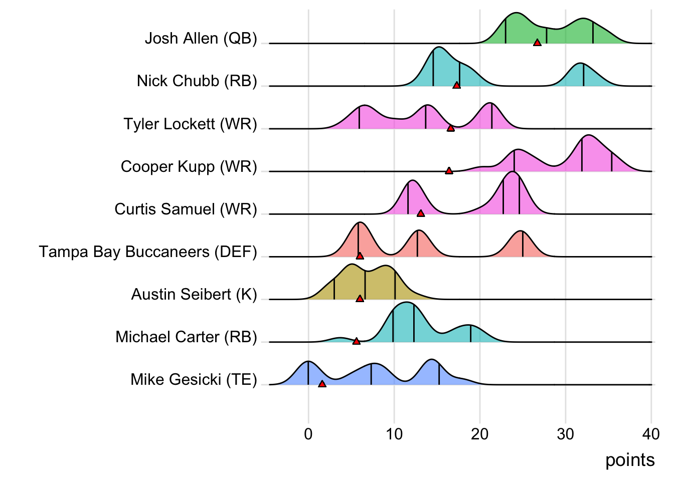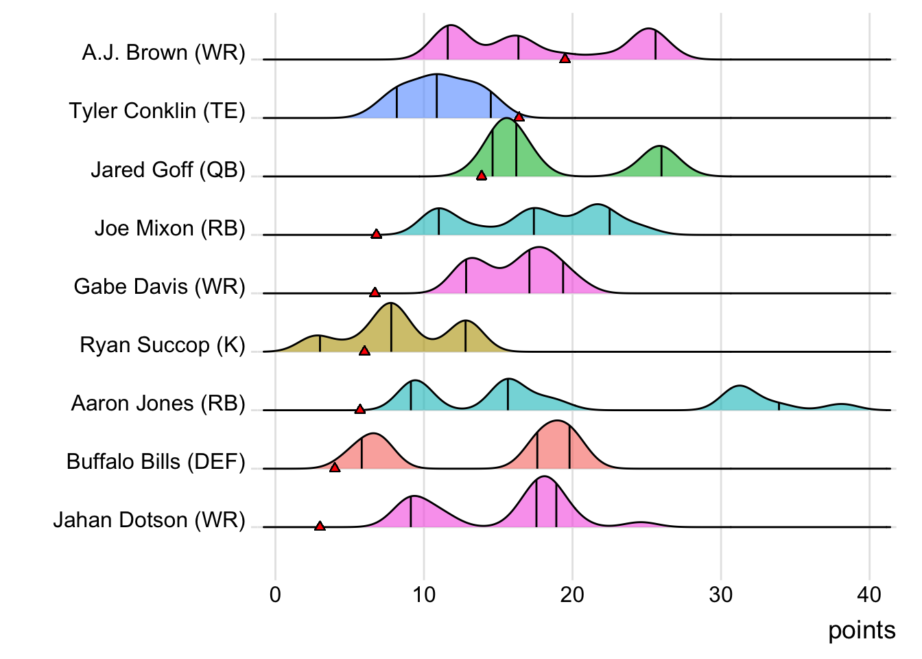 Players drafted in the first round averaged 13.95 points this week. Second-round players averaged 11.75, and were actually outperformed by the third-rounders (12.82).