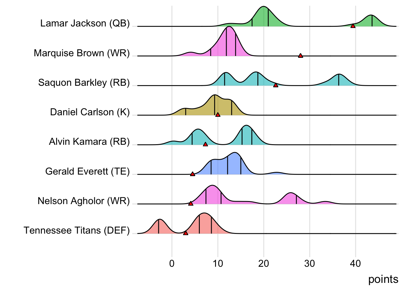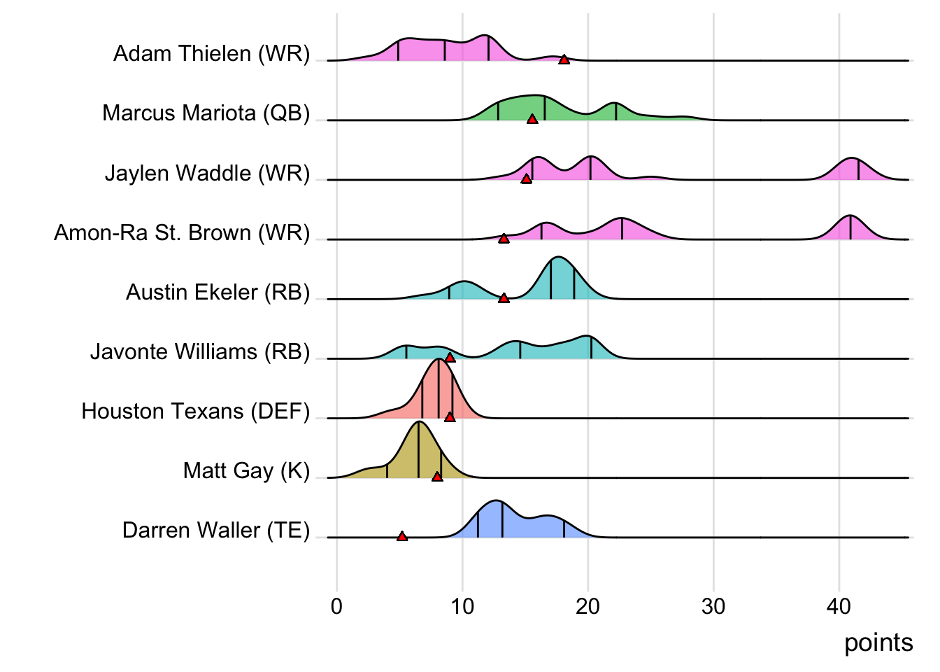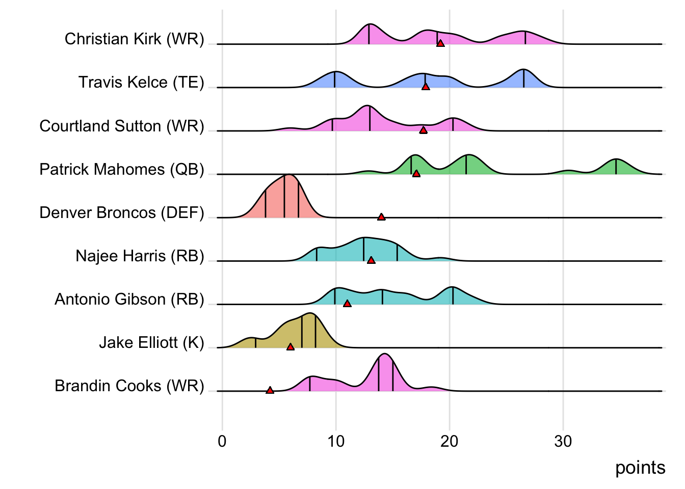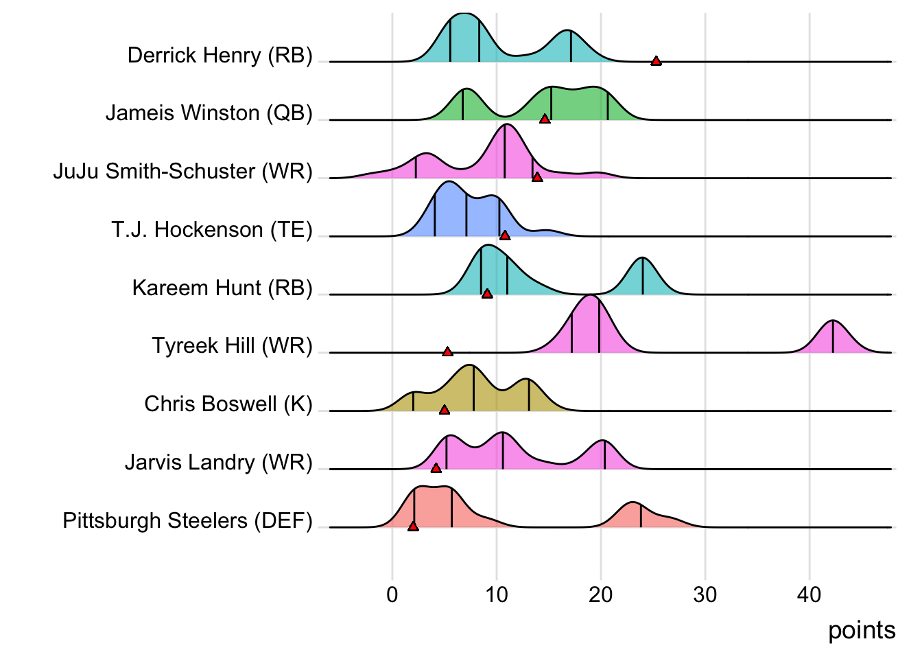 Players drafted in the first round averaged 13.95 points this week. Second-round players averaged 11.75, and were actually outperformed by the third-rounders (12.82).