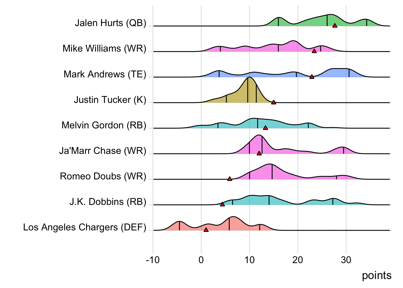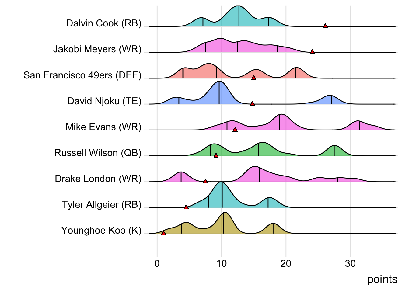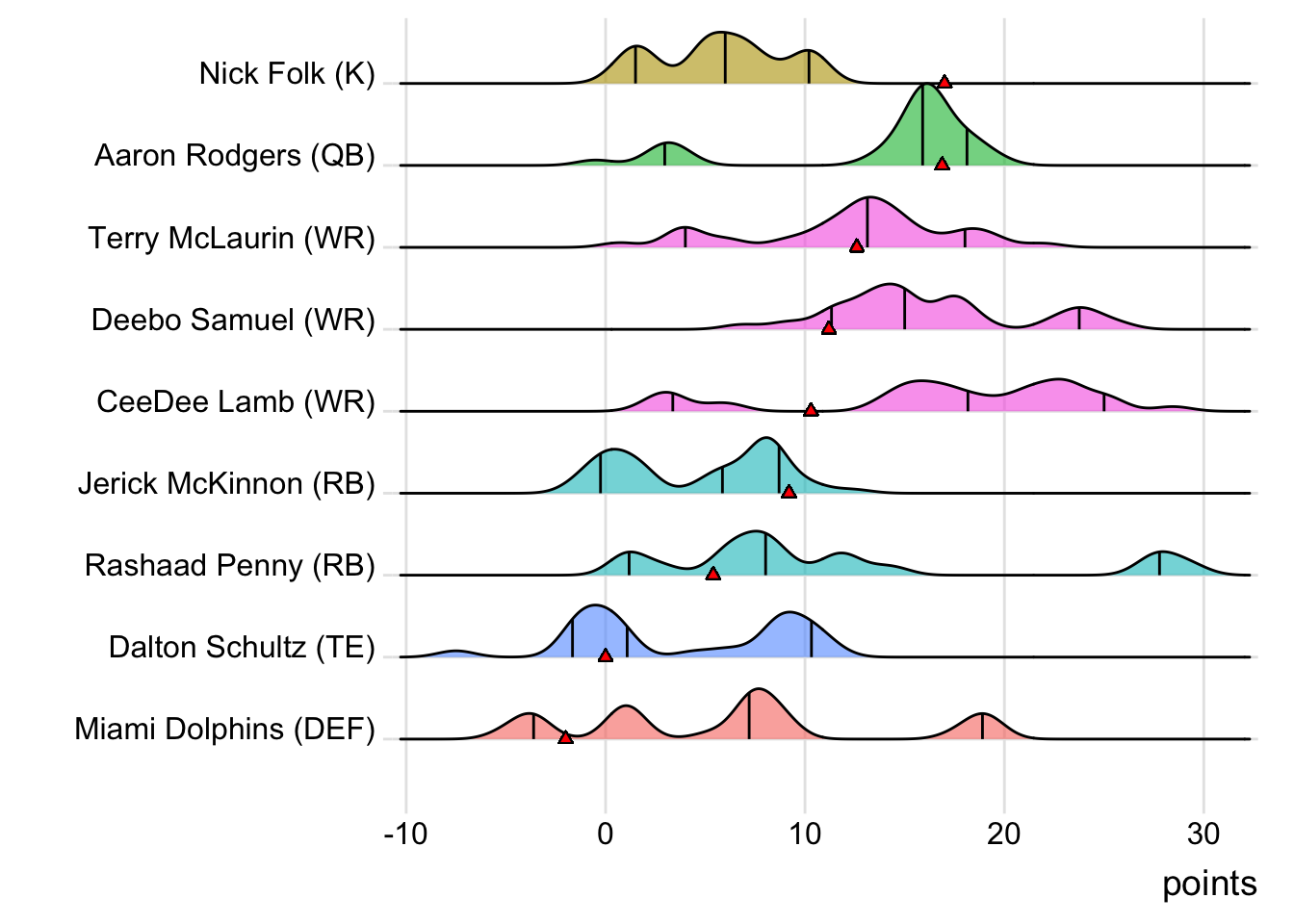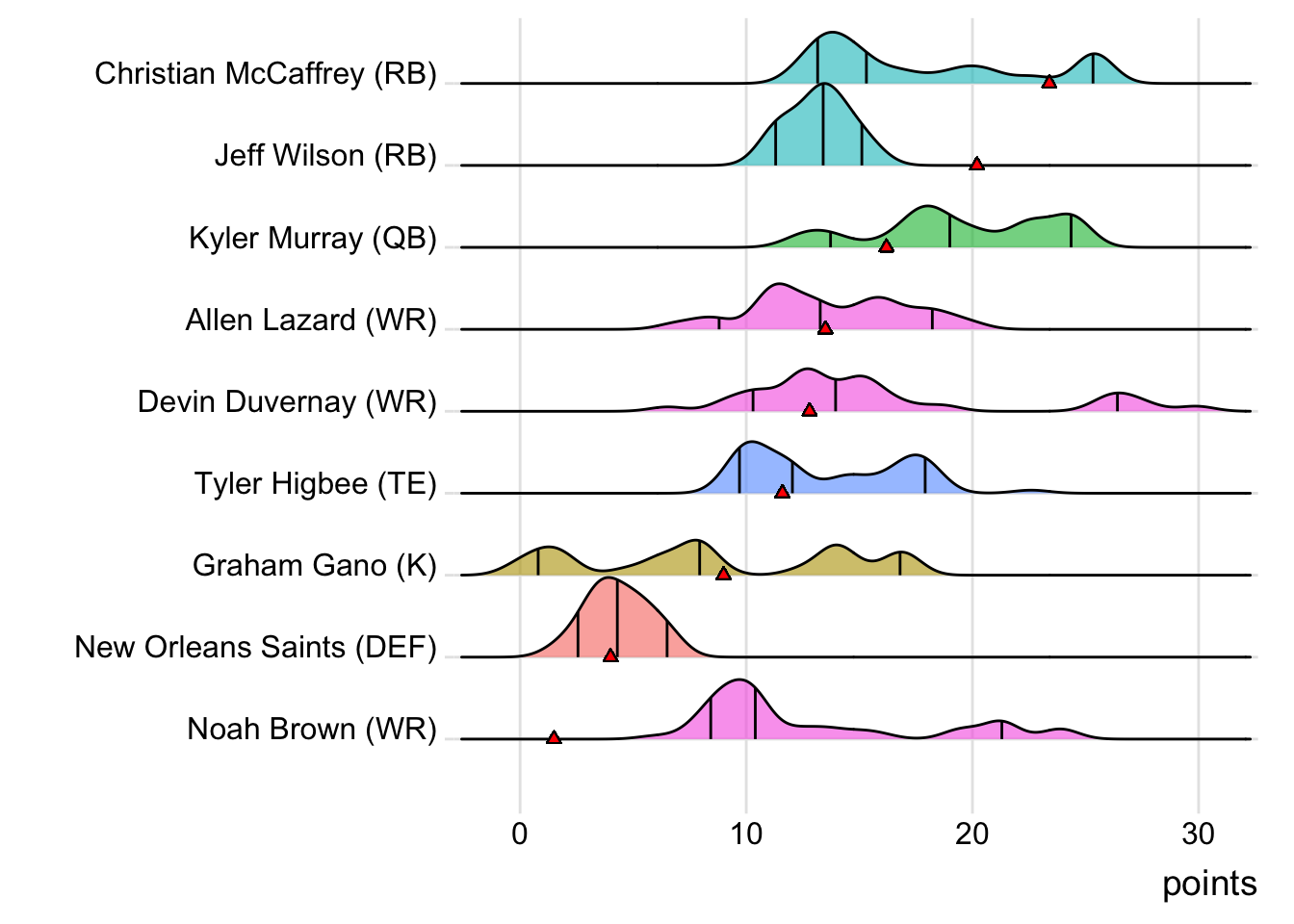 Along with being the one defense to earn a negative score, the Miami Dolphins DEF (on London Knights) represented the lone starter in the whole league to do so. In addition, they had a starter that missed out on some chances. Despite being targeted nine times, Deebo Samuel could only manage two catches.