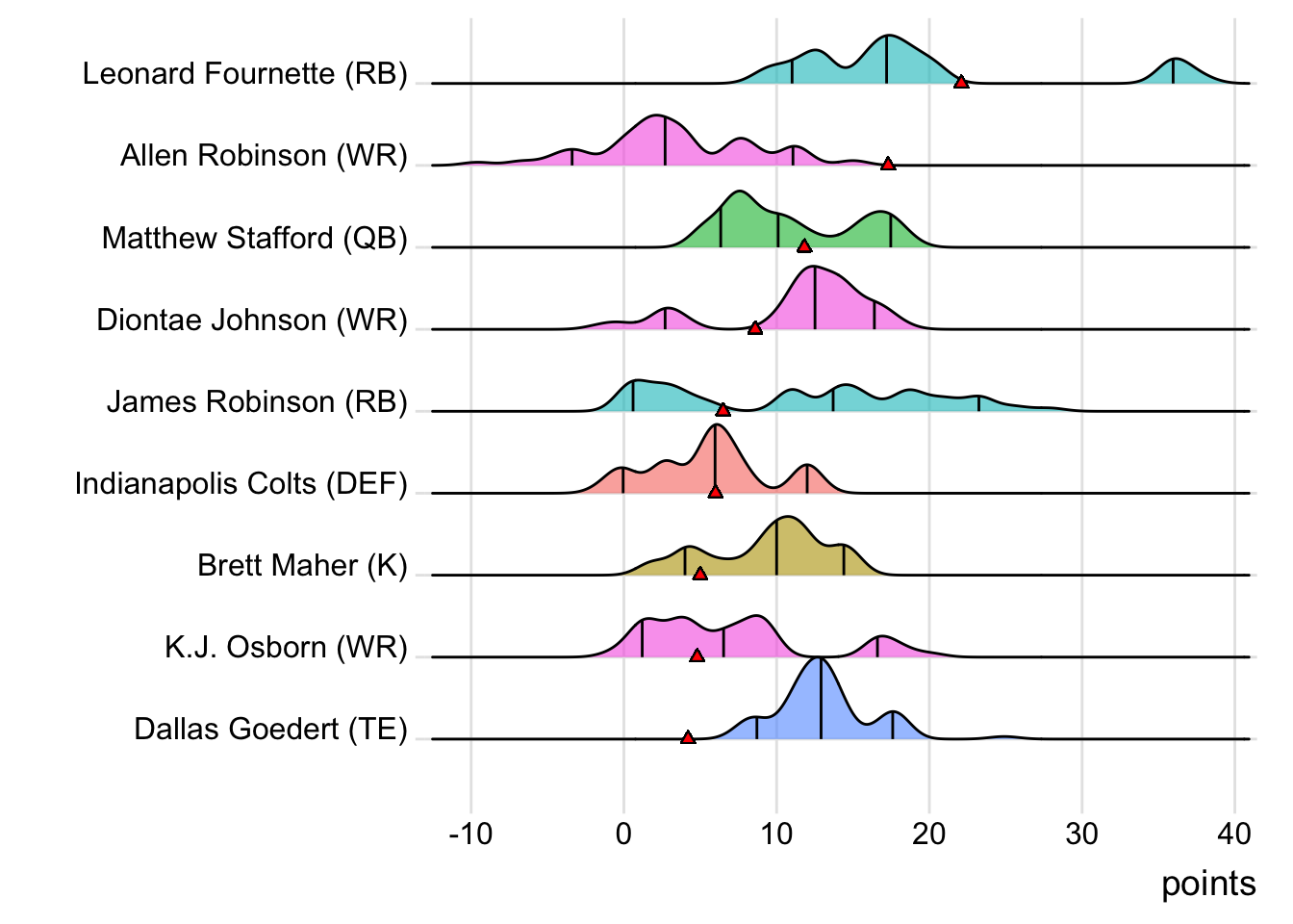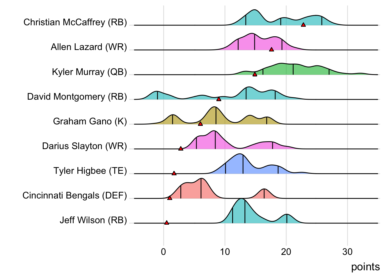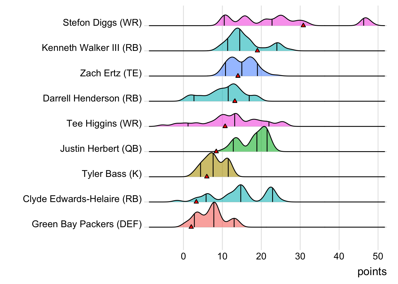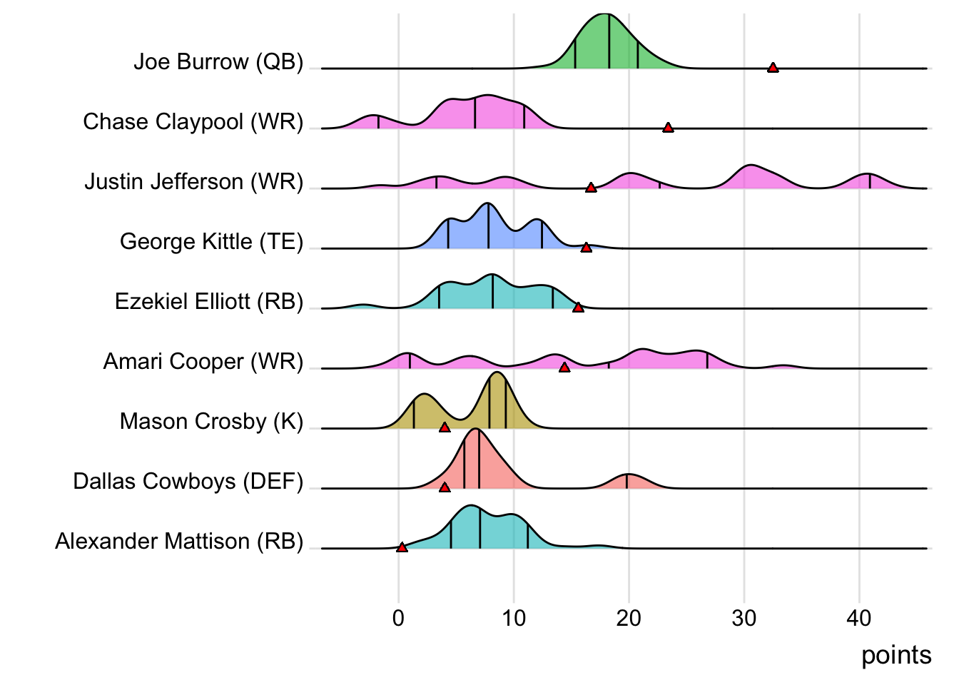 Since Burrow was the top point-getter for Goncalves Miners, it means a different player has led the team in each of the last four weeks. With 23.10 points, Amari Cooper paced the squad in Week 3, while Josh Jacobs (34.50 points) was tops in Week 4 and Justin Jefferson (30.32 points) in Week 5. Also, with 24 touches this week for Austin Ekeler, it means that his touches have now increased in three consecutive games.