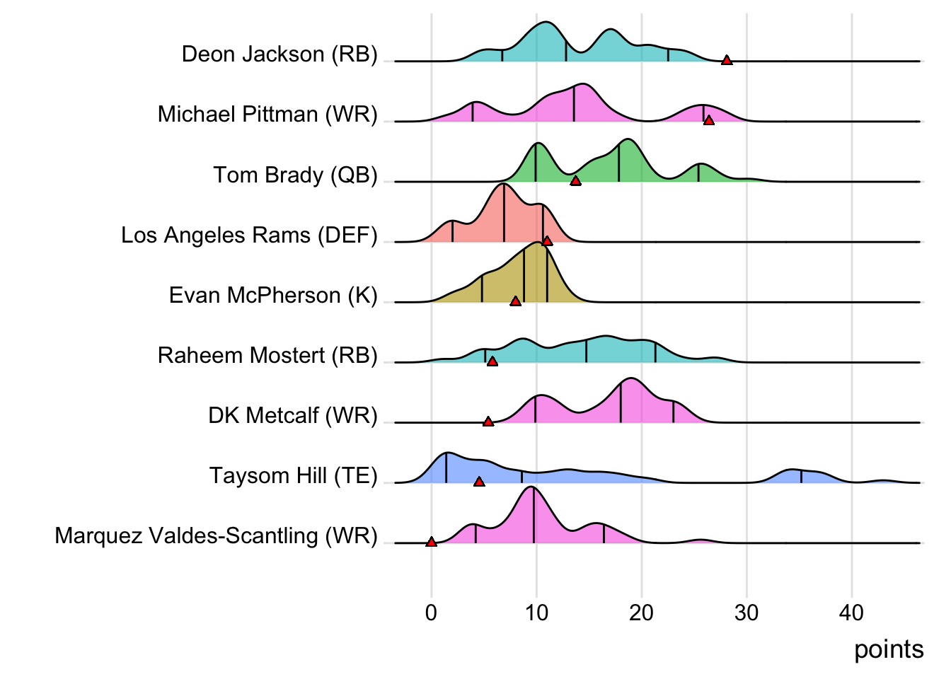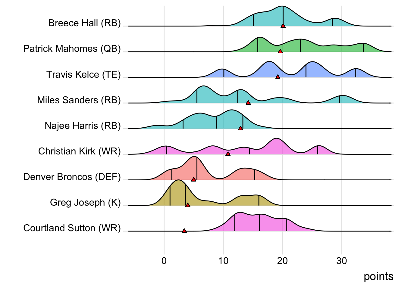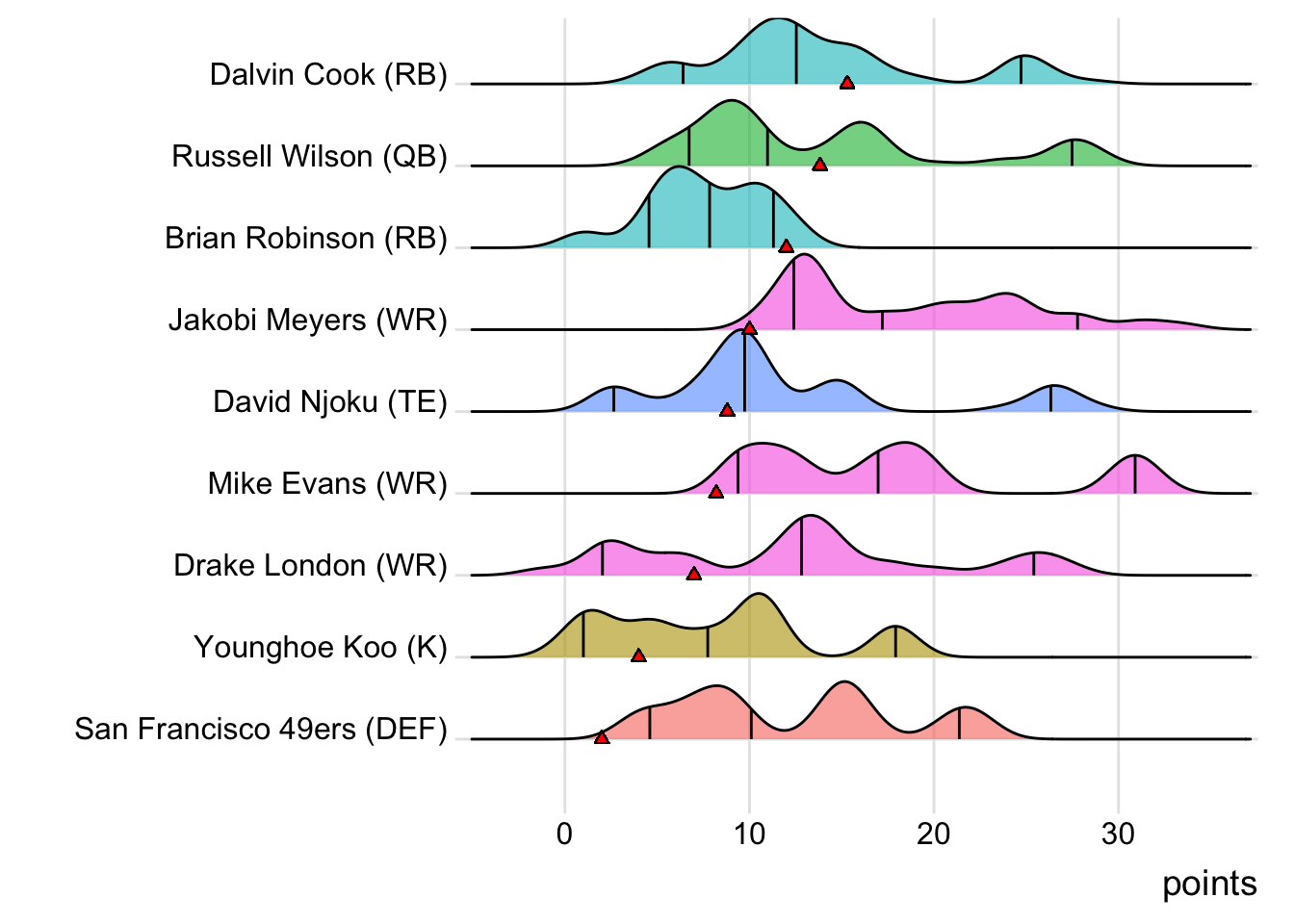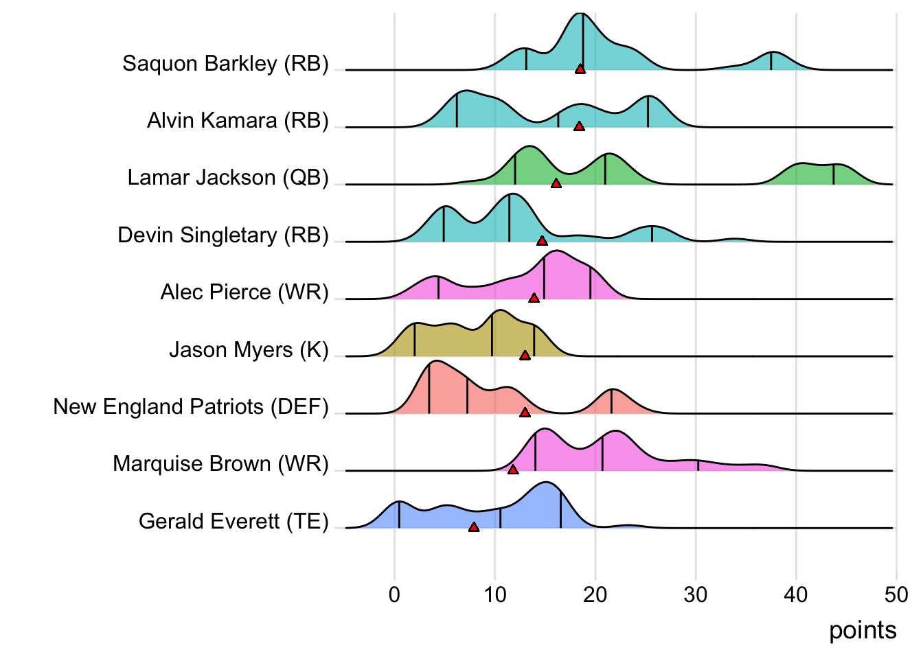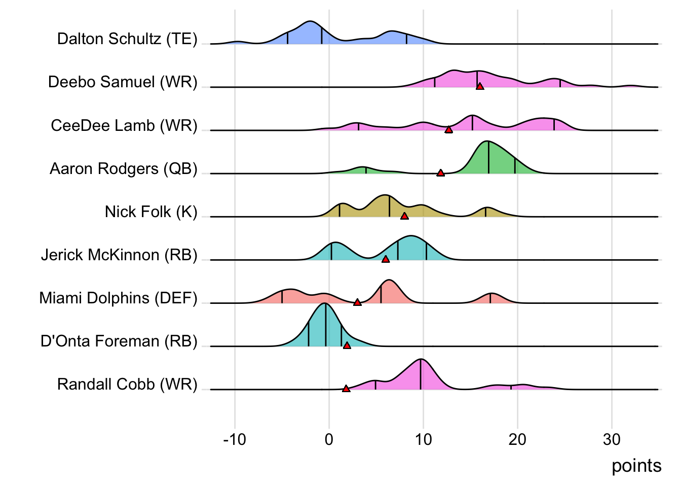 Since Burrow was the top point-getter for Goncalves Miners, it means a different player has led the team in each of the last four weeks. With 23.10 points, Amari Cooper paced the squad in Week 3, while Josh Jacobs (34.50 points) was tops in Week 4 and Justin Jefferson (30.32 points) in Week 5. Also, with 24 touches this week for Austin Ekeler, it means that his touches have now increased in three consecutive games.