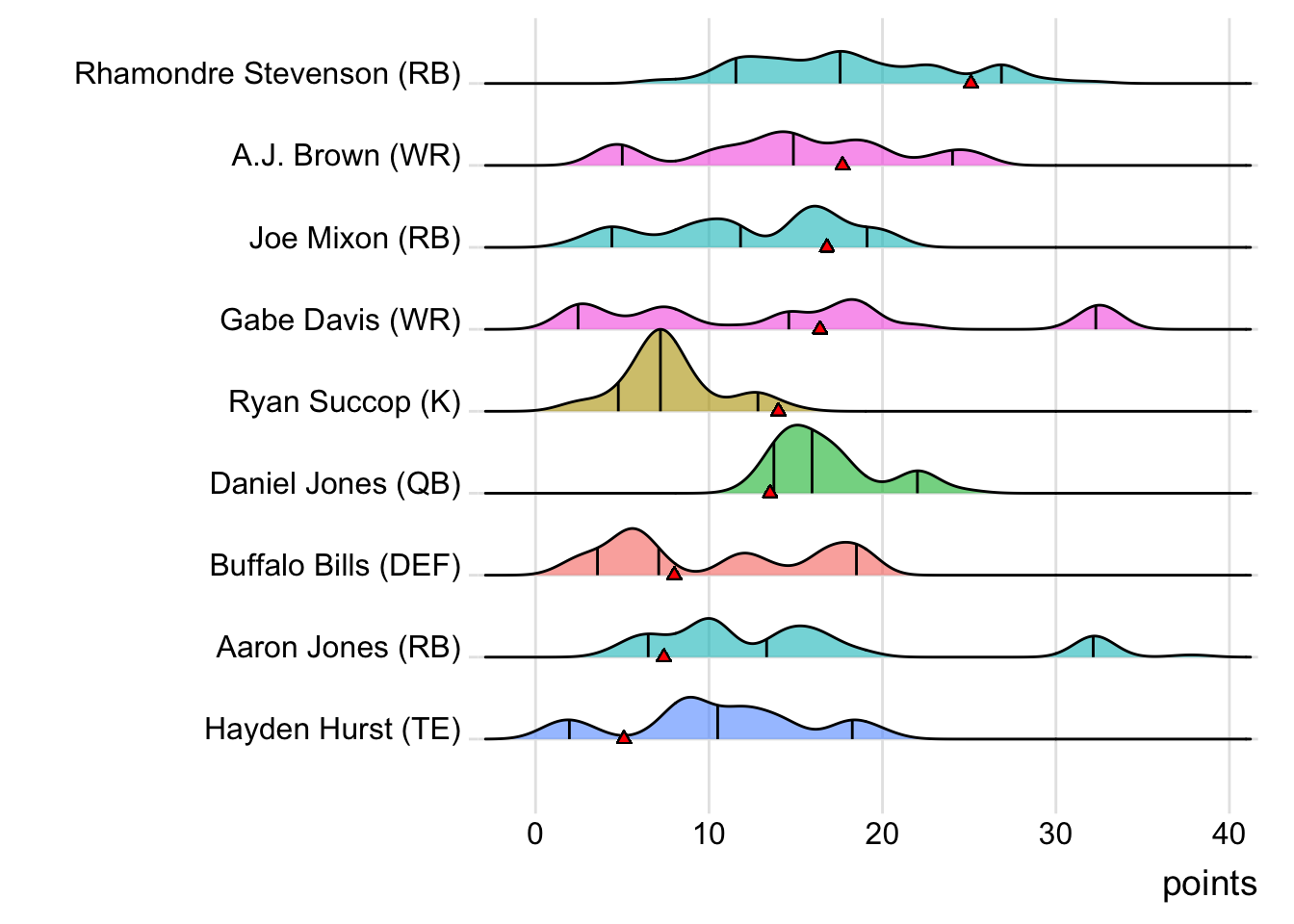 Since Stevenson was the leading point-getter for Indaiatuba Pats, it means a different player has now topped the team in each of the past five weeks. With 32.00 points, Aaron Jones paced the squad in Week 2, while A.J. Brown put up 19.50 points to lead the way in Week 3. Jared Goff (33.22 points) was tops in Week 4 and Gabe Davis (32.10 points) led last week.