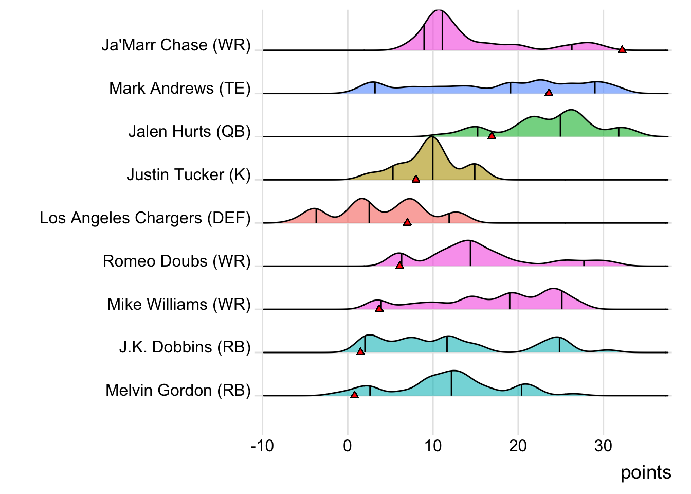 Since Chase was the top point-getter for Limeira Dead Rabbits, it means a different player has led the team in each of the last four weeks. With 28.90 points, Mark Andrews paced the squad in Week 3, while J.K. Dobbins (22.30 points) was tops in Week 4 and Jalen Hurts (27.66 points) last week.