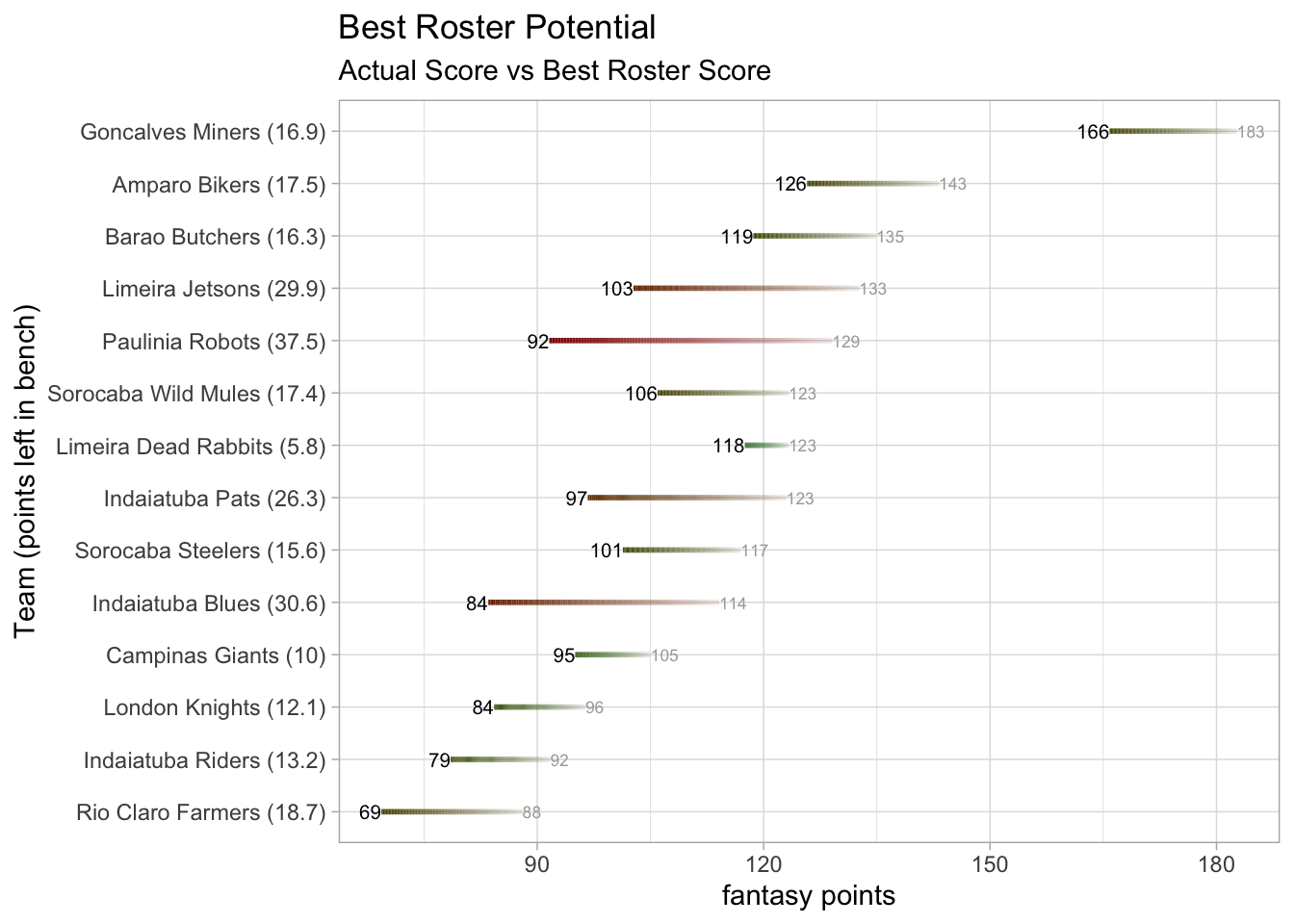 Led by the trio of Josh Jacobs, Justin Jefferson, and DeAndre Hopkins, Goncalves Miners overwhelmed Indaiatuba Riders 165.84 to 78.54. Combining for 96.34 points, that threesome alone surpassed the total of Indaiatuba Riders. Jacobs rushed for 229 yards, registering 48.30 points (229 Rsh Yds, 74 Rec Yds, 2 TD). Jefferson also put up 29.34 points (139 Rec Yds, 1 TD), while Hopkins chipped in 18.70 points (87 Rec Yds, 1 TD). Jacobs also recorded the second-highest point total in the league this season, with Jefferson tallying the highest point total of the week at his position. Goncalves Miners had the best score of the week, while also recording the biggest margin of victory in the league this season. To make matters worse, Indaiatuba Riders had a starter score zero points (Leonard Fournette). With the win, Goncalves Miners moves to 10-2 (1,520.96) and clinches a playoff spot. Goncalves Miners (10-2, 1,520.96 points) climbs into first place, while Indaiatuba Riders (6-6, 1,334.34 points) drops to eighth place.