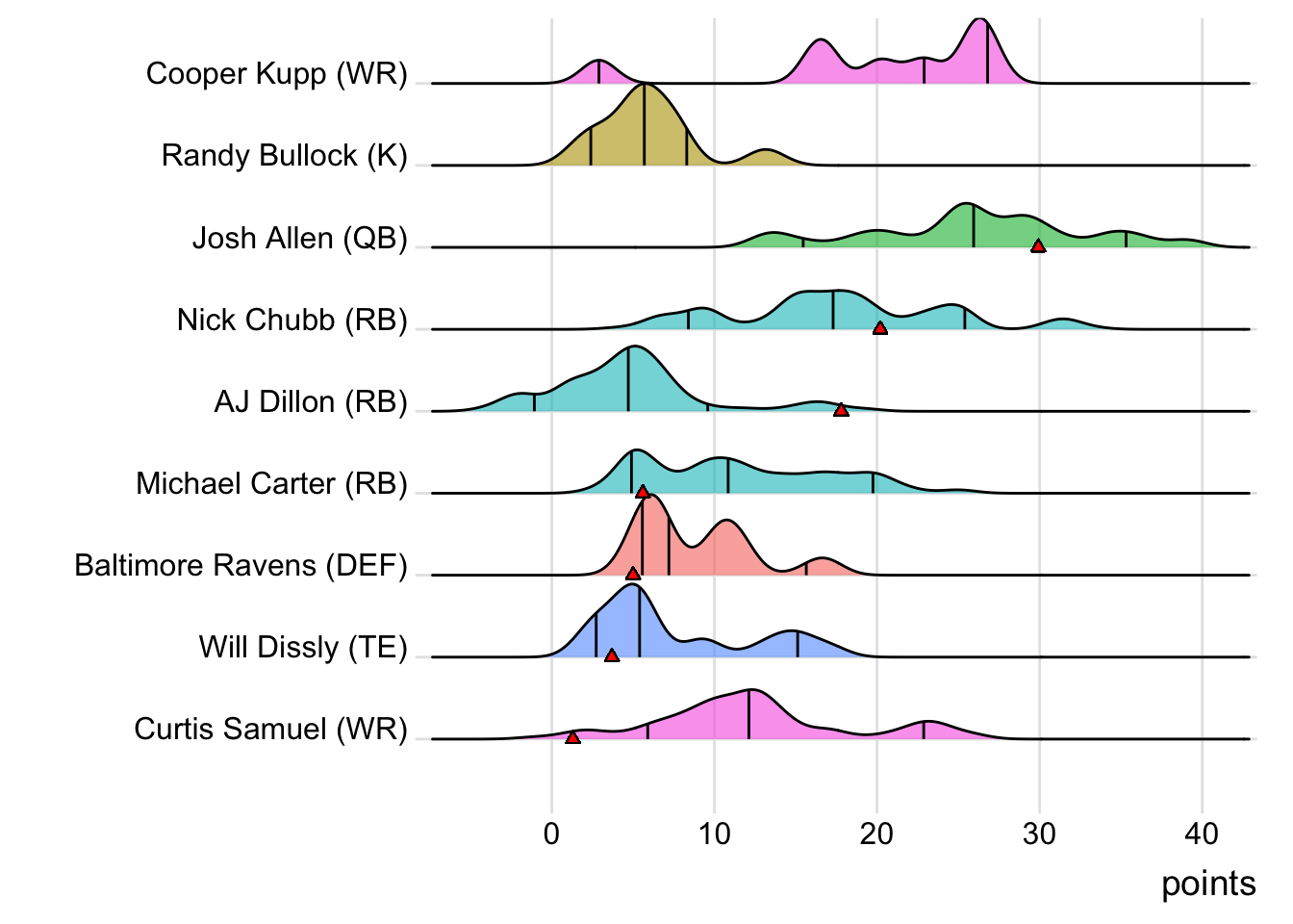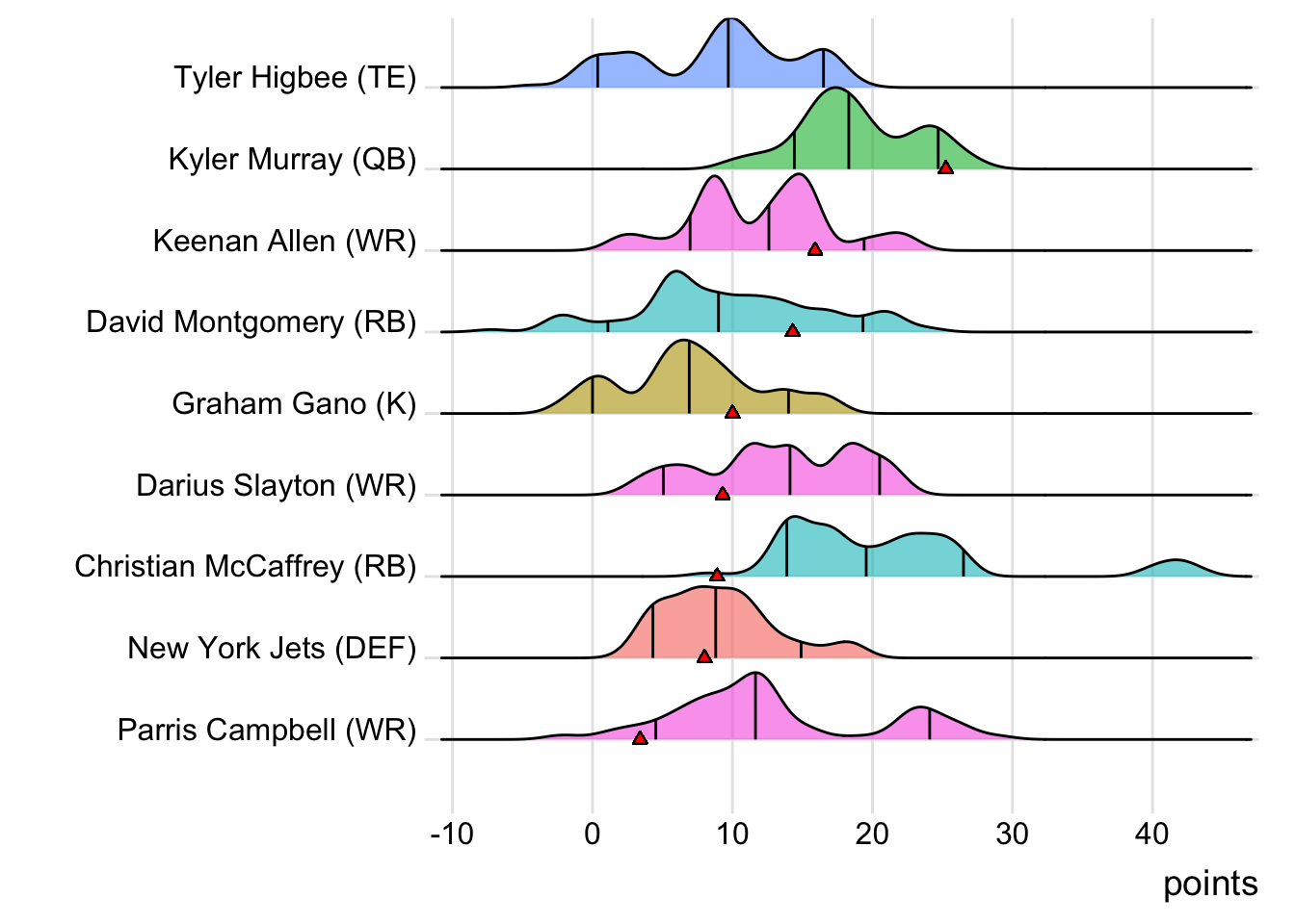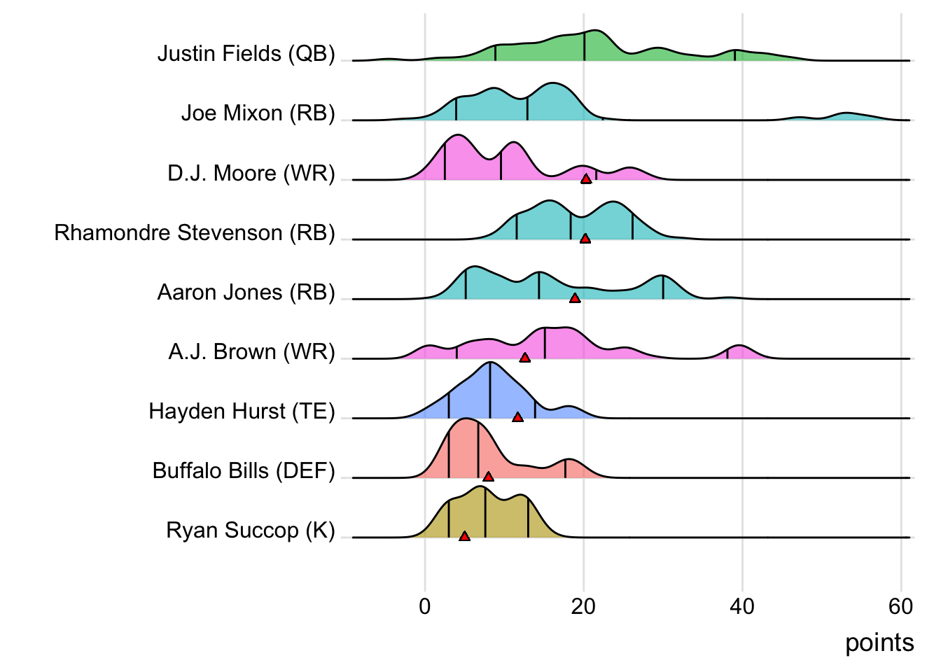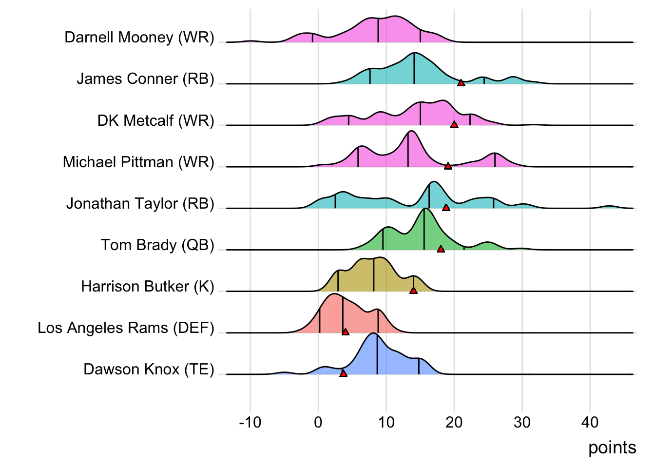 Since Schultz was the high scorer for London Knights, it means that a different player has now led the team in each of the past six weeks. With 18.30 points, Terry McLaurin paced the squad in Week 7, while D’Onta Foreman (31.80 points) was team-leader in Week 8 and Nick Folk (14.00 points) led the way in Week 9. CeeDee Lamb (38.00 points) was tops in Week 10 and Deebo Samuel (22.40 points) led last week.
