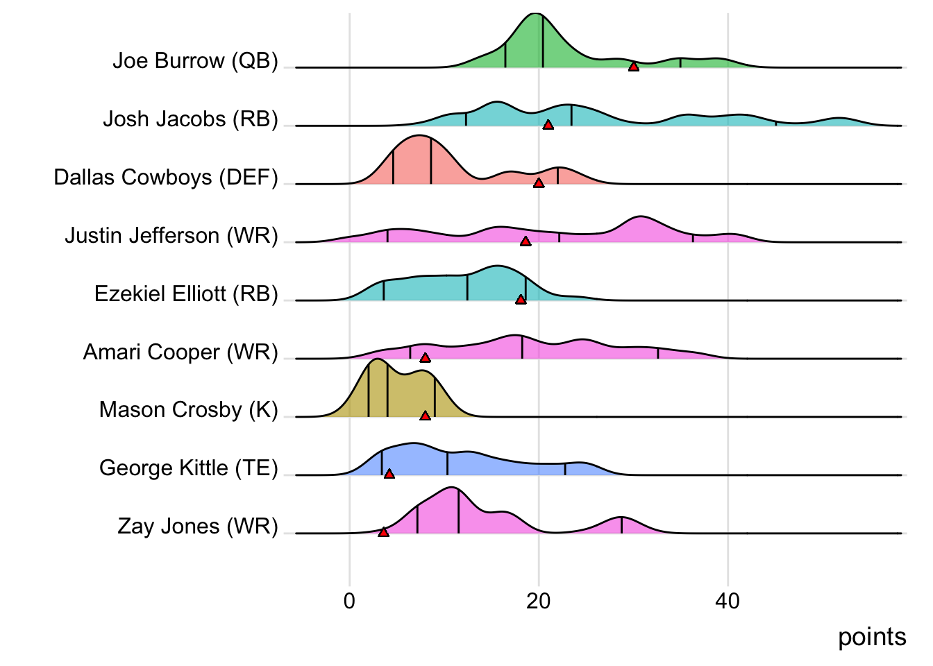 In addition to the fantasy victory, Goncalves Miners was savvy enough to pick winners in real football, as well. Among all of their starters, Zay Jones was the only one that didn’t suit up on a winning NFL team this past week. Since Burrow was the top point-getter for Goncalves Miners, it means a different player has led the team in each of the last four weeks. With 35.30 points, Justin Jefferson paced the squad in Week 10, while Amari Cooper (31.30 points) was tops in Week 11 and Josh Jacobs (48.30 points) in Week 12. Additionally, with 20 touches this week for Ezekiel Elliott, it means that his touches have now increased in four consecutive games.