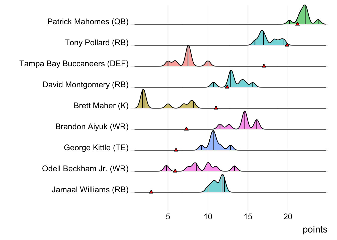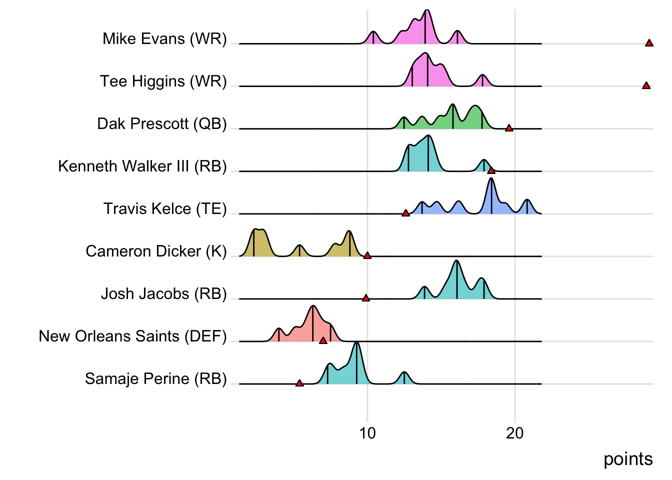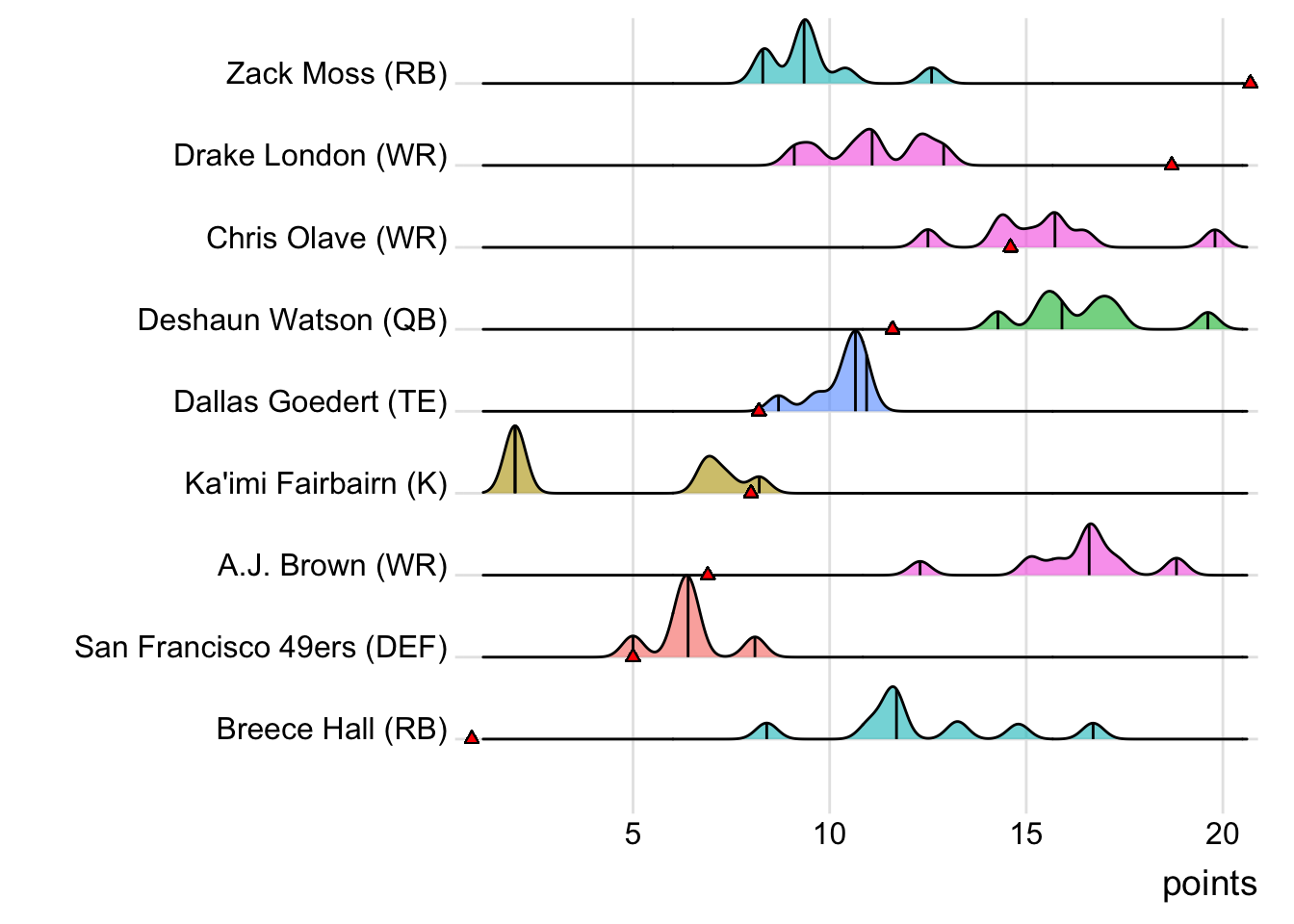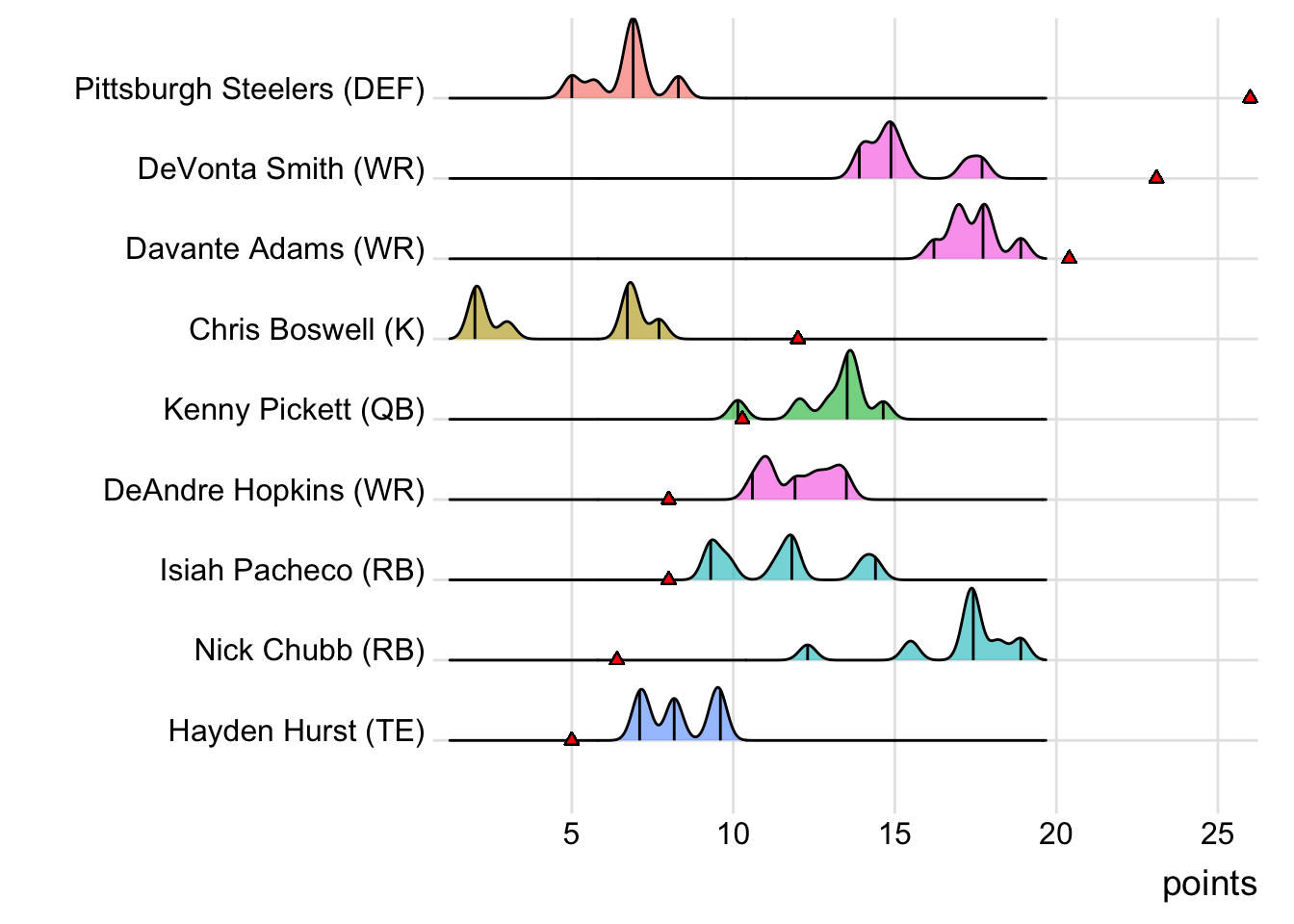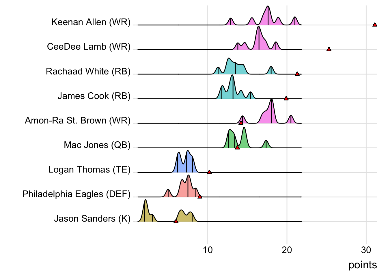 Players drafted in the first round averaged 15.35 points this week. Second-round players averaged 13.66, and were actually outperformed by the third-rounders (14.19).