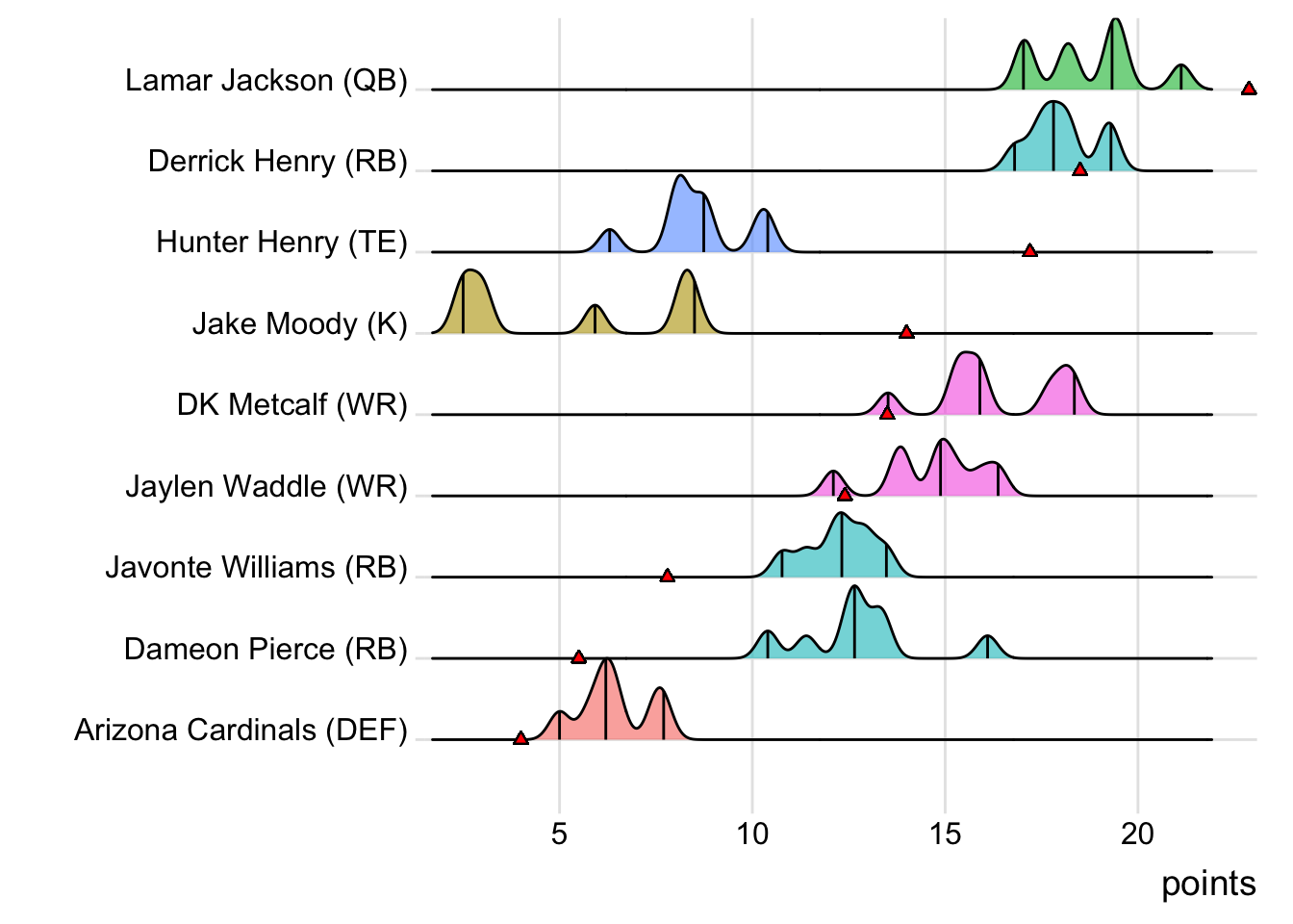 Amparo Bikers picked up 22.88 points from Lamar Jackson (237 Pas Yds, 54 Rsh Yds, 2 TD) and 18.50 from Derrick Henry (80 Rsh Yds, 1 TD) to beat Sorocaba Wild Mules 115.78 to 94.60. Both squads had big primetime performances. Amparo Bikers put up a great Sunday evening with 29.60 points on SNF (26% of their final score) and Sorocaba Wild Mules put up a solid Monday of their own with 26.20 points on MNF (28% of their score). Amparo Bikers met their projections and scored 5.6% more than their projected 109.63 points, while Sorocaba Wild Mules fell just short of projections and got 92.3% of a projected 102.50. Amparo Bikers (1-1, 194.44 points) moves into eighth place and Sorocaba Wild Mules (1-1, 189.46 points) winds up in ninth place.