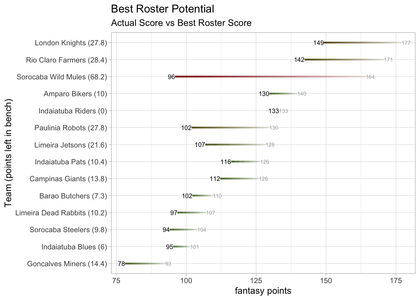 In an epic battle between this week’s first and third-highest-scoring teams, London Knights beat Indaiatuba Riders 149.26 to 133.22. This is the first time this season a team has scored this many points and not picked up the win. The loss drops Indaiatuba Riders to 8th (2-2) in the standings. The scoring output from London Knights was tough to predict given that they were only projected to score 96.74 points. Indaiatuba Riders scored 129.8% of their expected 102.66. DJ Moore (131 Rec Yds, 1 TD) accumulated 27.10 points and Mark Andrews (80 Rec Yds, 2 TD) scored 25.00 points, exceeding their projections by 131.4% and 94.7%, respectively. David Montgomery (121 Rsh Yds, 3 TD) recorded 34.10 points to score 481.9% more than projected (5.86) for Indaiatuba Riders.