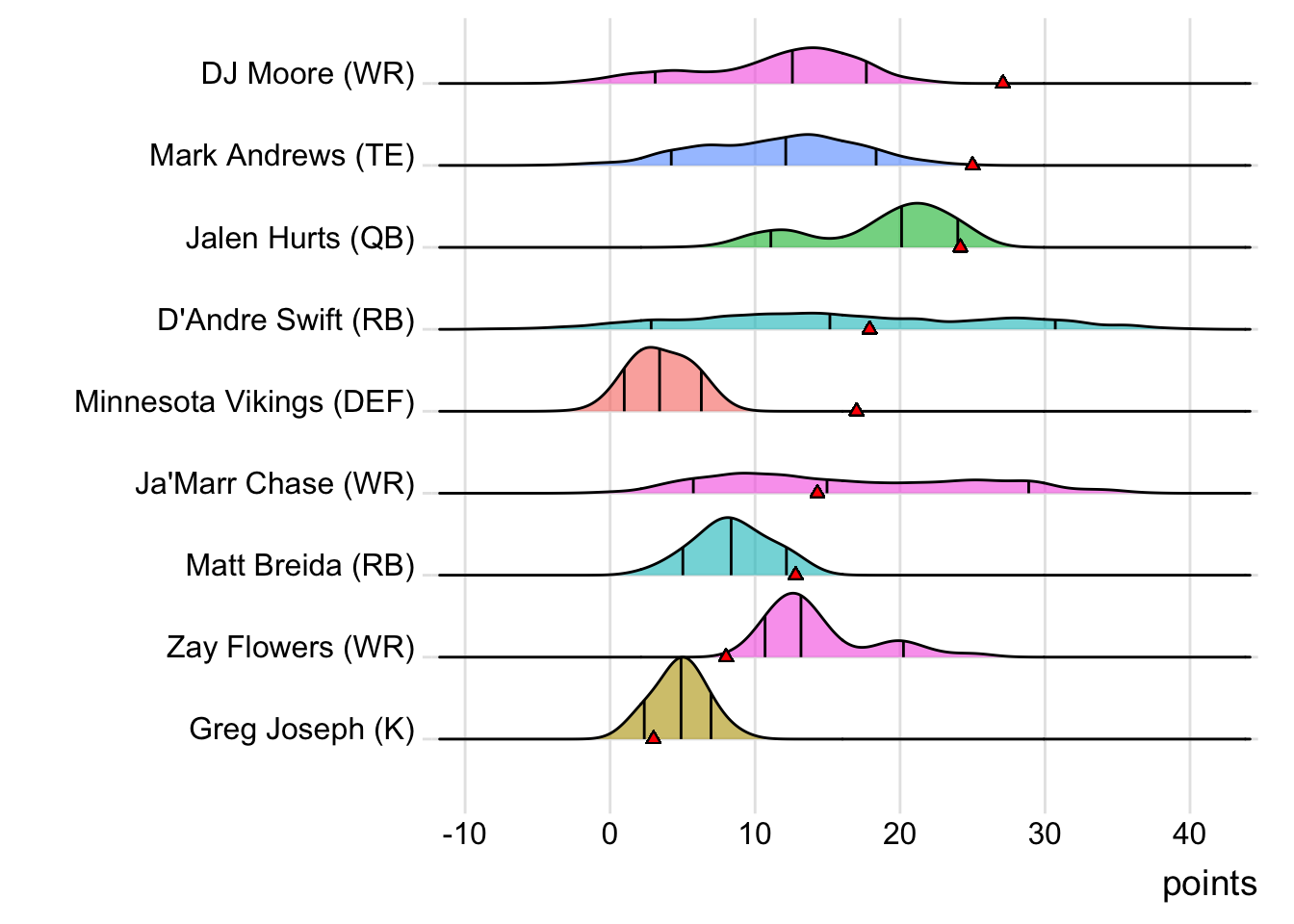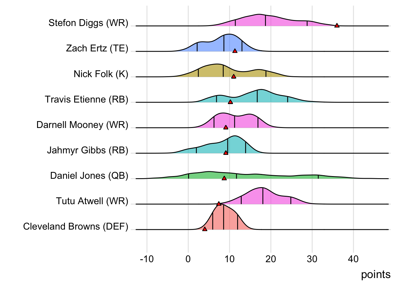 Stefon Diggs scored three touchdowns (36.00 points) and Zach Ertz added 11.30 points as Limeira Jetsons beat Sorocaba Wild Mules 106.82 to 96.00. Limeira Jetsons took a 9.10-point lead on Thursday and maintained an advantage throughout the matchup. Sorocaba Wild Mules has lost their third straight matchup. Sorocaba Wild Mules actually averages more per game in losses (105.42) than wins (94.86). On top of the loss, Sorocaba Wild Mules received no points from Deshaun Watson. Limeira Jetsons (2-2, 421.10 points) climbs into 10th place and Sorocaba Wild Mules (1-3, 411.12 points) drops to 12th place.