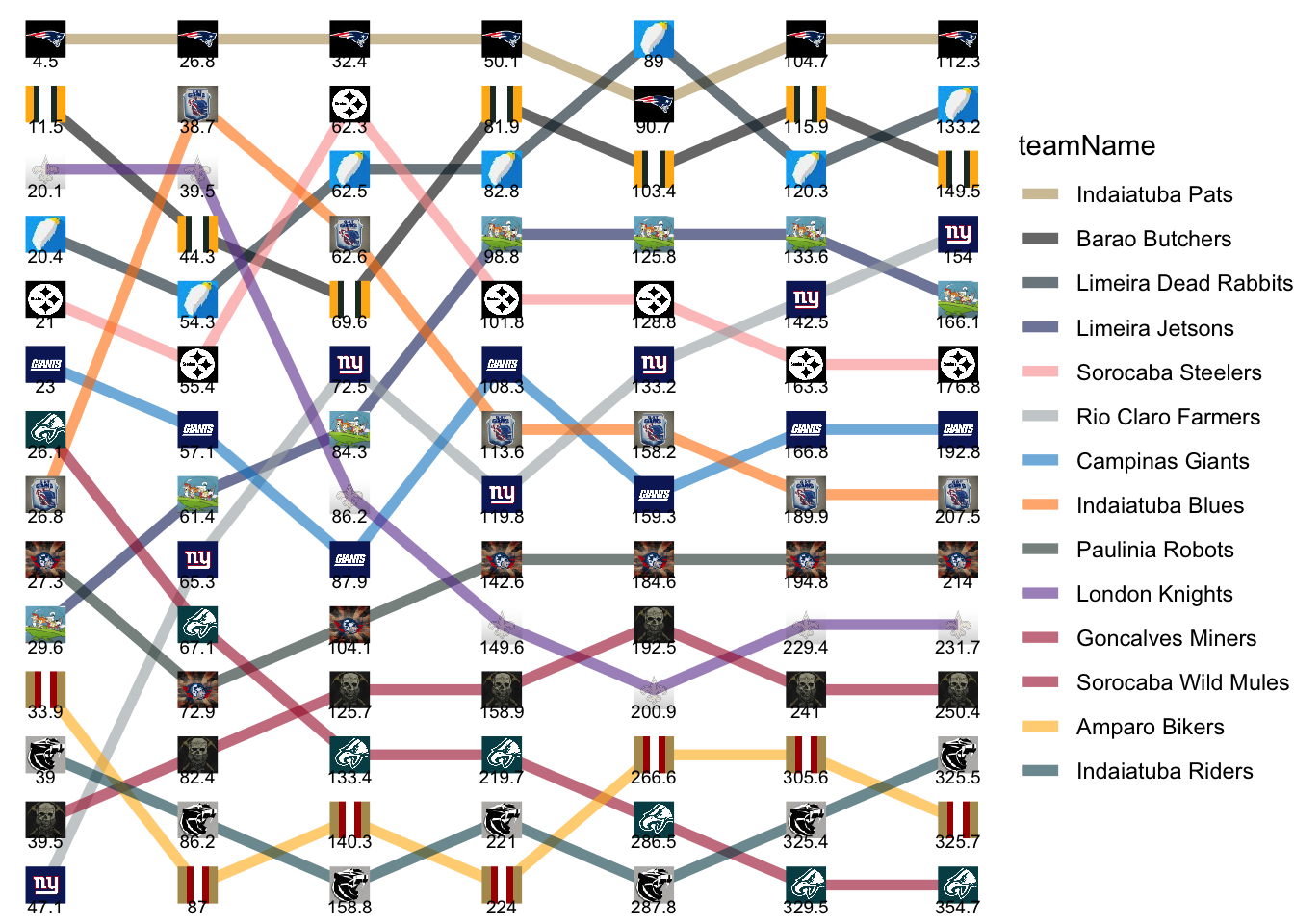 | Limeira Dead Rabbits | 20.38 | 33.90 | 8.20 | 20.30 | 6.20 | 31.36 | 12.90 |