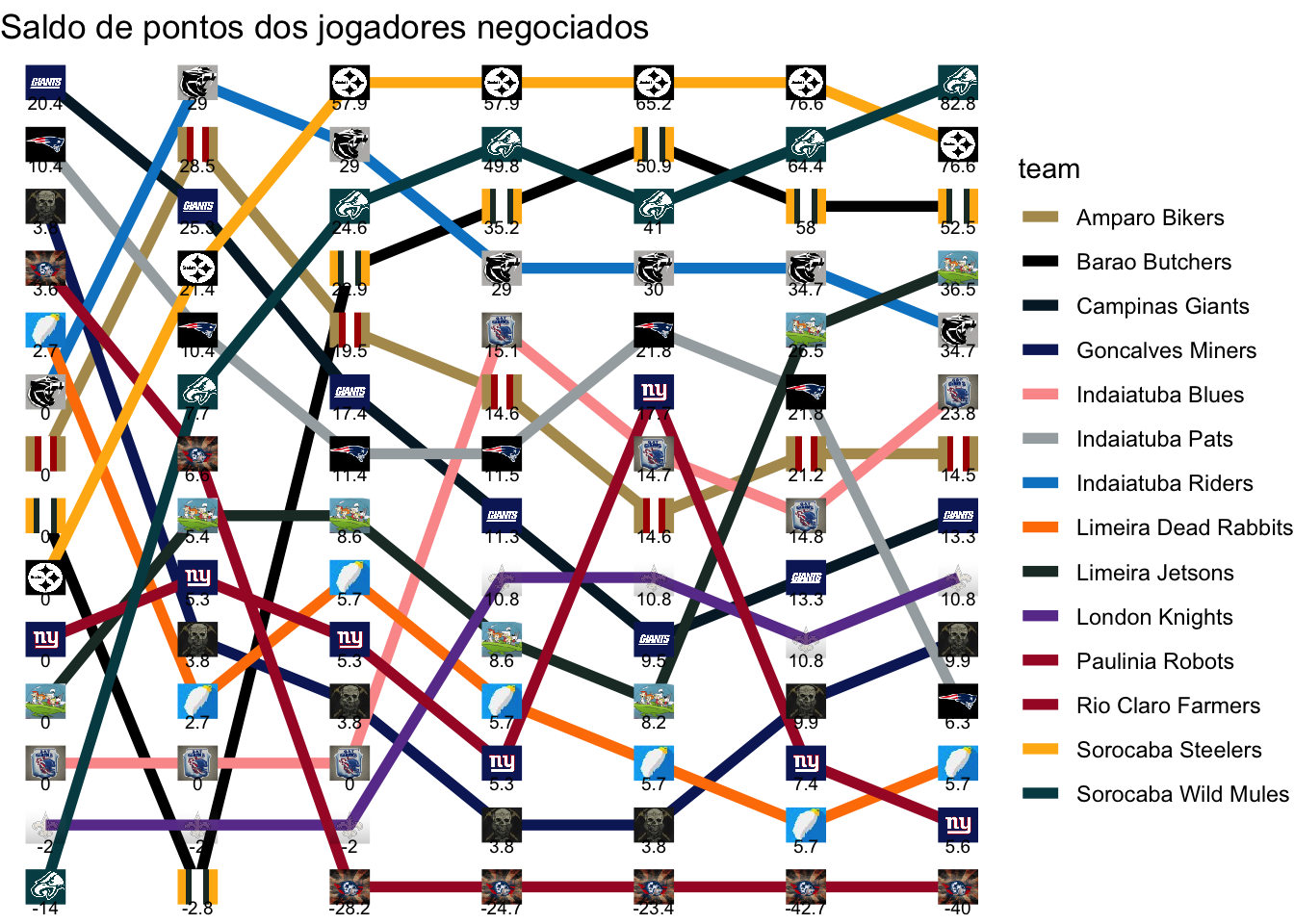 Total de pontos que foram deixados de ganhar na melhor escalação possível, acumulado ao longo das rodadas.