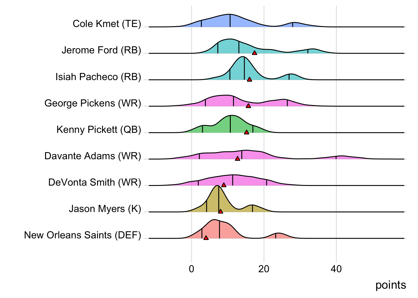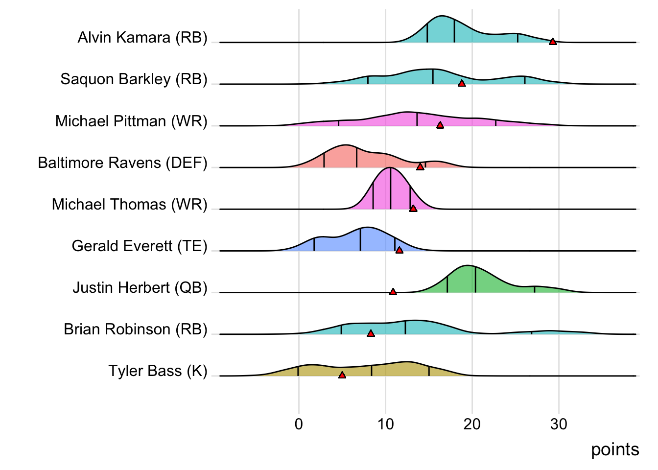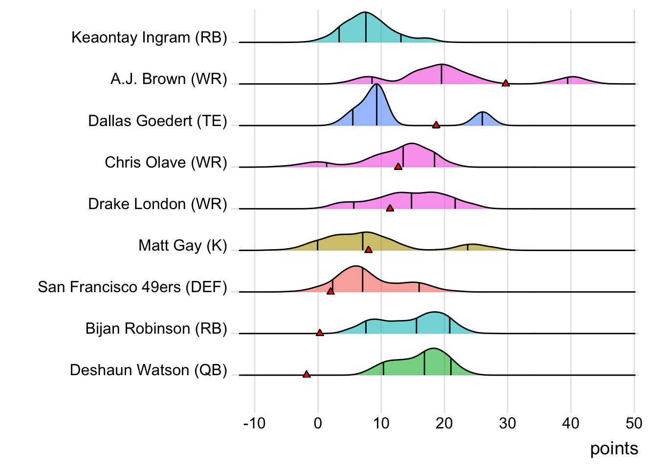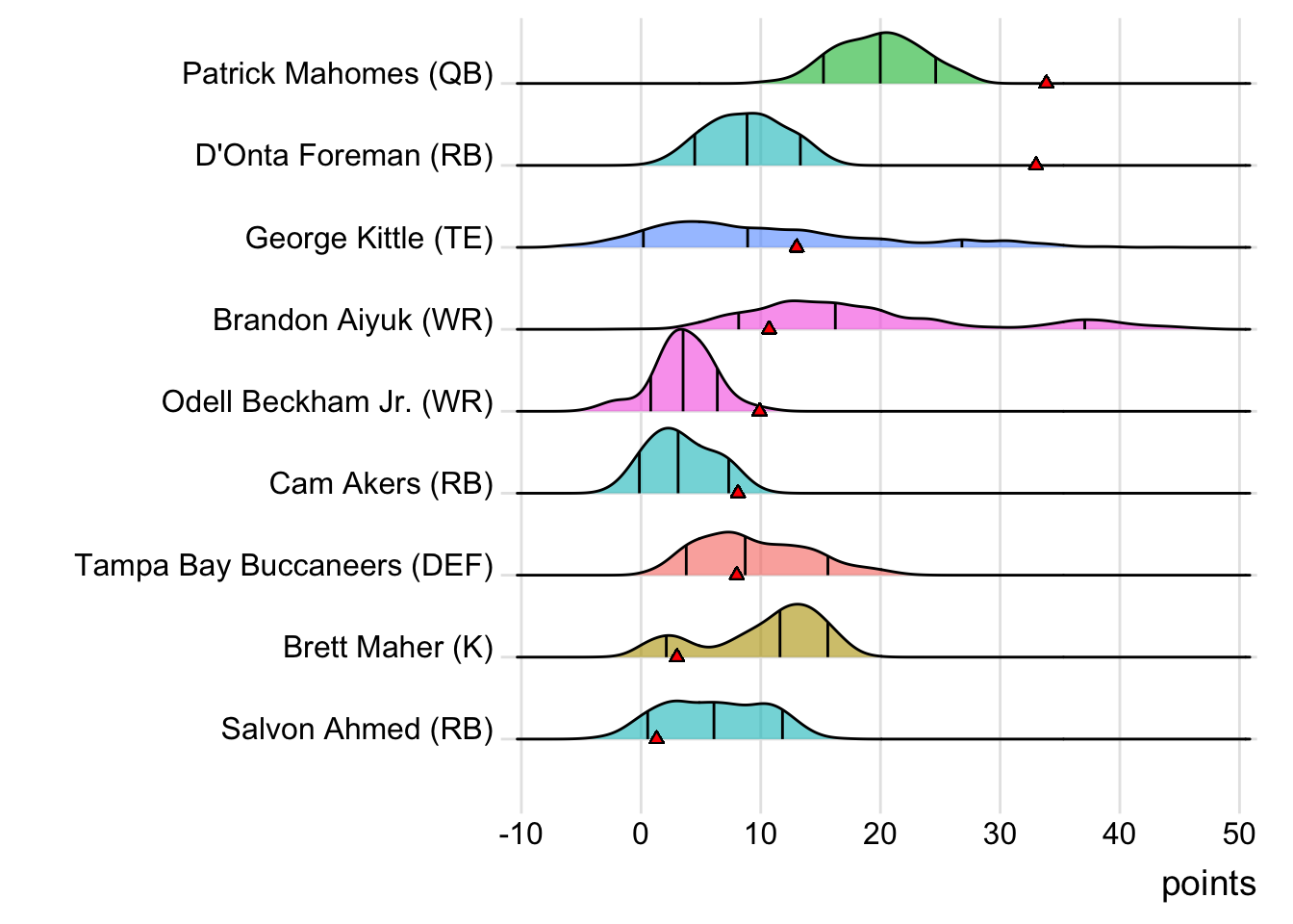 Since Mahomes was the top point-getter for Indaiatuba Riders, it means a different player has led the team in each of the last four weeks. With 34.10 points, David Montgomery paced the squad in Week 4, while George Kittle (27.70 points) was tops in Week 5 and Adam Thielen (28.50 points) in Week 6.