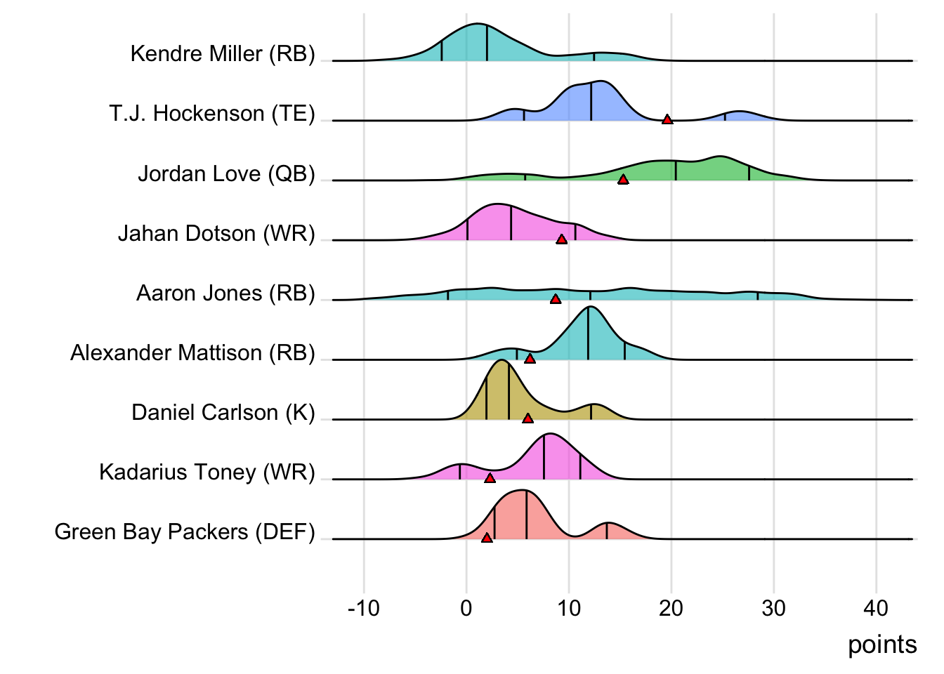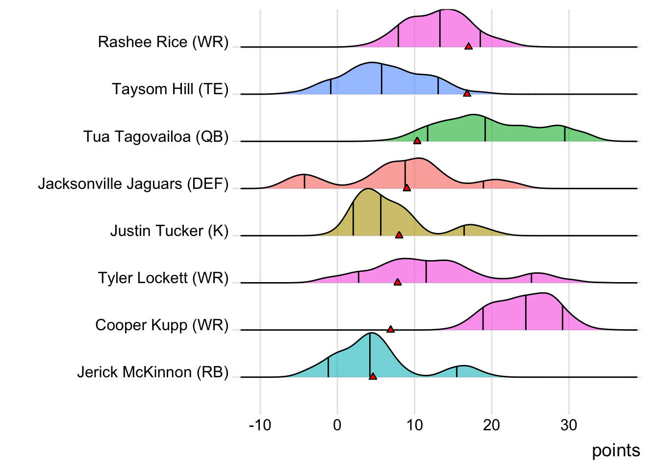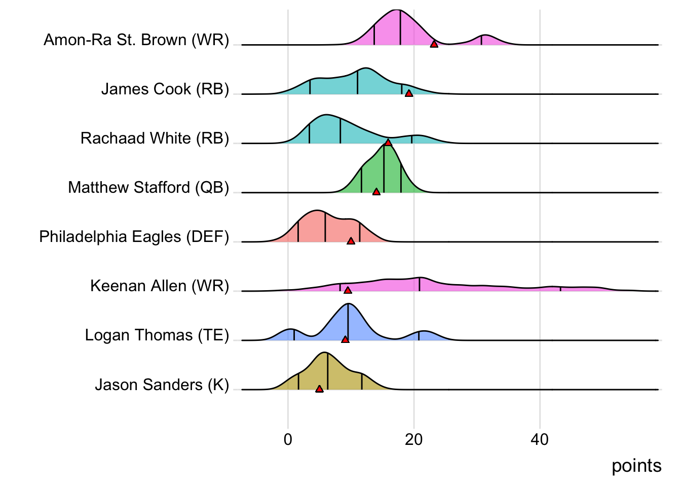 Since Mahomes was the top point-getter for Indaiatuba Riders, it means a different player has led the team in each of the last four weeks. With 34.10 points, David Montgomery paced the squad in Week 4, while George Kittle (27.70 points) was tops in Week 5 and Adam Thielen (28.50 points) in Week 6.