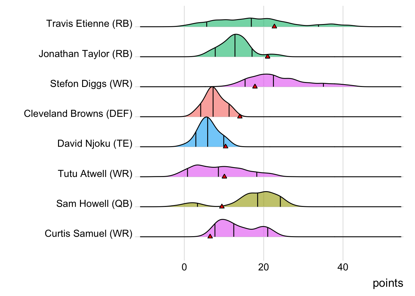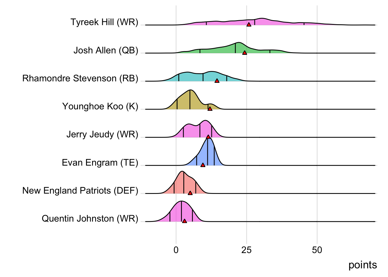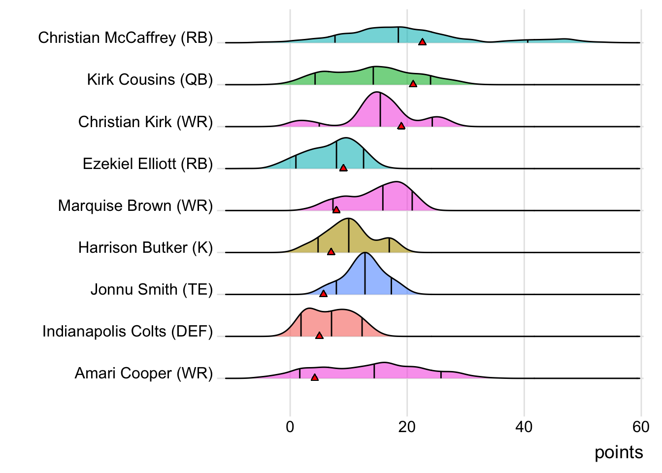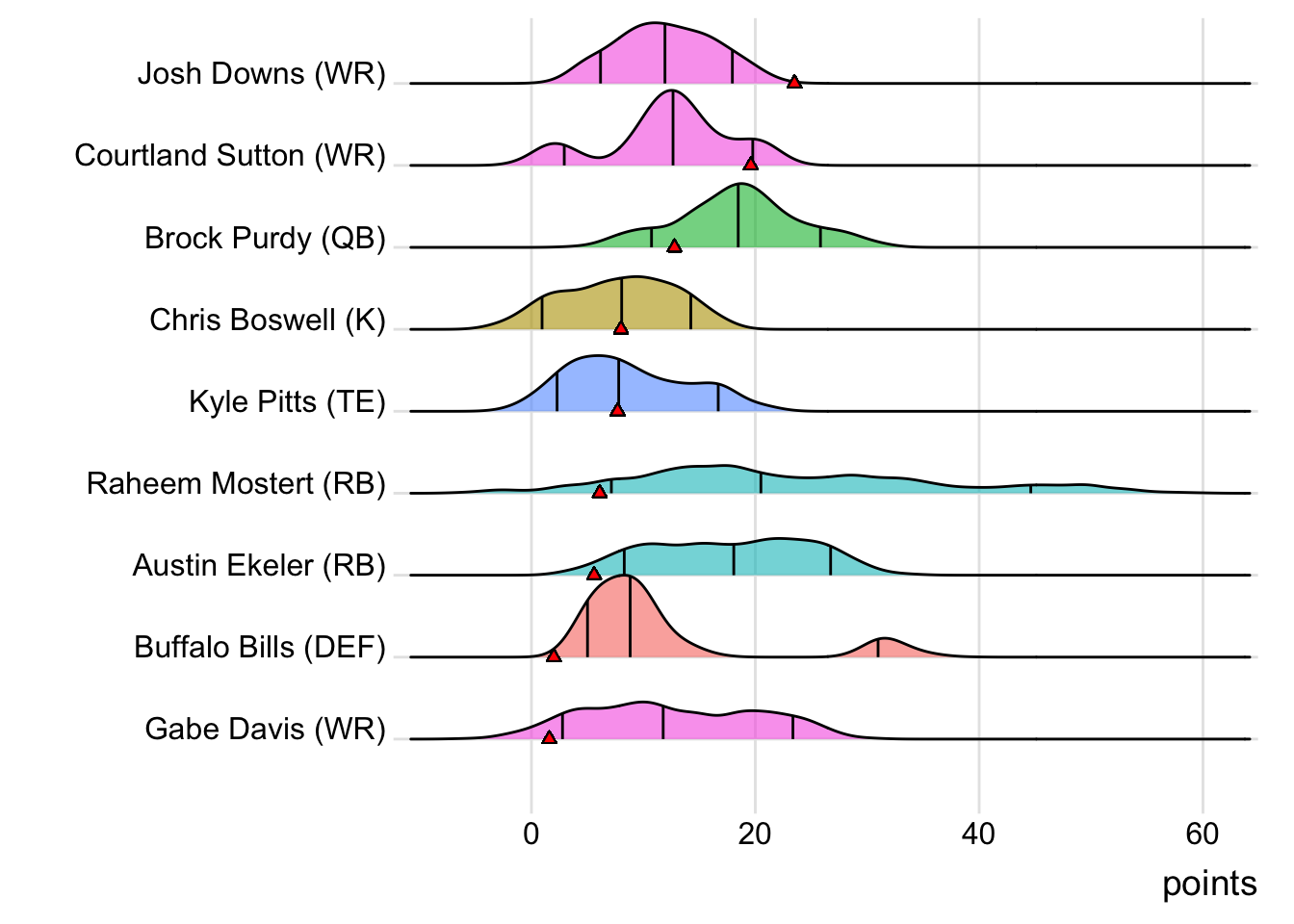 Since Mahomes was the top point-getter for Indaiatuba Riders, it means a different player has led the team in each of the last four weeks. With 34.10 points, David Montgomery paced the squad in Week 4, while George Kittle (27.70 points) was tops in Week 5 and Adam Thielen (28.50 points) in Week 6.