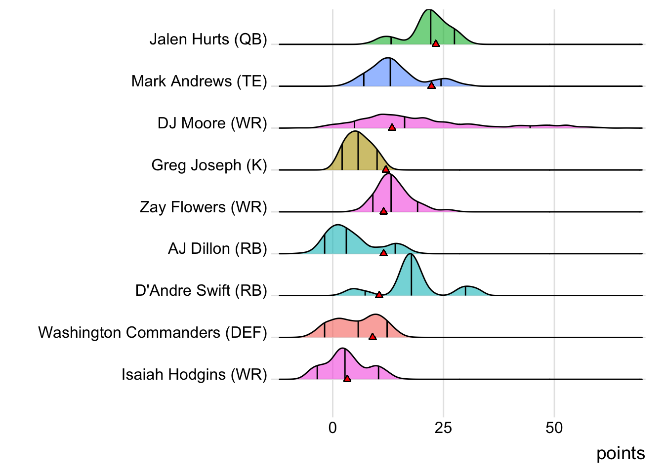 Since Hurts was the top point-getter for London Knights, it means a different player has led the team in each of the last four weeks. With 27.10 points, DJ Moore paced the squad in Week 4, while Ja’Marr Chase (52.20 points) was tops in Week 5 and the Vikings Defense (21.00 points) in Week 6.
