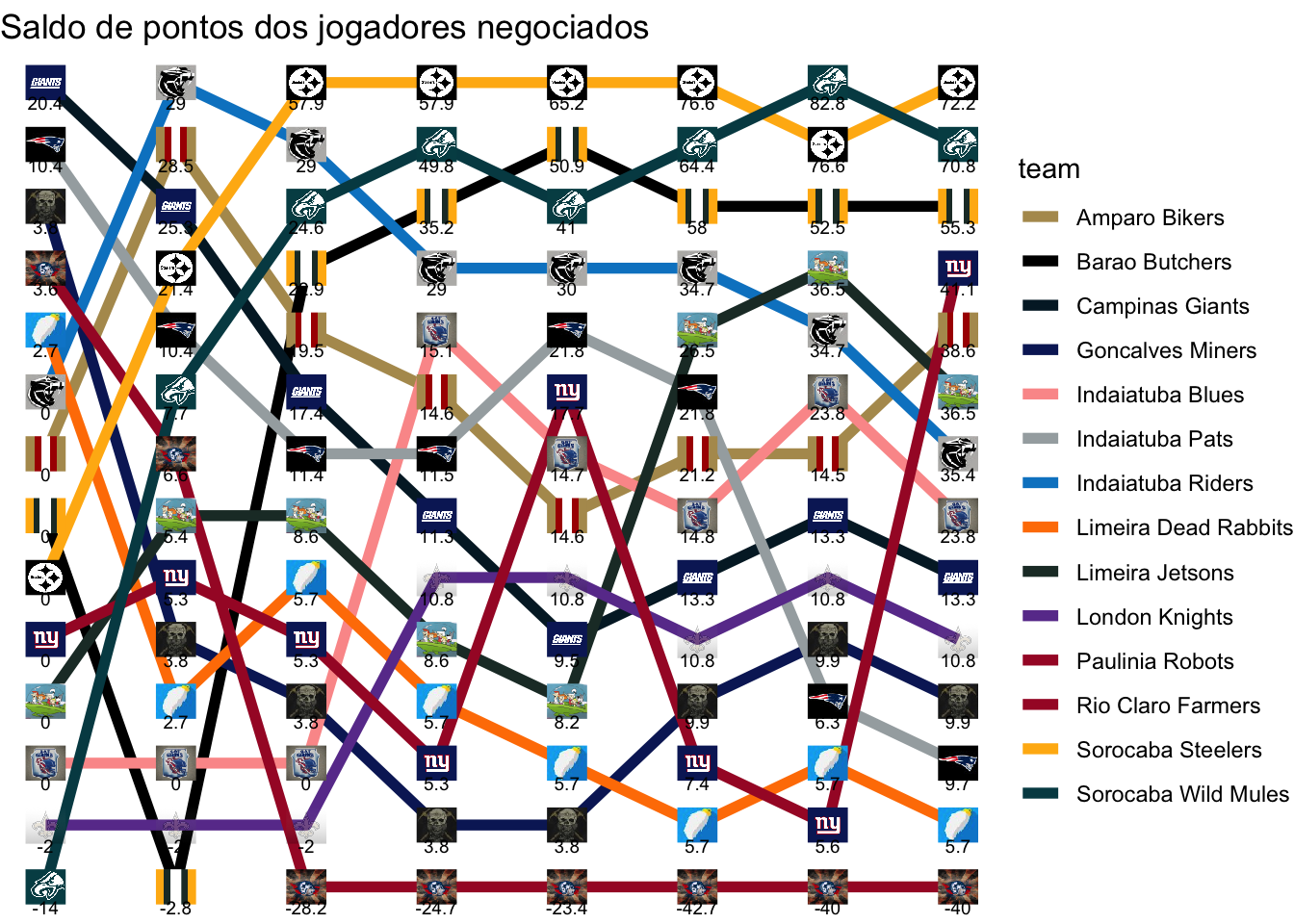 Total de pontos que foram deixados de ganhar na melhor escalação possível, acumulado ao longo das rodadas.