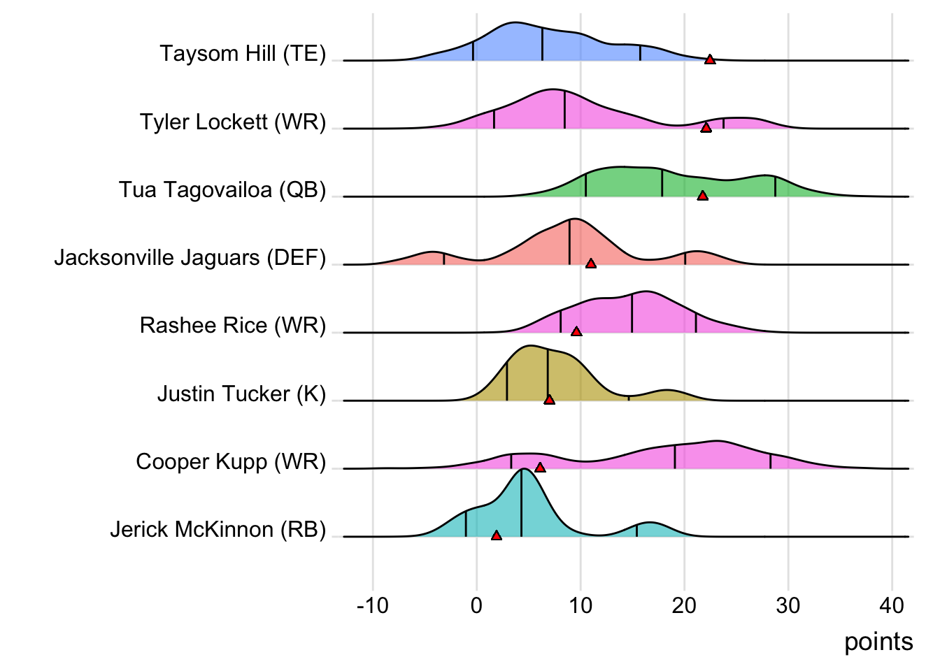 Taysom Hill scored two touchdowns (22.46 points) and Tyler Lockett added 22.10 points as Indaiatuba Blues beat Paulinia Robots 101.92 to 90.94. Paulinia Robots is now on a three-game losing streak. Josh Jacobs led Paulinia Robots with 16.80 points (61 Rsh Yds, 27 Rec Yds, 1 TD) while Mike Evans racked up 12.90 (39 Rec Yds, 1 TD). The margin could have been larger as Indaiatuba Blues had a starter score zero points (Damien Harris). Paulinia Robots (4-4, 890.36 points) drops to eighth place and Indaiatuba Blues (2-6, 760.70 points) remains in 13th place.