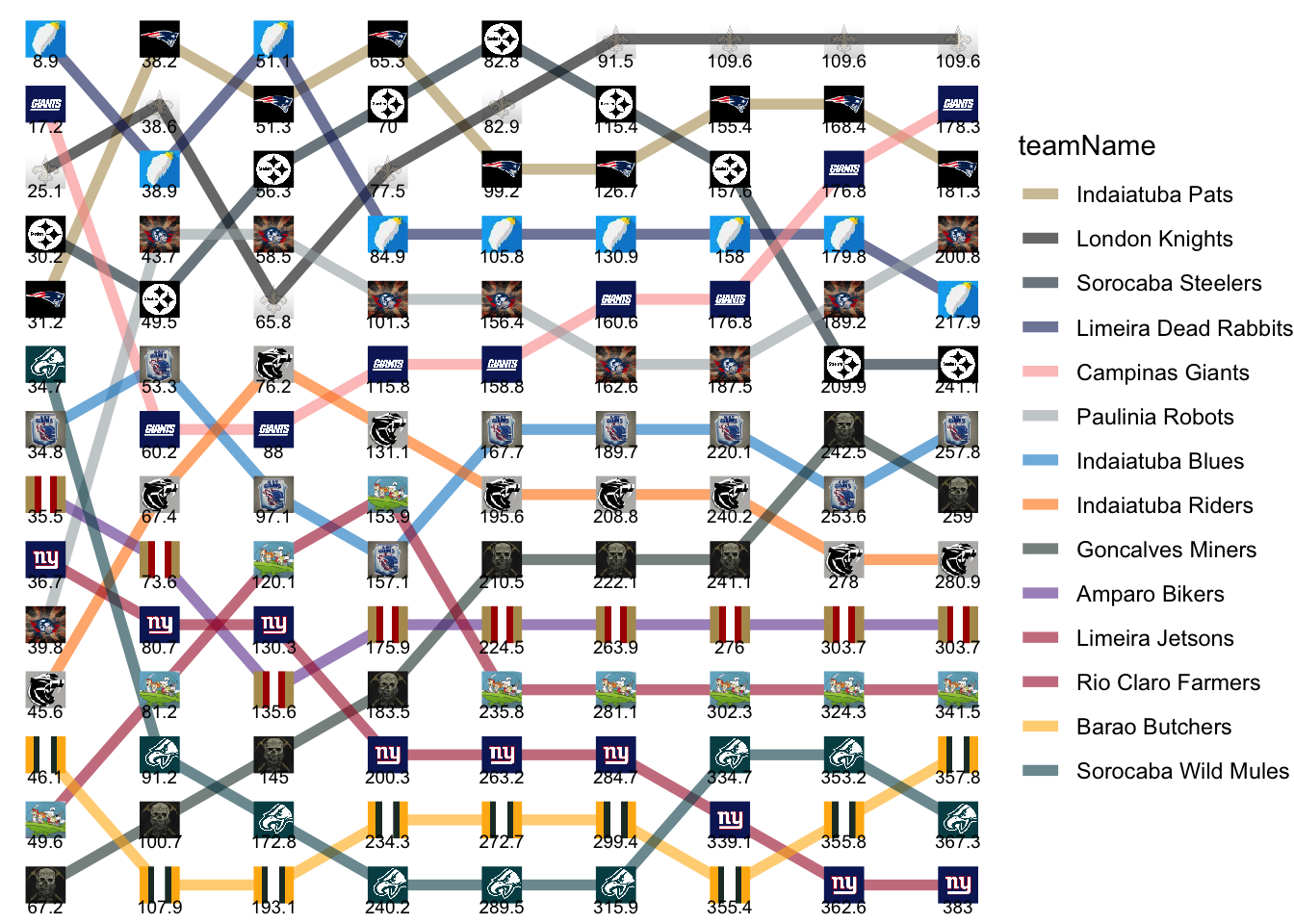 | Sorocaba Wild Mules | 34.70 | 56.50 | 81.60 | 67.36 | 49.38 | 26.40 | 18.80 | 18.50 | 14.1 |