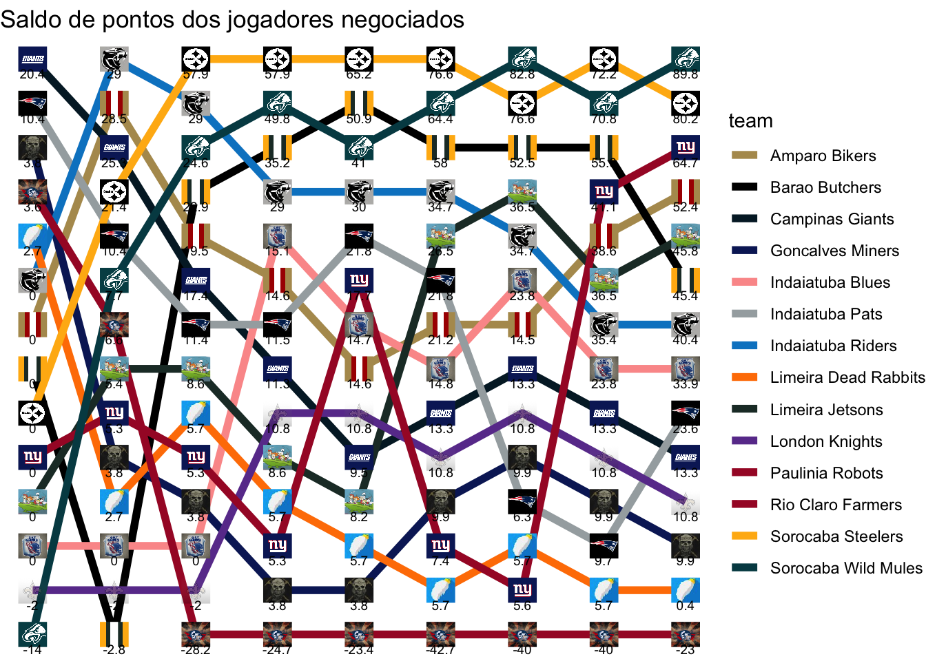 Total de pontos que foram deixados de ganhar na melhor escalação possível, acumulado ao longo das rodadas.