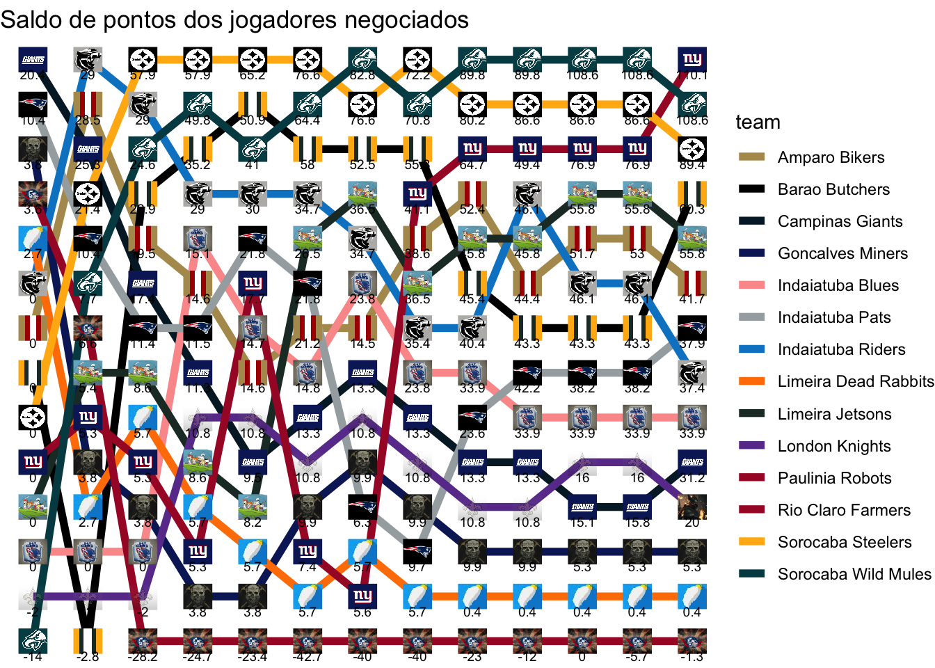 Total de pontos que foram deixados de ganhar na melhor escalação possível, acumulado ao longo das rodadas.