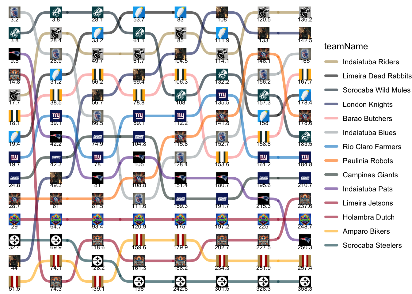 | Limeira Dead Rabbits | 19.40 | 11.80 | 2.00 | 20.48 | 29.36 | 28.82 | 46.16 | 20.40 |