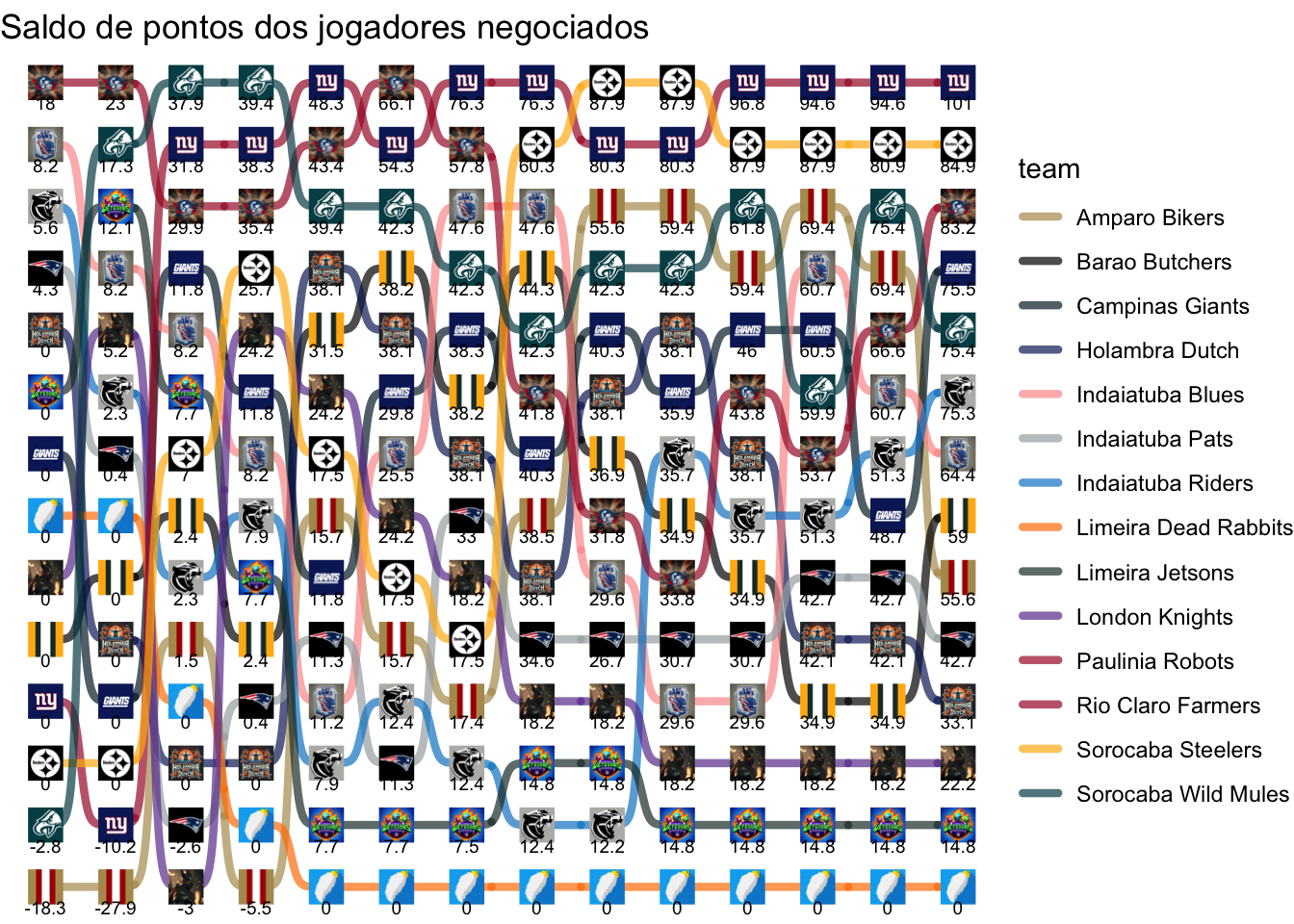 | Campinas Giants | 0.0 | 0.00 | 11.80 | 0.00 | 0.00 | 18.04 | 8.50 | 2.00 | 0.00 | -4.40 | 10.08 | 14.50 | -11.82 | 26.80 |