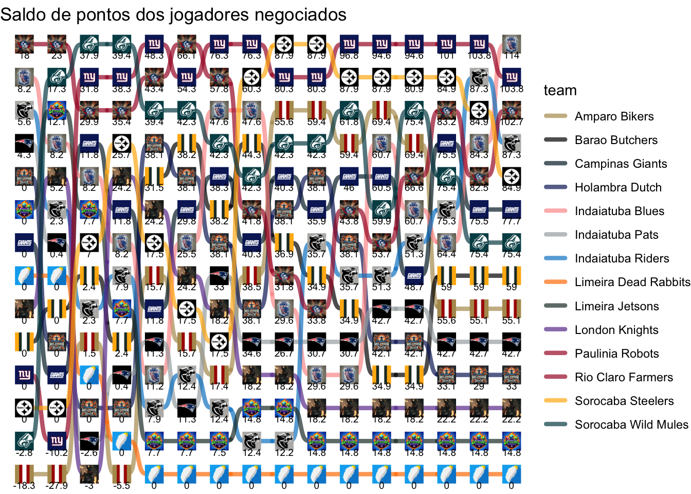 Total de pontos que foram deixados de ganhar na melhor escalação possível, acumulado ao longo das rodadas.