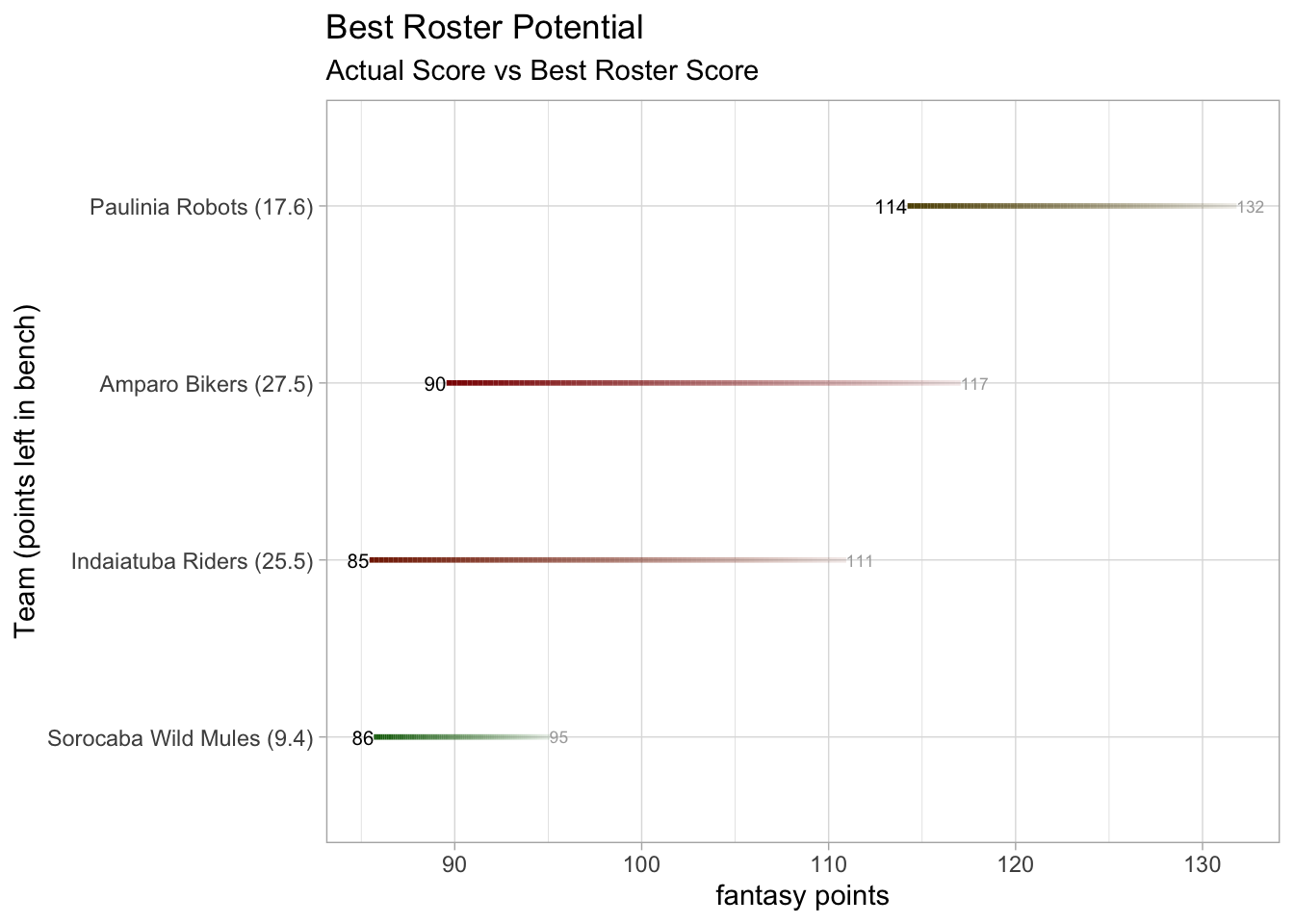 Paulinia Robots was projected to win by the widest margin in the league this week (25.13 points) and they topped it with a 28.78-point victory.