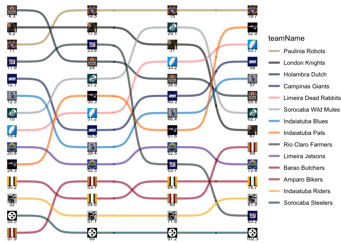 | Sorocaba Wild Mules | 15.00 | 12.20 | 1.86 | 33.66 |