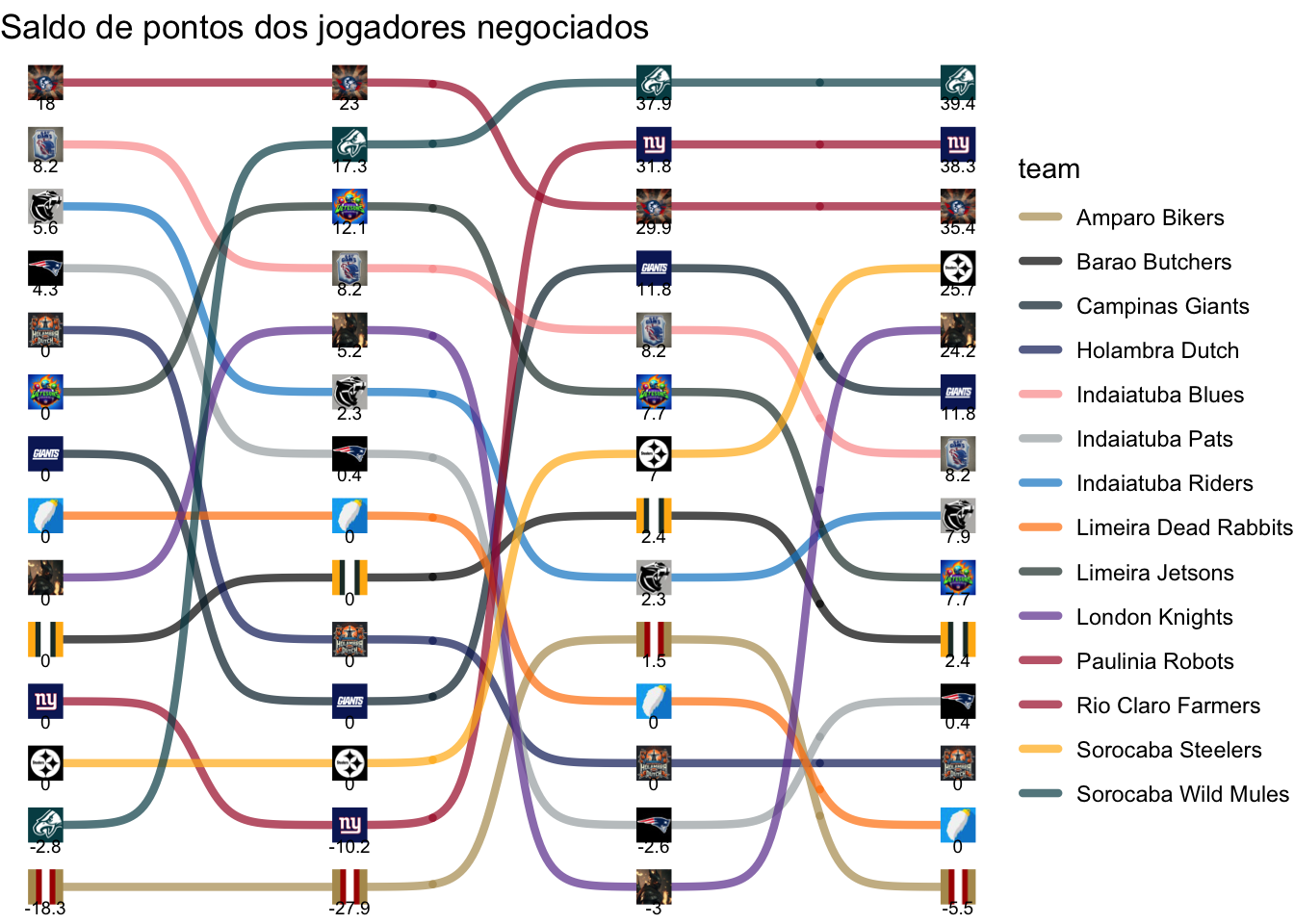 Total de pontos que foram deixados de ganhar na melhor escalação possível, acumulado ao longo das rodadas.