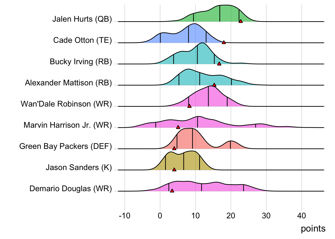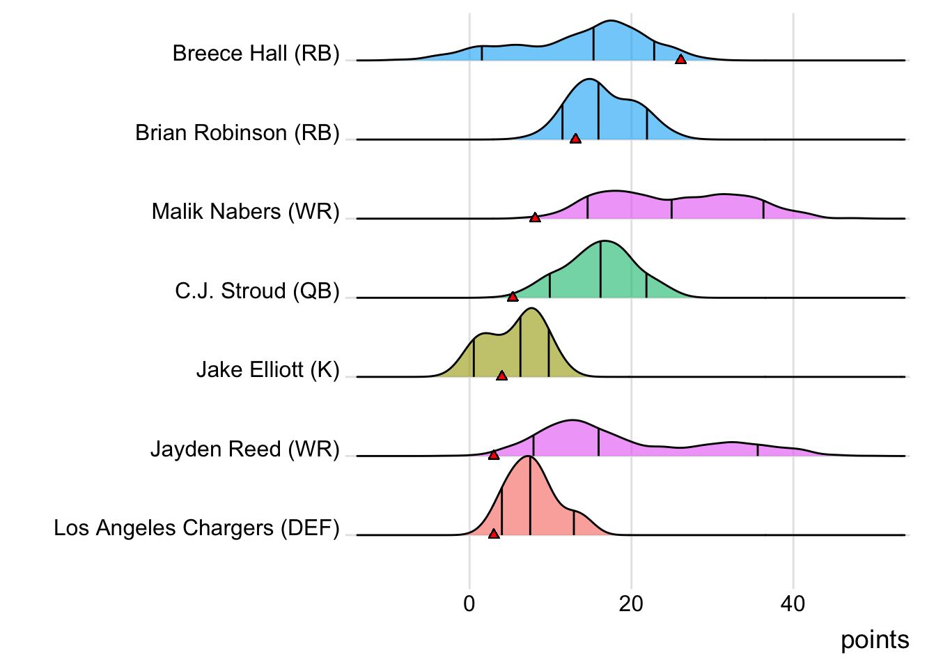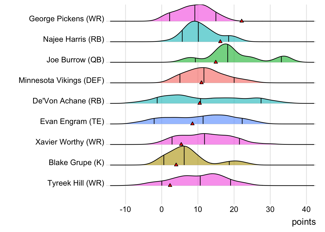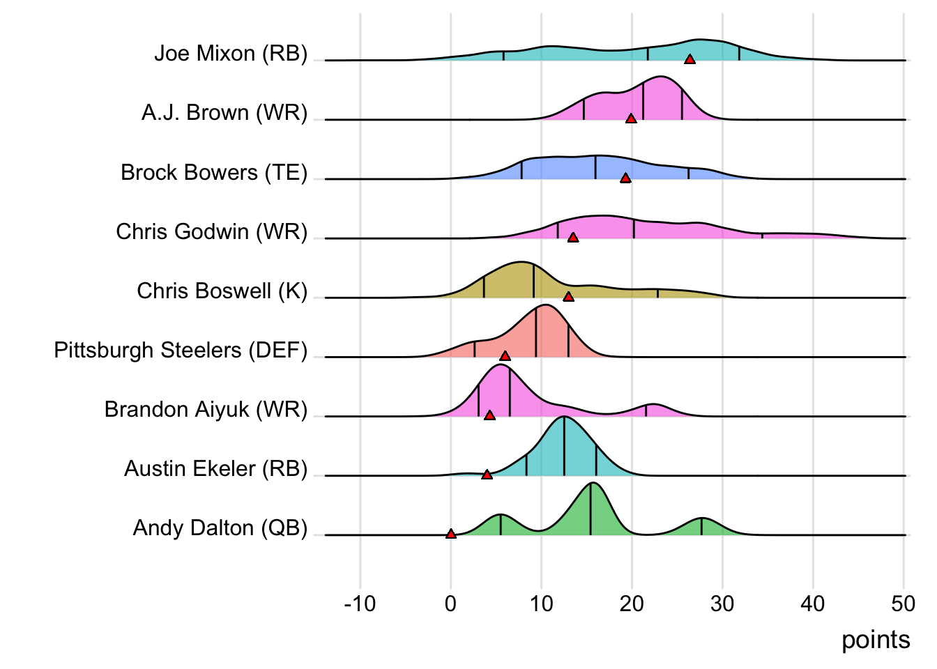 Since Mixon was the leading point-getter for Sorocaba Steelers, it means a different player has now topped the team in each of the past five weeks. With 20.70 points, Zack Moss paced the squad in Week 3, while Justin Fields put up 31.98 points to lead the way in Week 4. Brock Bowers (23.70 points) was tops in Week 5 and Chris Godwin (35.50 points) led in Week 6. Also, with 24 touches this week for Bijan Robinson, it means that his touches have now increased in three consecutive games.