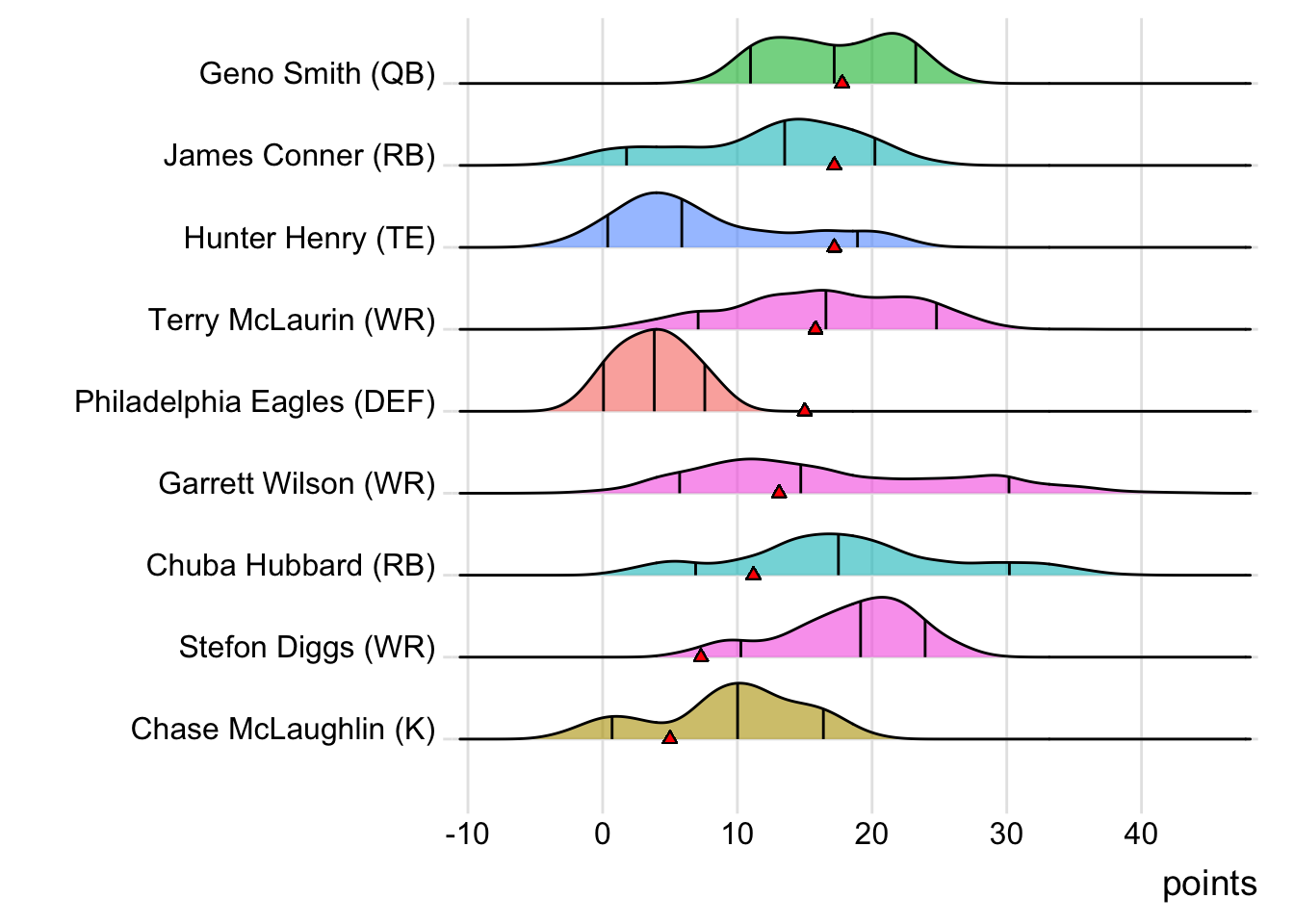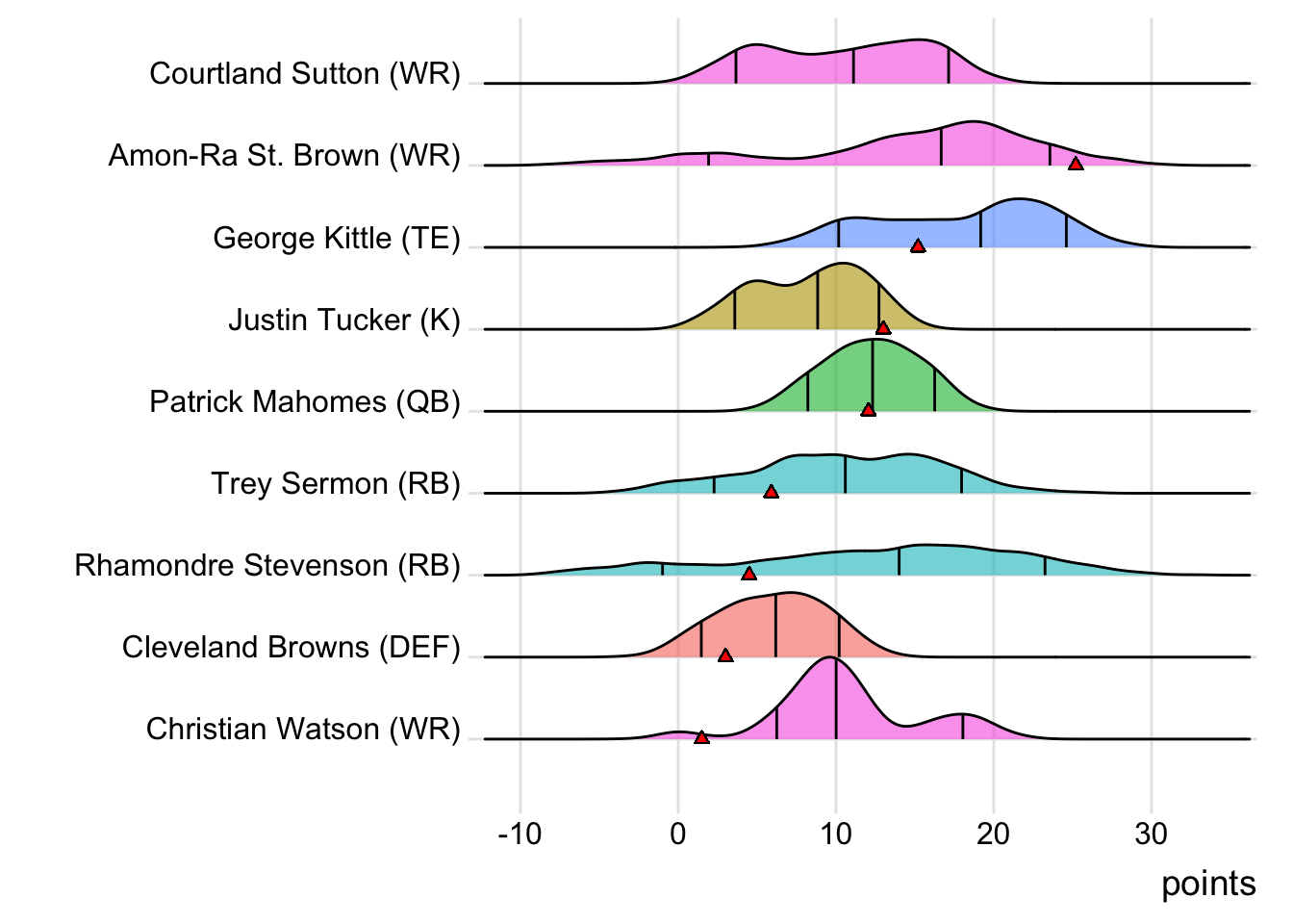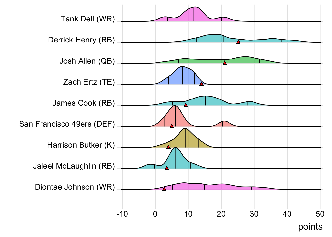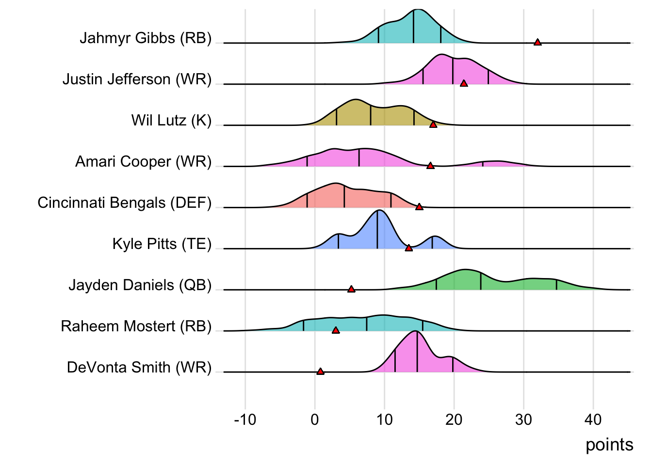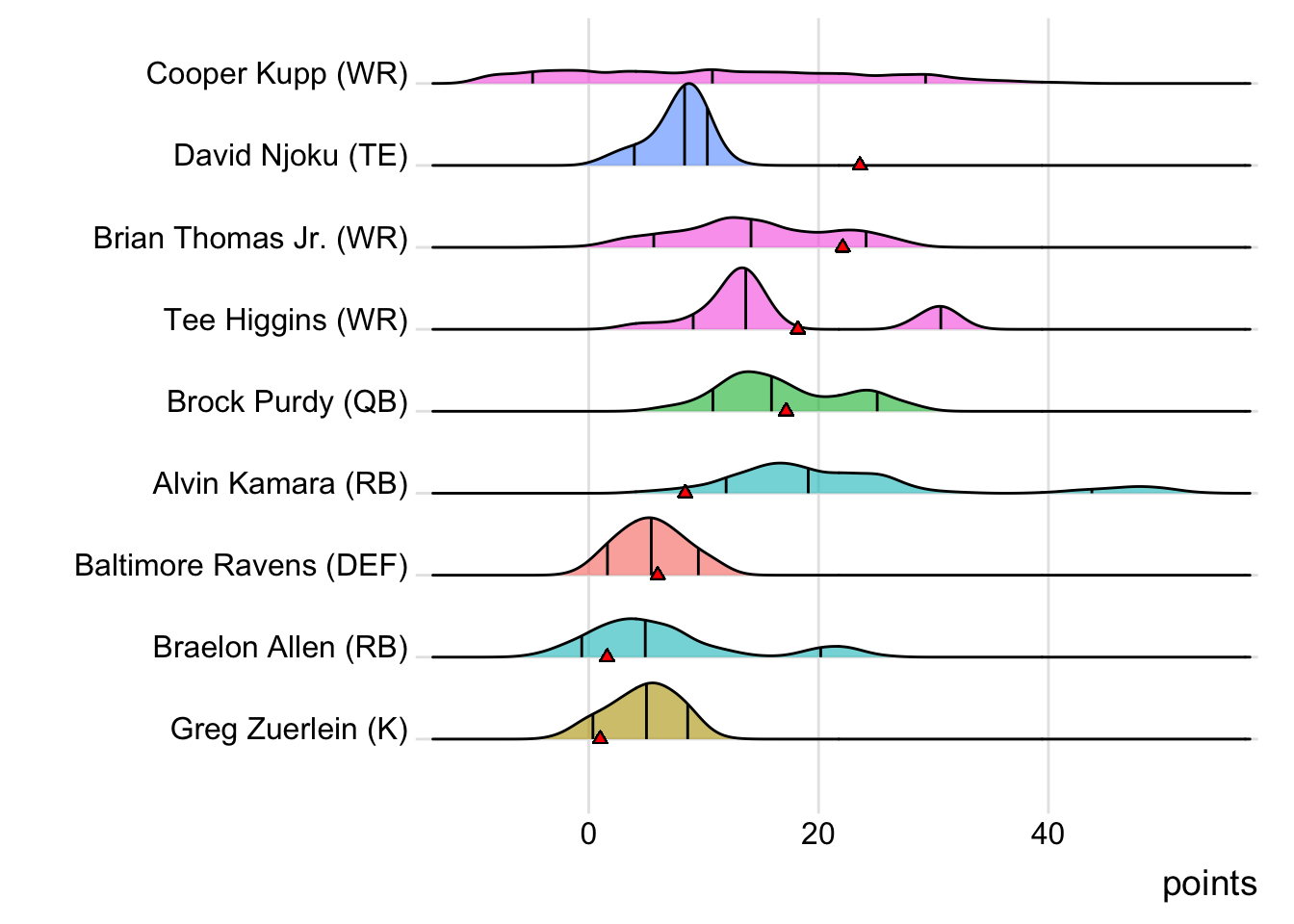 Since Mixon was the leading point-getter for Sorocaba Steelers, it means a different player has now topped the team in each of the past five weeks. With 20.70 points, Zack Moss paced the squad in Week 3, while Justin Fields put up 31.98 points to lead the way in Week 4. Brock Bowers (23.70 points) was tops in Week 5 and Chris Godwin (35.50 points) led in Week 6. Also, with 24 touches this week for Bijan Robinson, it means that his touches have now increased in three consecutive games.
