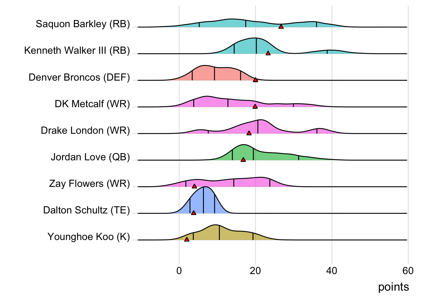 Since Barkley was the top point-getter for Holambra Dutch, it means a different player has led the team in each of the last four weeks. With 33.60 points, Kenneth Walker III paced the squad in Week 4, while Drake London (33.40 points) was tops in Week 5 and Jordan Love (25.62 points) last week.