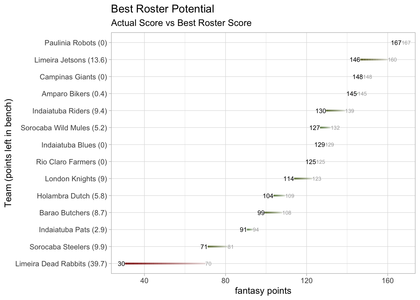 This week’s second- and third-highest-scoring teams met in an epic battle as Campinas Giants came back from being down 7.16 on Monday night to sneak past Limeira Jetsons 147.86 to 146.46. This is the most a team has scored this season without getting a victory. Limeira Jetsons falls to 7th (7-7) in the standings. The combined points was unexpected given that Campinas Giants was only projected to score 113.56 points and Limeira Jetsons was expected to score 97.74 points. Tyreek Hill (115 Rec Yds, 1 TD) put up 28.10 points and Isaac Guerendo (78 Rsh Yds, 50 Rec Yds, 2 TD) scored 26.80 points, exceeding their projections by 103.2% and 135.9%, respectively. Limeira Jetsons was led by Zach Charbonnet (134 Rsh Yds, 59 Rec Yds, 2 TD), who got 38.30 points, and Justin Jefferson (132 Rec Yds, 2 TD), who finished with 32.20. That pair topped their scoring projections by 527.9% and 112.7%, respectively. Although emerging victorious this time, Campinas Giants has been on the losing end of a similar high-scoring matchup once before, suffering a tough loss against Limeira Dead Rabbits in Week 1, 133.06 to 129.86.