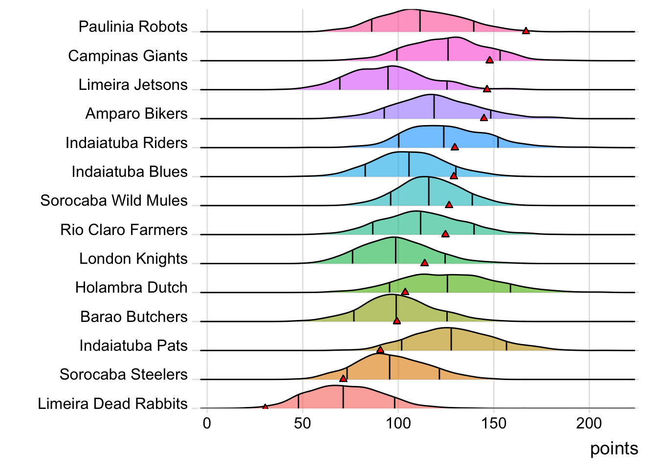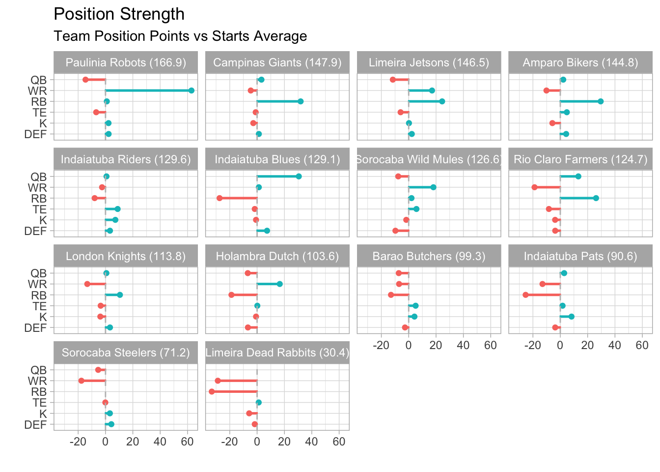 London Knights gets Sorocaba Wild Mules (8-6, 1,568.70) in Week 15, while Holambra Dutch faces Paulinia Robots (10-4, 1,785.56).
