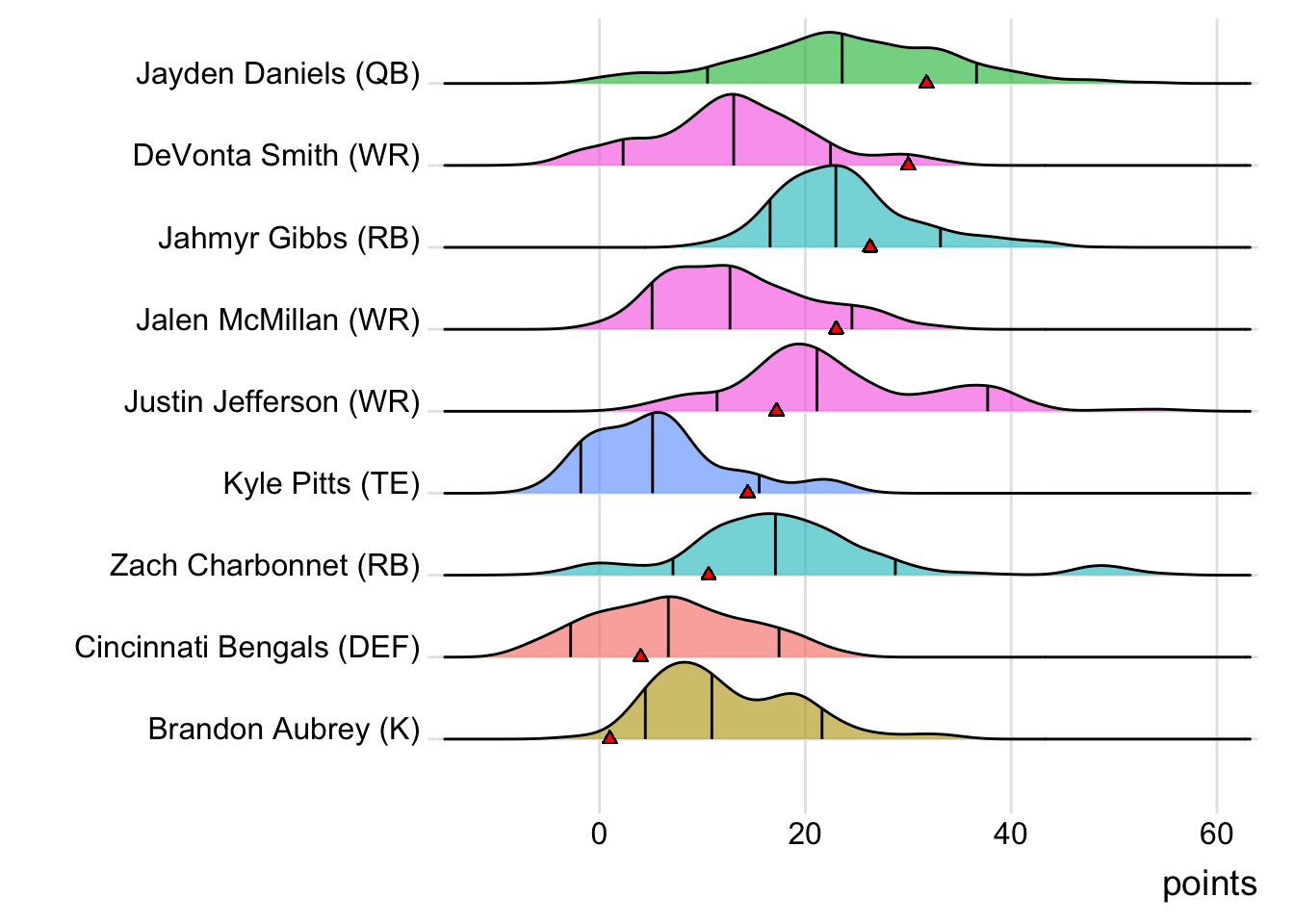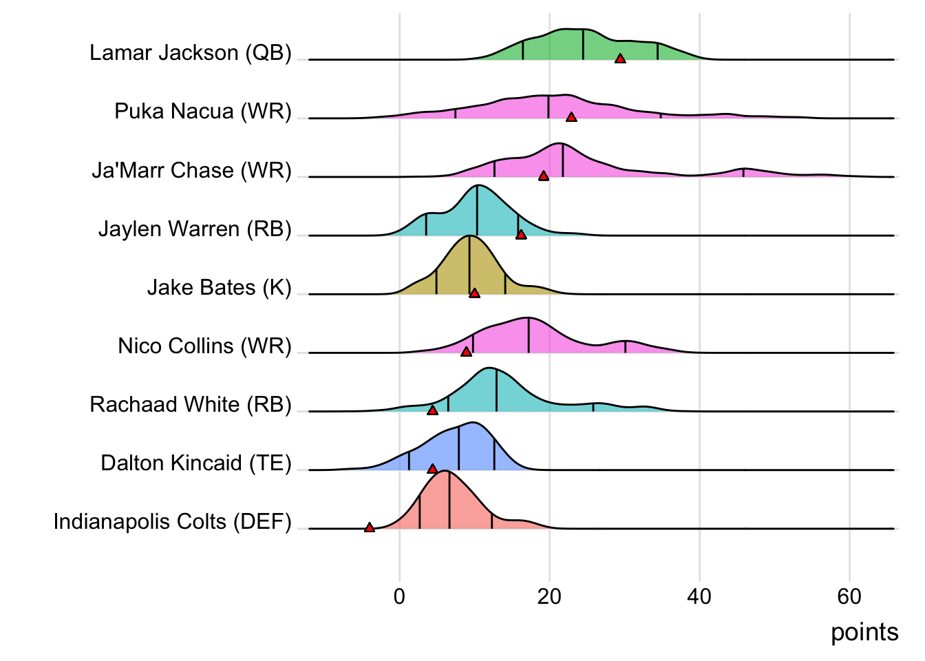 For the victorious side, a couple of players have been late-season stars : Brian Thomas Jr. and Higgins. During the playoffs, that duo has exceeded their season scoring averages by 74% and 73%, respectively. On the other hand, Indaiatuba Riders has several players heading in the opposite direction. David Njoku and Cooper Kupp have both fallen well beneath their year-to-date averages during the postseason. Amparo Bikers also had a few players who were cooling off in the playoffs, most notably Javonte Williams and Ka’imi Fairbairn. During the postseason, that combo has averaged 3.15 and 4.00 points, respectively, falling short of their season-long marks by 67% and 63%.