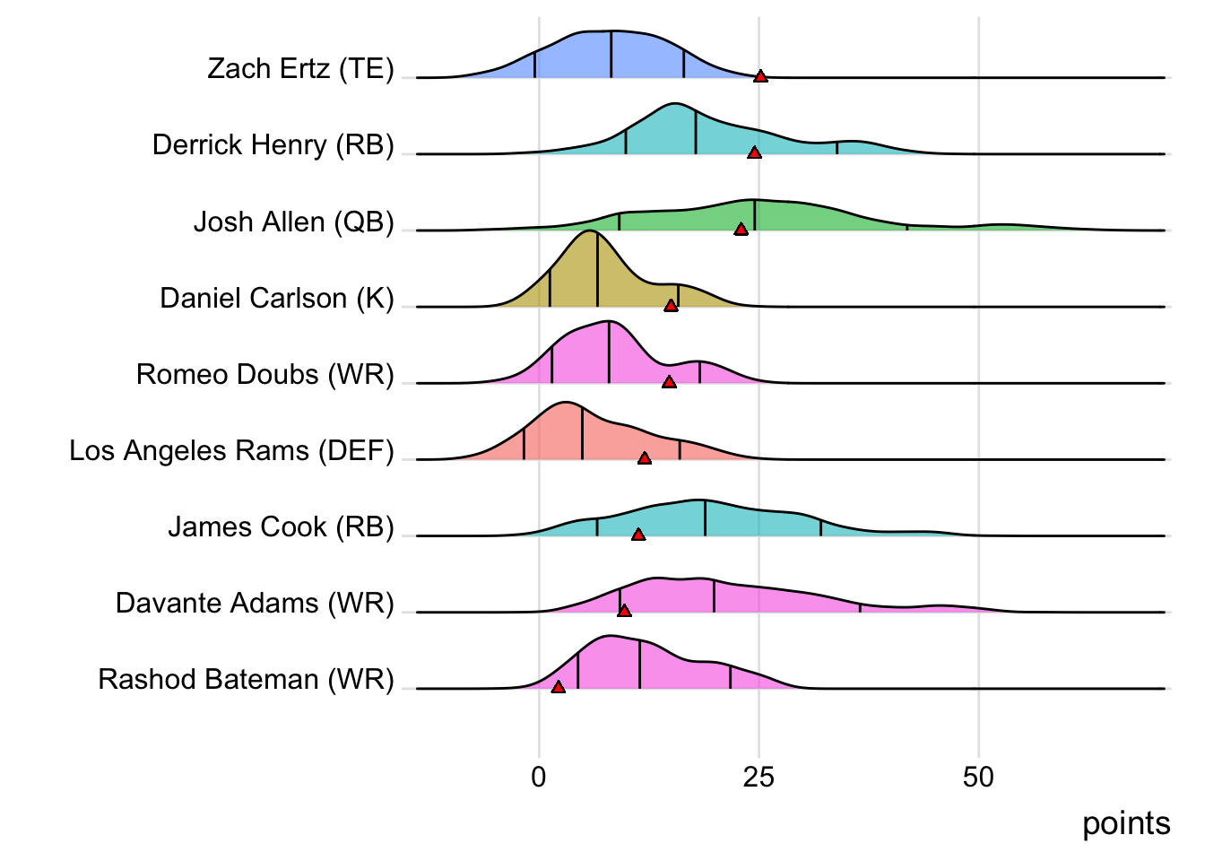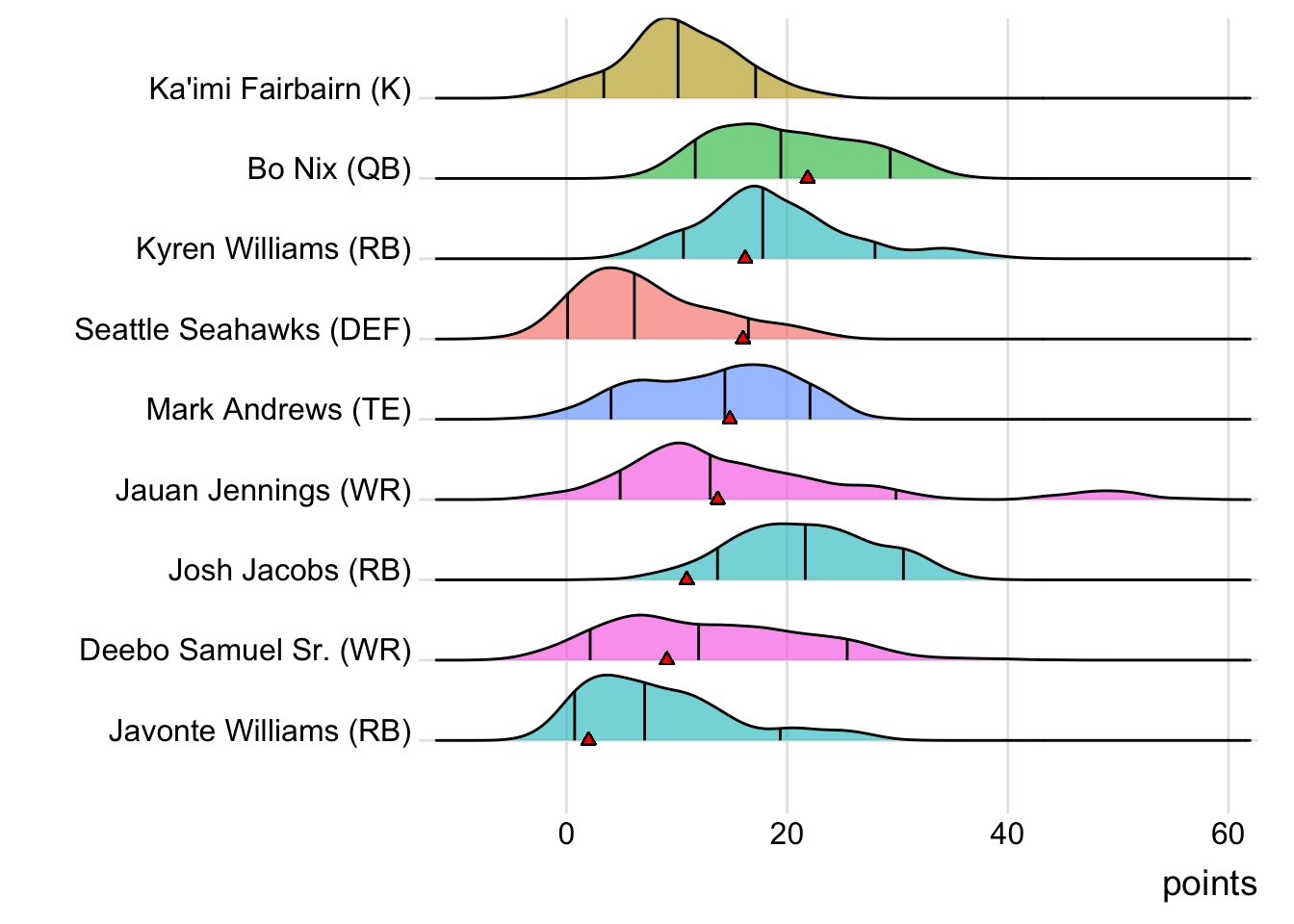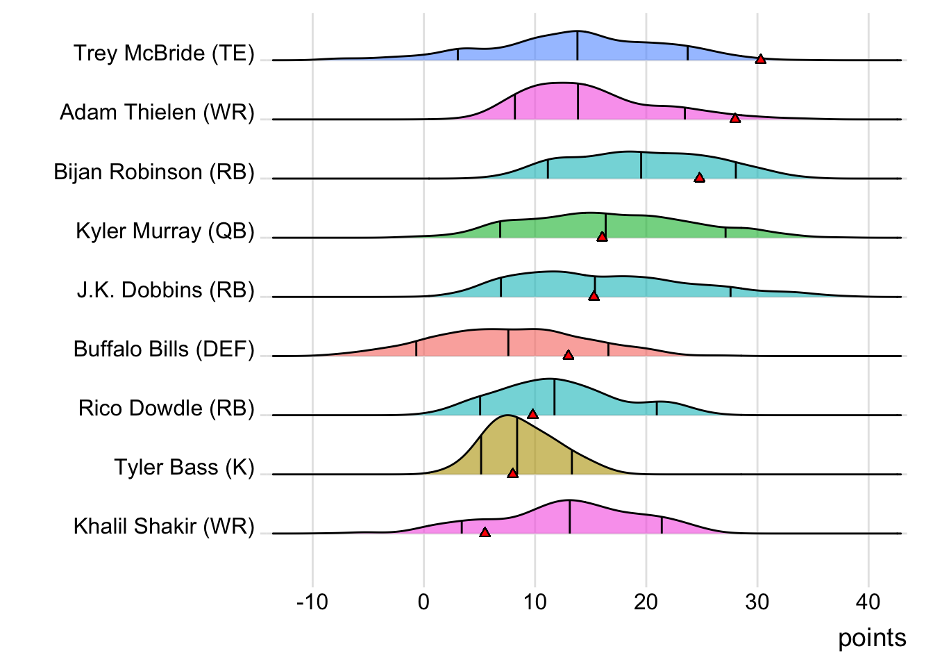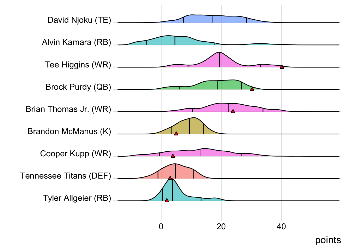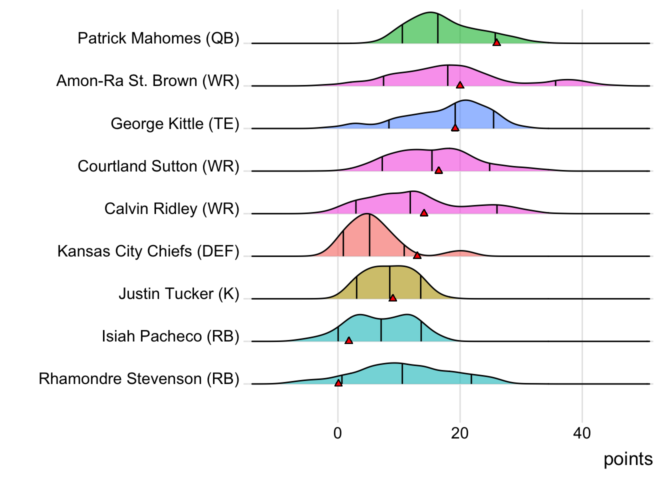 For the winning side, a pair of players have been heating up in the postseason : the Kansas City Chiefs DEF and Amon-Ra St. Brown. During the playoffs, that duo has surpassed their season scoring averages by 116% and 35%, respectively. On the other hand, Barao Butchers has a player trending in the wrong direction. Rhamondre Stevenson has substantially underperformed his year-to-date average in the postseason by 42%.