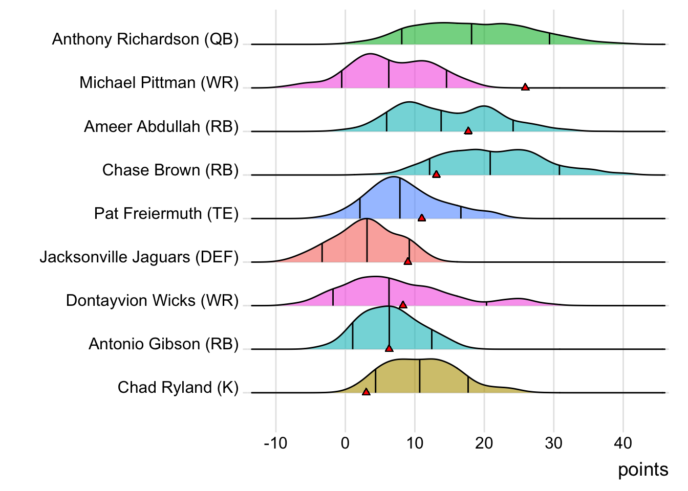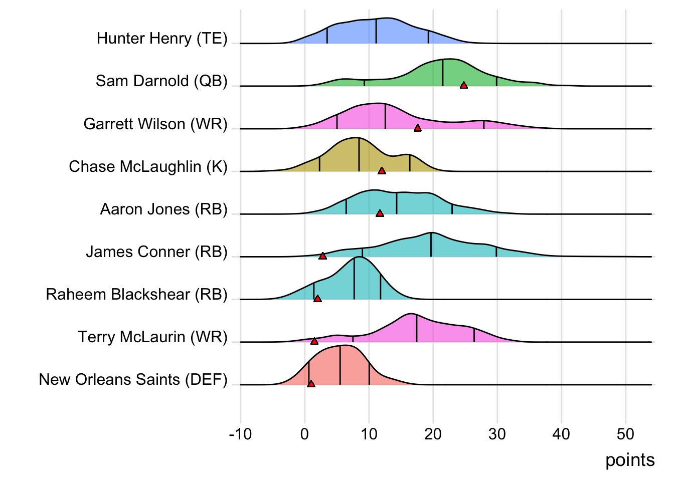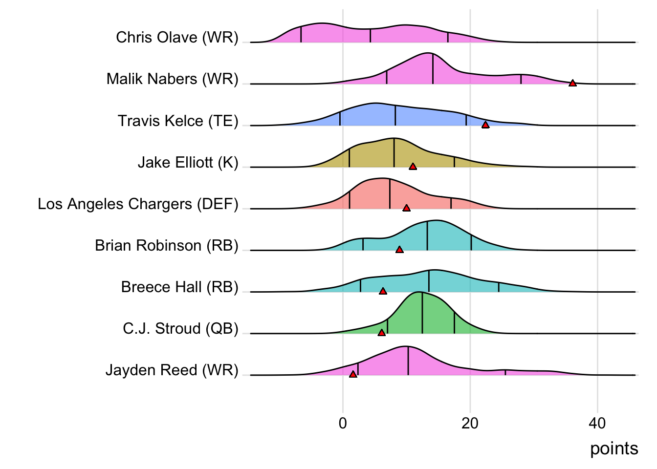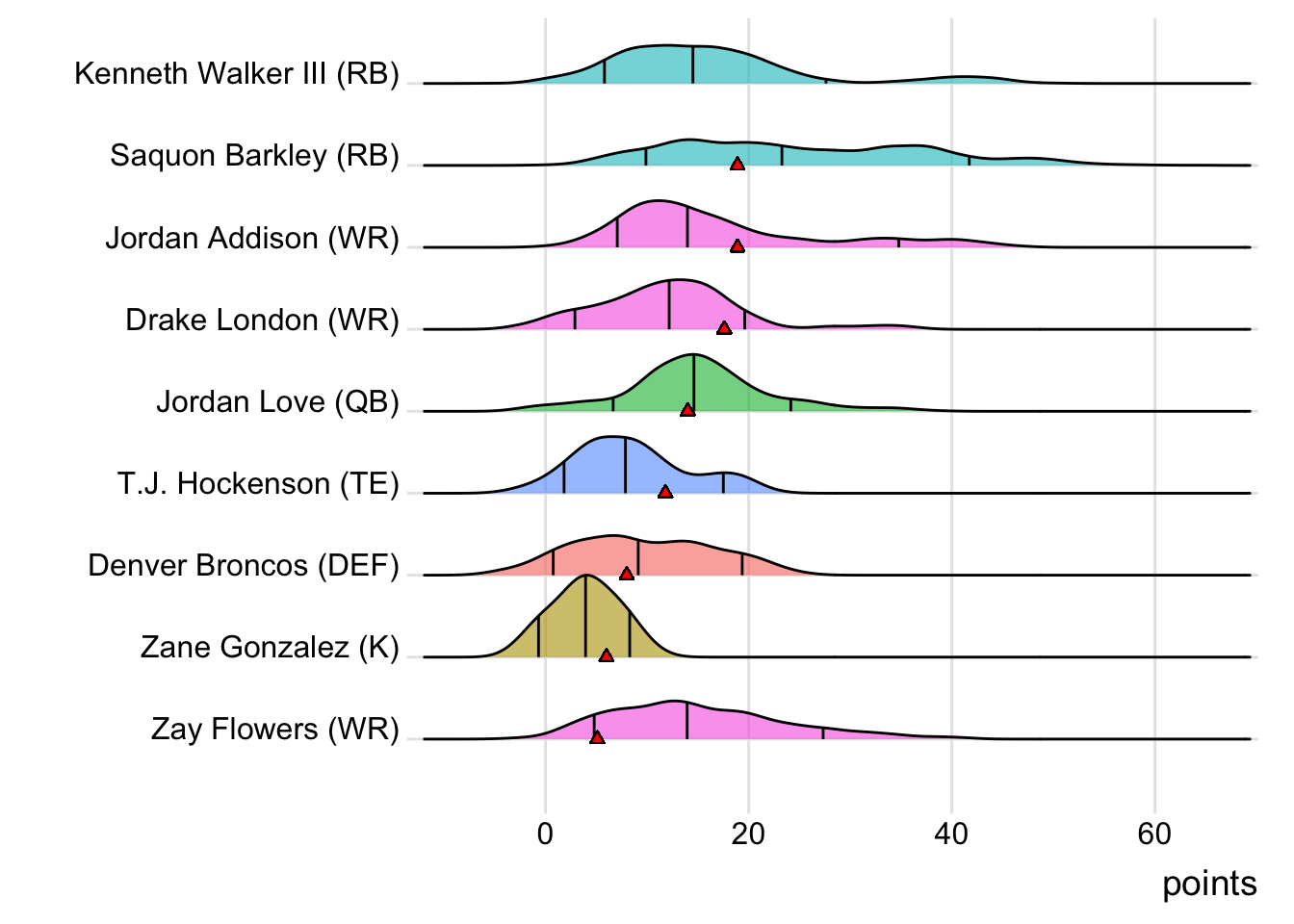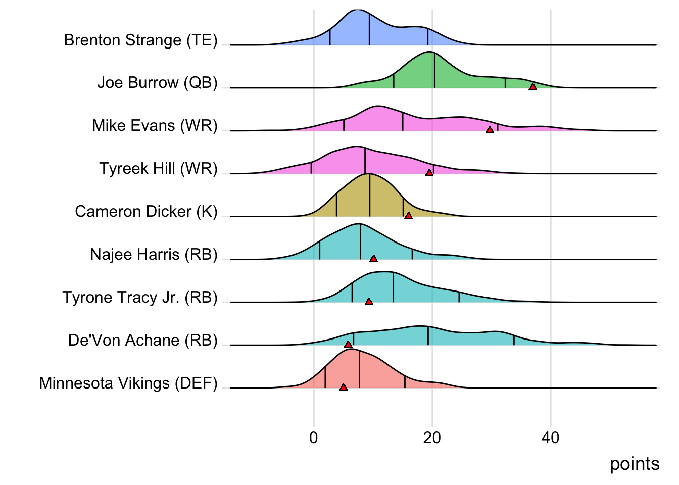 For the winning side, a pair of players have been heating up in the postseason : the Kansas City Chiefs DEF and Amon-Ra St. Brown. During the playoffs, that duo has surpassed their season scoring averages by 116% and 35%, respectively. On the other hand, Barao Butchers has a player trending in the wrong direction. Rhamondre Stevenson has substantially underperformed his year-to-date average in the postseason by 42%.
