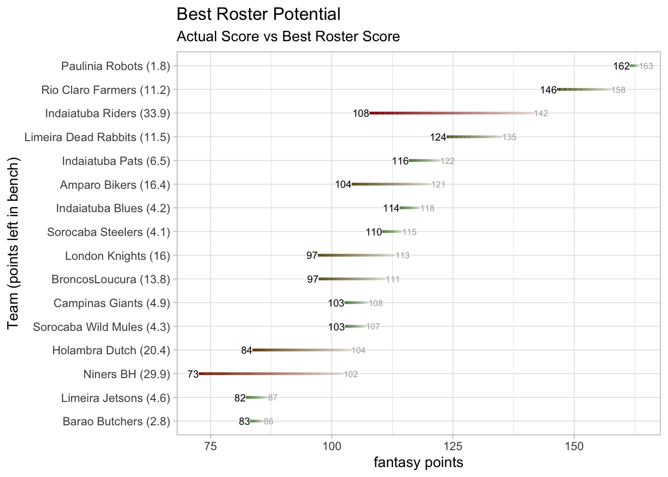 Rio Claro Farmers beat their projections by a higher percentage than anyone else in the league this week. They put up 146.44 points when they were only projected 100.69.